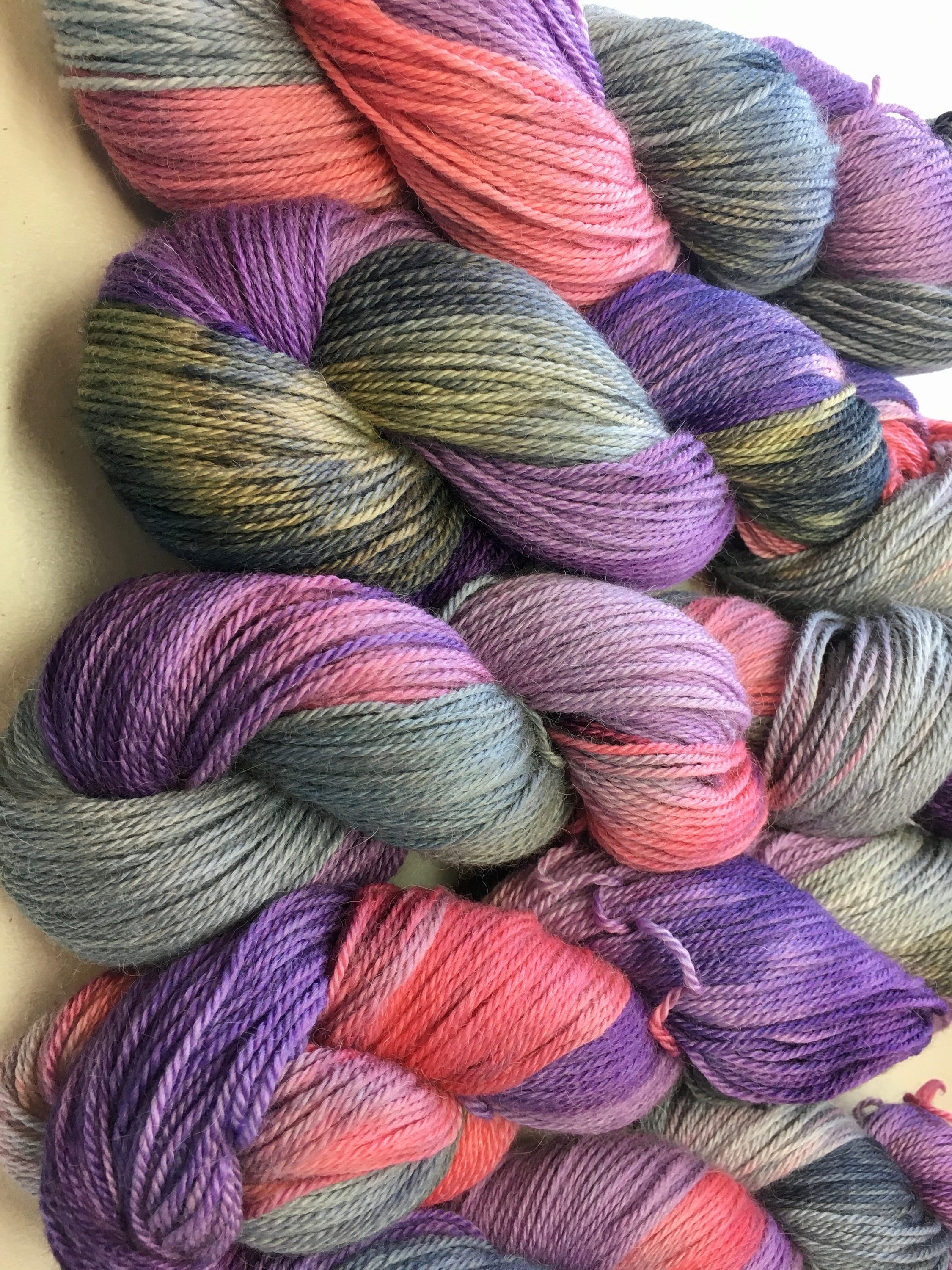 Soft as a cloud baby alpaca yarn, hand painted with purple, raspberry and gray with darker and lighter hues of each as the colors blend. Happy Morticia is ready for you to make something truly yummy with it! Each skein is 291 yards per 3.5oz. This a sport weight yarn.