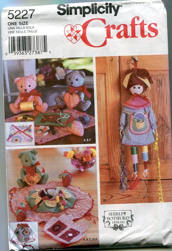 Simplicity #5227 from 2004 is a Shirley Botsford Design that makes a bear holding sewing notions, a pin cushion, a sewing kit, a needle holder, another sewing kit & a sewing doll. 28 pattern pieces.