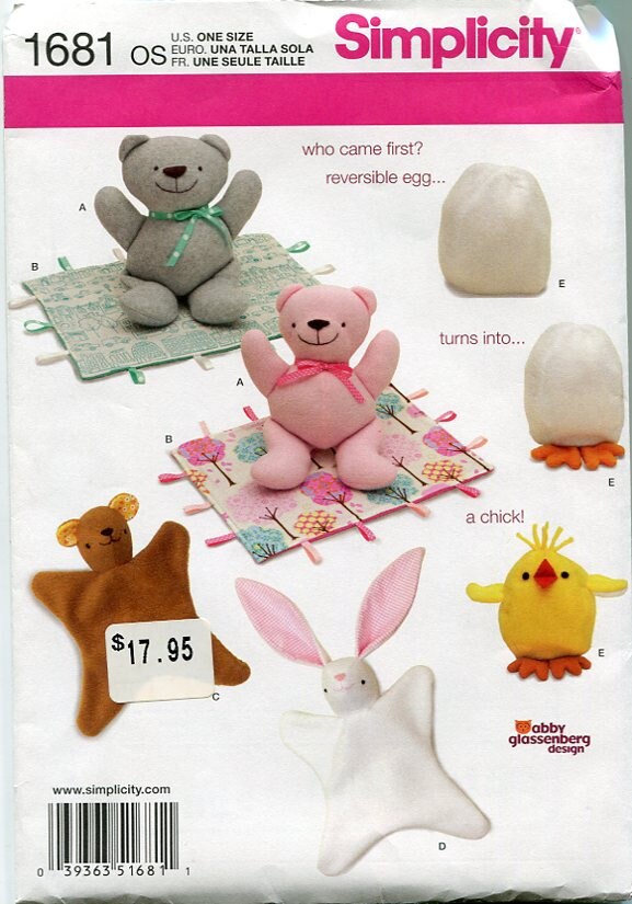 Simplicity #1681 from 2013 makes a 12.5" bear, blanket, a blanket bear & a blanket bunny & a chick that turns into an egg or an egg that turns into a chick. 22 pattern pieces. An Abby Glassenberg design.