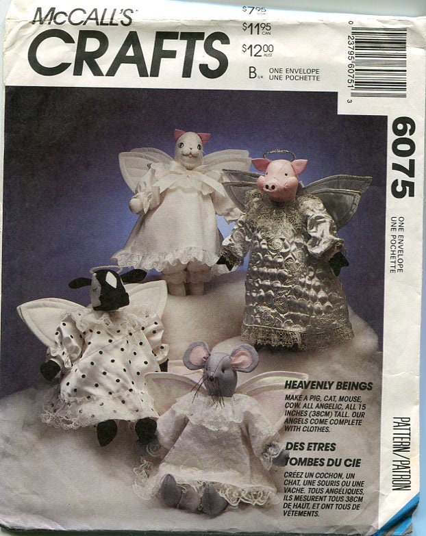 McCall's #6075 from 1992, when pigs fly...and cows and cats and mice...well, they ARE angels. Cute stuffed critters, all about 15" tall. There are 40 pattern pieces. Since this pattern is 30 years old the envelope is showing it's age with yellowing on the back. Pattern pieced & instructions are intact. It's an oldie but a goodie.