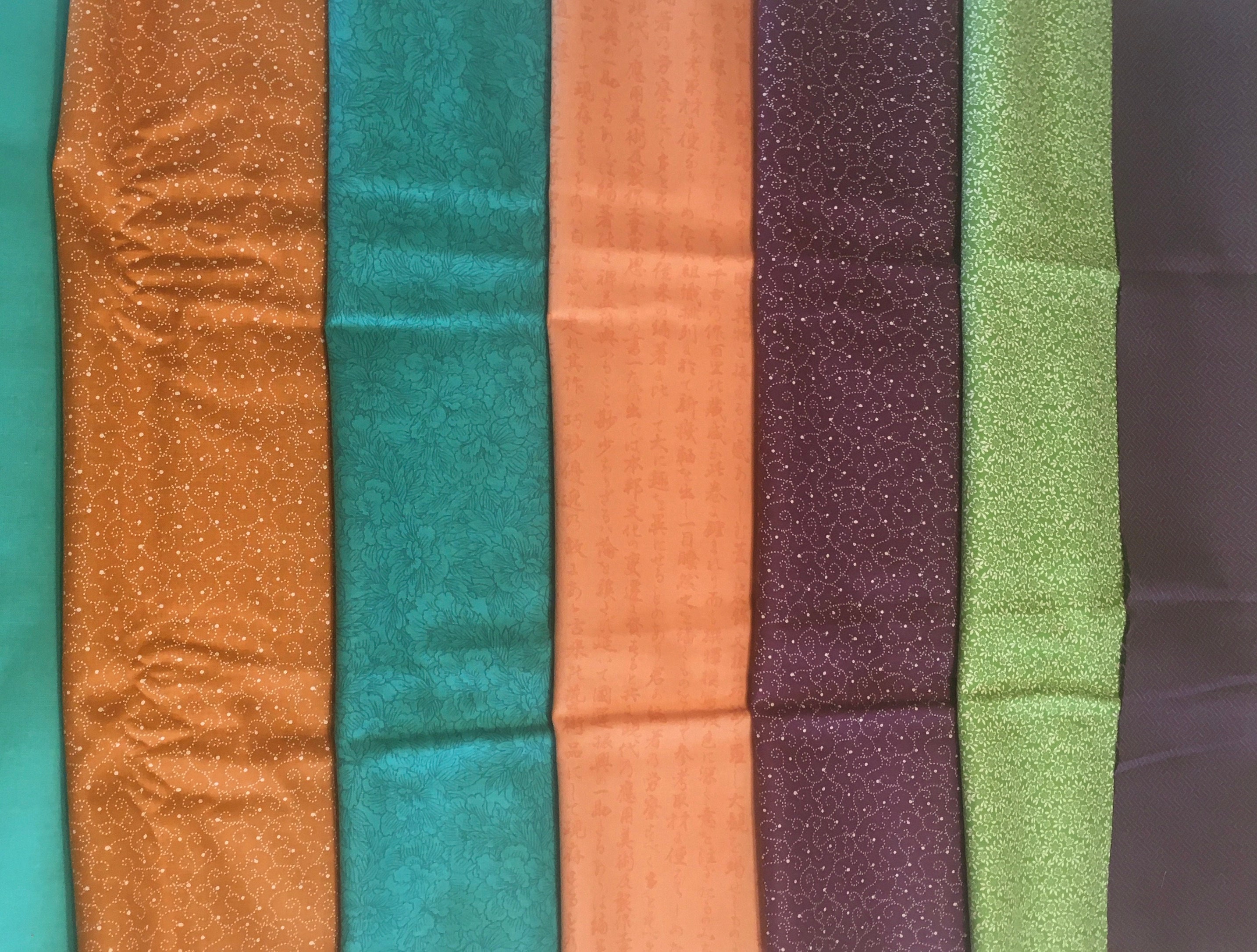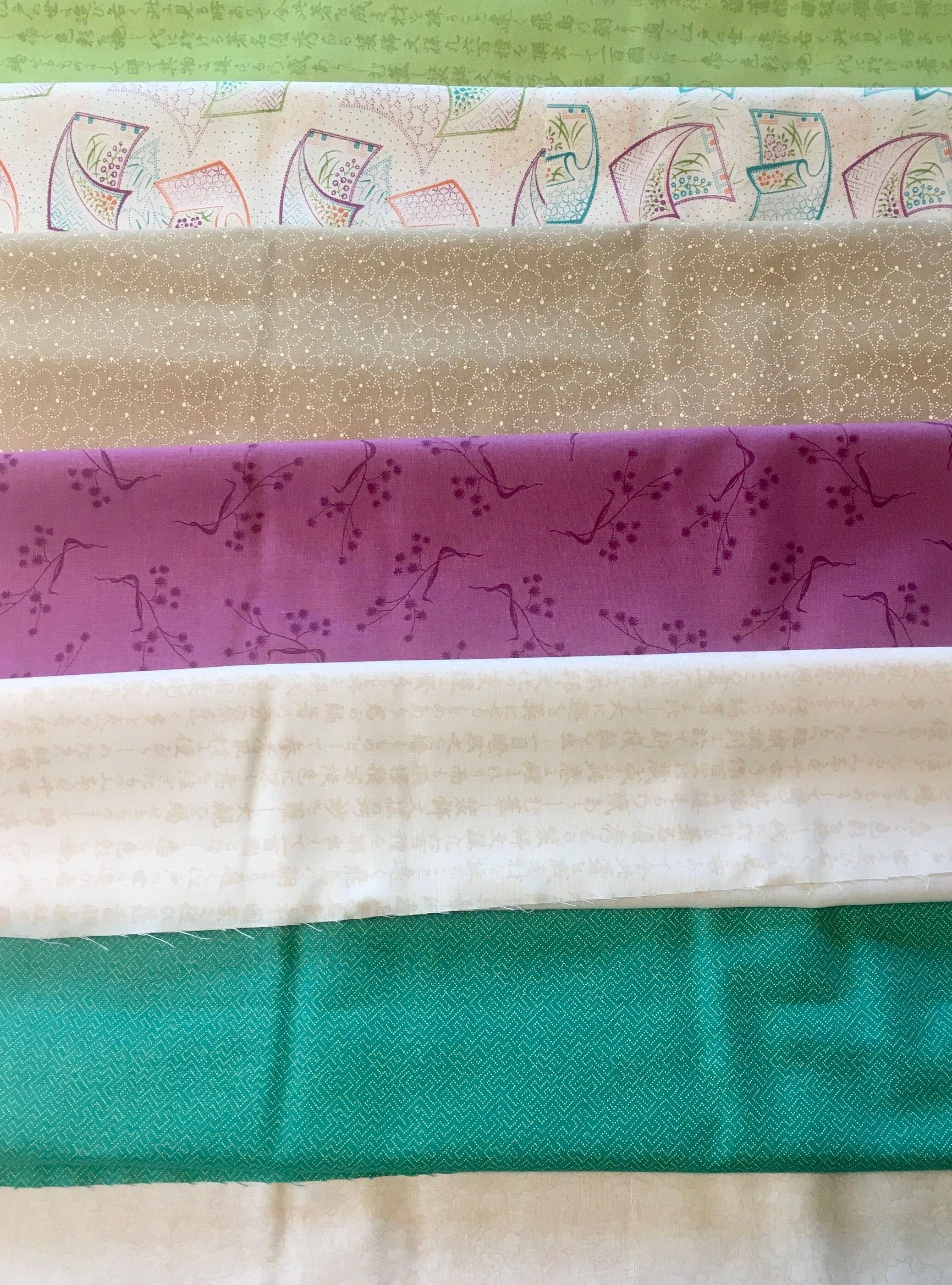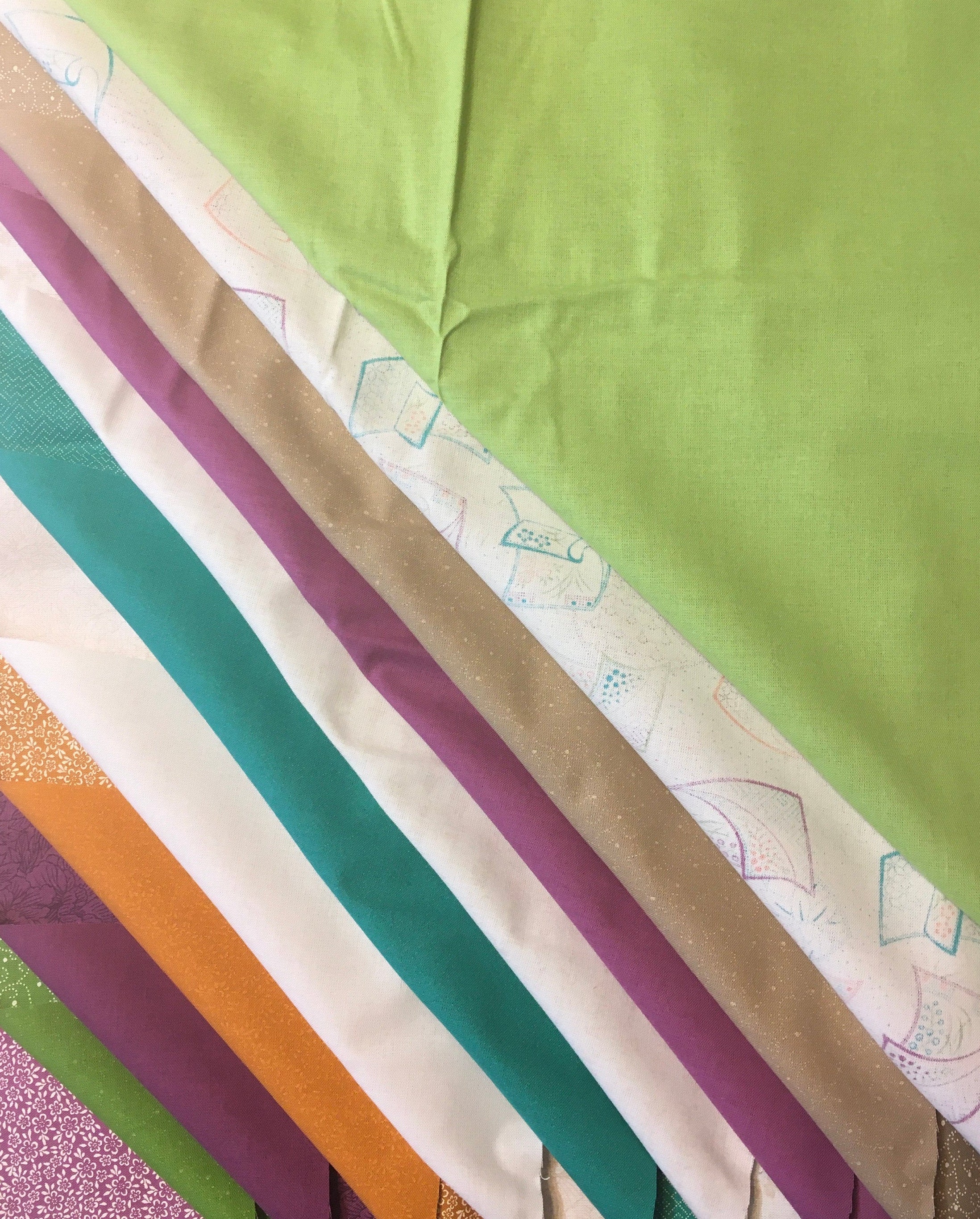 This is long out of supply and the colors are retro. The 19 FQ colors are: Flowing Silks, Multi; Full Bloom, Multi; Kangi, Lt. Mandarin; Breezy, Lt. Lagoon; Lotus, Plum; Kangi, Lt. Sour Apple; Lotus, Lagoon; Breezy, Lt. Plum; Lotus, Mandarin; Lotus, Rice; Kangi, Rice; Paper Texture, Lagoon; Paper Texture, Dk. Plum; Kimono Print, Dk. Plum; Kimono Print, Dk. Sour Apple; Kimono Print, Mandarin; Plum Blossoms, Mandarin; Plum Blossoms, Lt. Plum; and Plum Blossoms, Lt. Sour Apple.