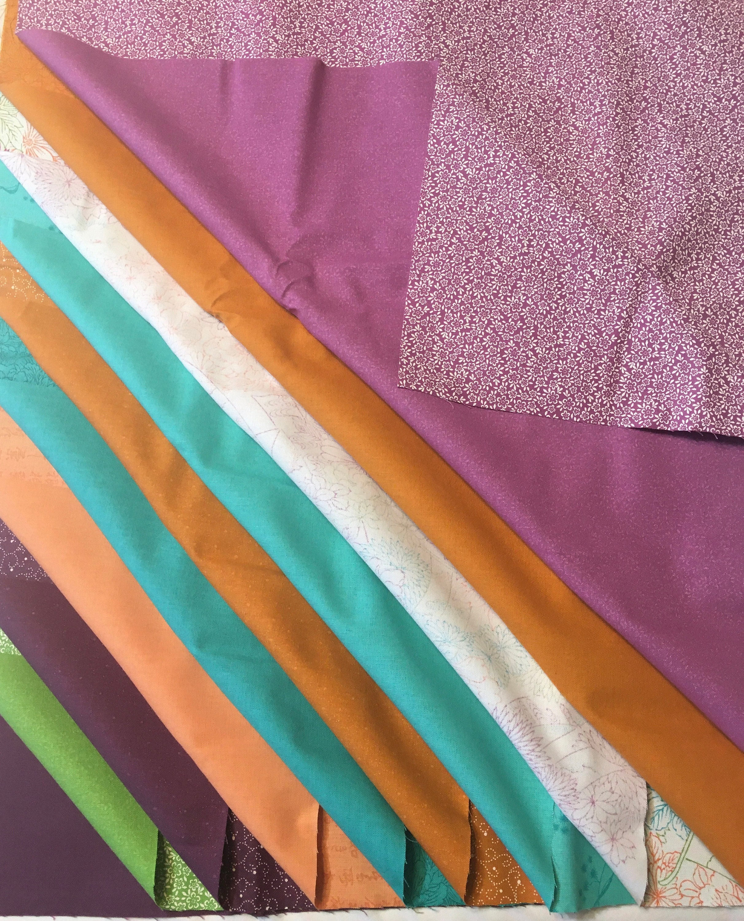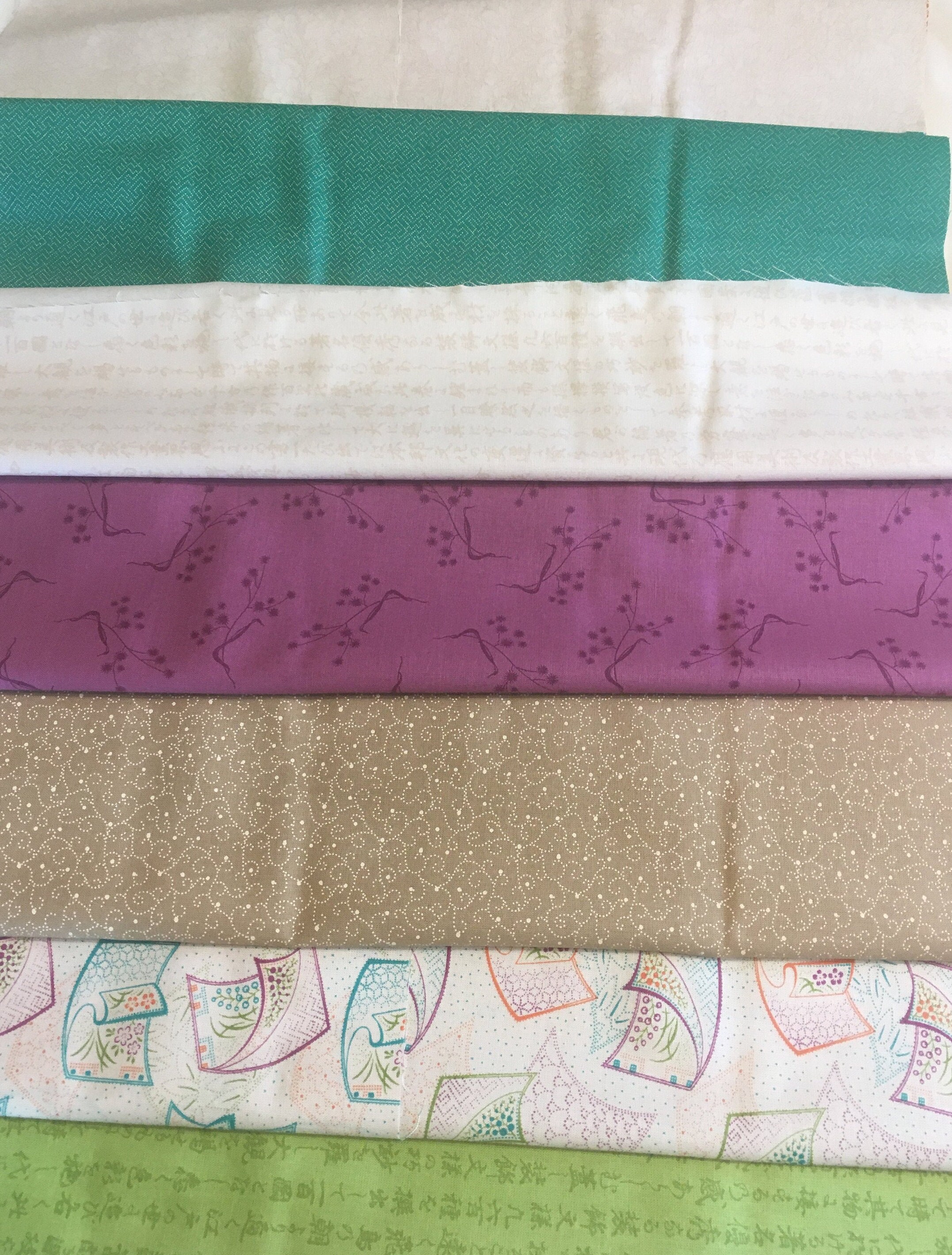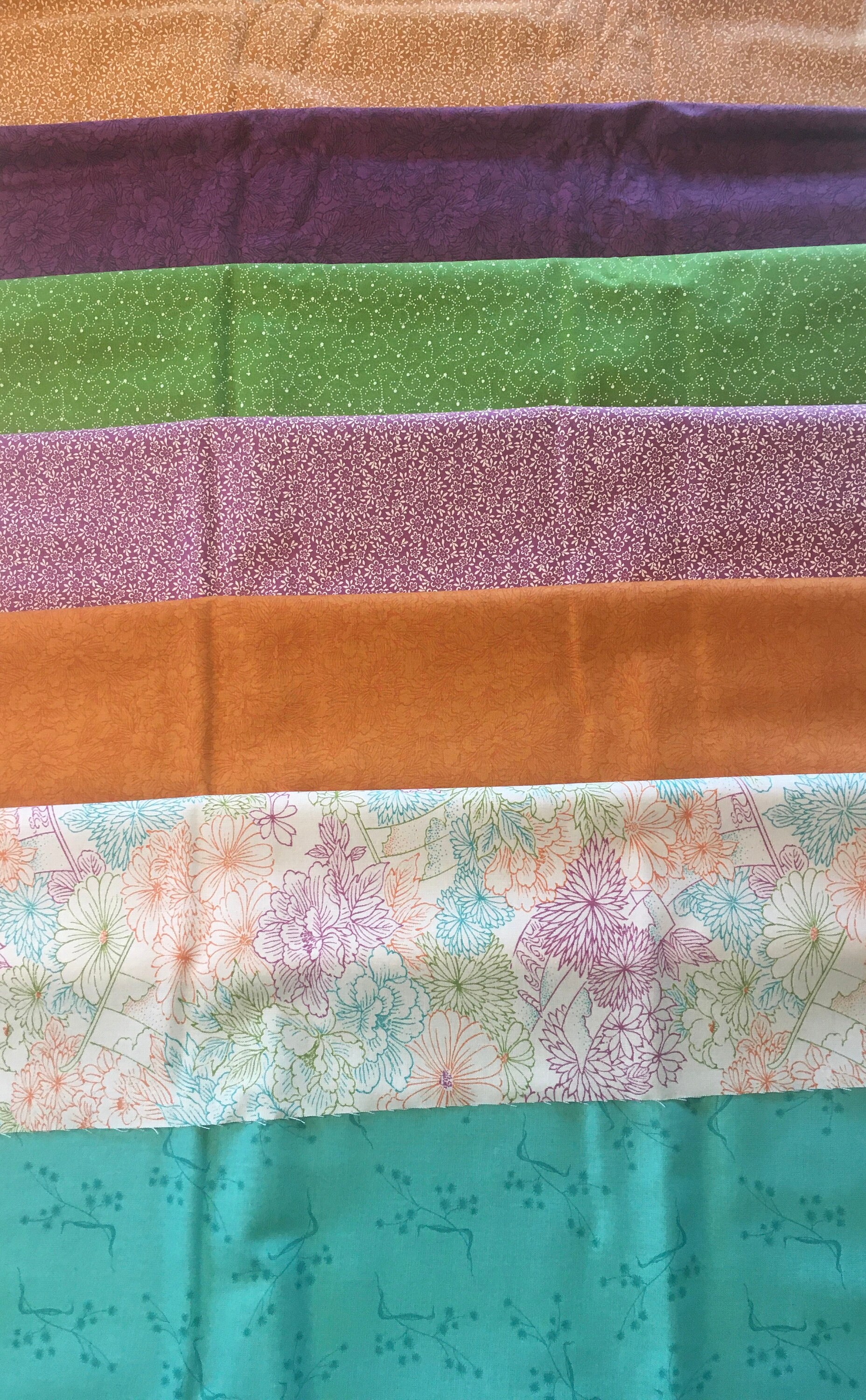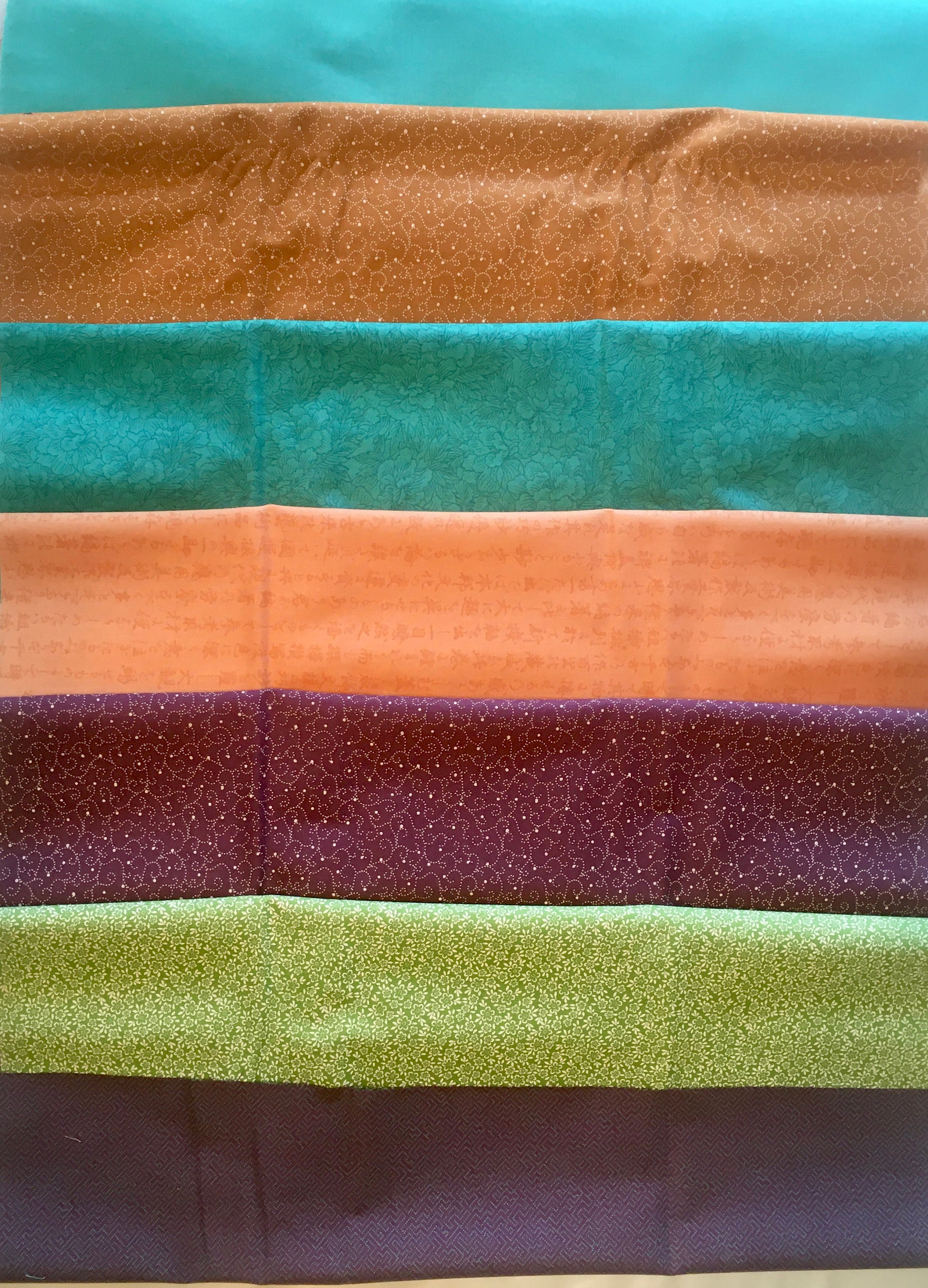 This is long out of supply and the colors are retro. The 19 FQ colors are: Flowing Silks, Multi; Full Bloom, Multi; Kangi, Lt. Mandarin; Breezy, Lt. Lagoon; Lotus, Plum; Kangi, Lt. Sour Apple; Lotus, Lagoon; Breezy, Lt. Plum; Lotus, Mandarin; Lotus, Rice; Kangi, Rice; Paper Texture, Lagoon; Paper Texture, Dk. Plum; Kimono Print, Dk. Plum; Kimono Print, Dk. Sour Apple; Kimono Print, Mandarin; Plum Blossoms, Mandarin; Plum Blossoms, Lt. Plum; and Plum Blossoms, Lt. Sour Apple.