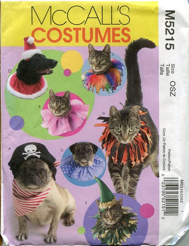 McCalls 5215 from 2006 for dogs & cats, hats & collars for quick celebration style. XS to L, collars sized to neck. 10 pattern pieces, instruction pages show some age discoloration on edges.