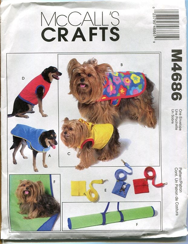 McCalls 4686 From 2004, 15 pattern pieces, this has XS-11", S-16", M-21" & L26" all in one envelope, size is measured from base of neck to base of tail. Instruction pages show some age discoloration on the edges. It makes 4 coats (A, B, C, D) in all four sizes, leash with detachable pouch and a mat...for yoga???