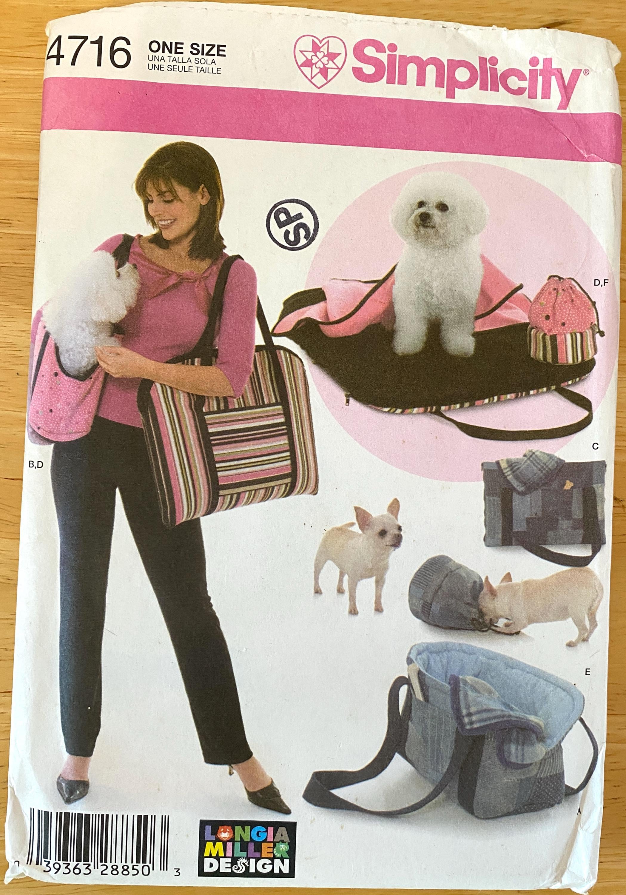 Simplicity 4716: By Longia Miller Design, 14 pieces make two bags for carrying small dog and/or dog supplies, two carry beds and two treat bags. From 2004, long out of print & hard to find. One size.