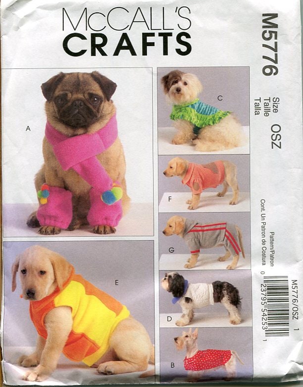 McCalls 5776 from 2008, 27 pattern pieces for dogs Small to X-Large, Six coats, Scarf & leg warmers. Cute as can be, I love the leg warmers...envelope & pattern instruction pages show some age discoloration.