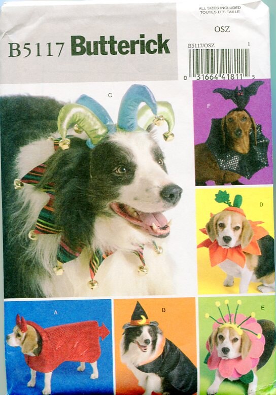 Butterick 5117 Get your pup all dressed up! A jester with belled collar & hat; a spooky bat collar with a bat hat; a pumpkin; a flower; a wizard and a devil...with an adorable tail.