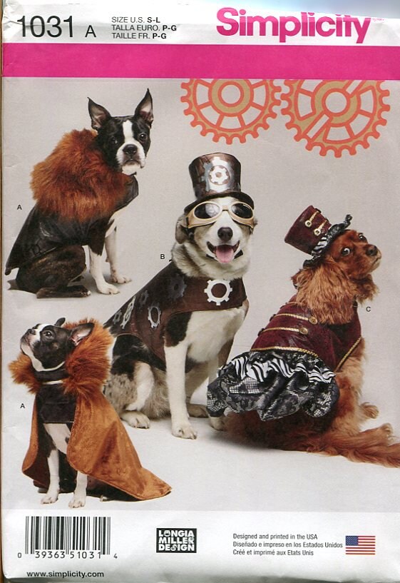 Simplicity 1031, 15 pattern pieces for dogs Small, Medium & Large. Three coats, two hats & a cape...every dog wants a cape. Fabric suggestions are all over the board, brocade, leather-like, satin suede wool, nylon. This is a great Cosplay costume for dogs designed by Longia Miller Design for Simplicity. I see no mention of the aviator glasses so I guess they were the dog's personal property.