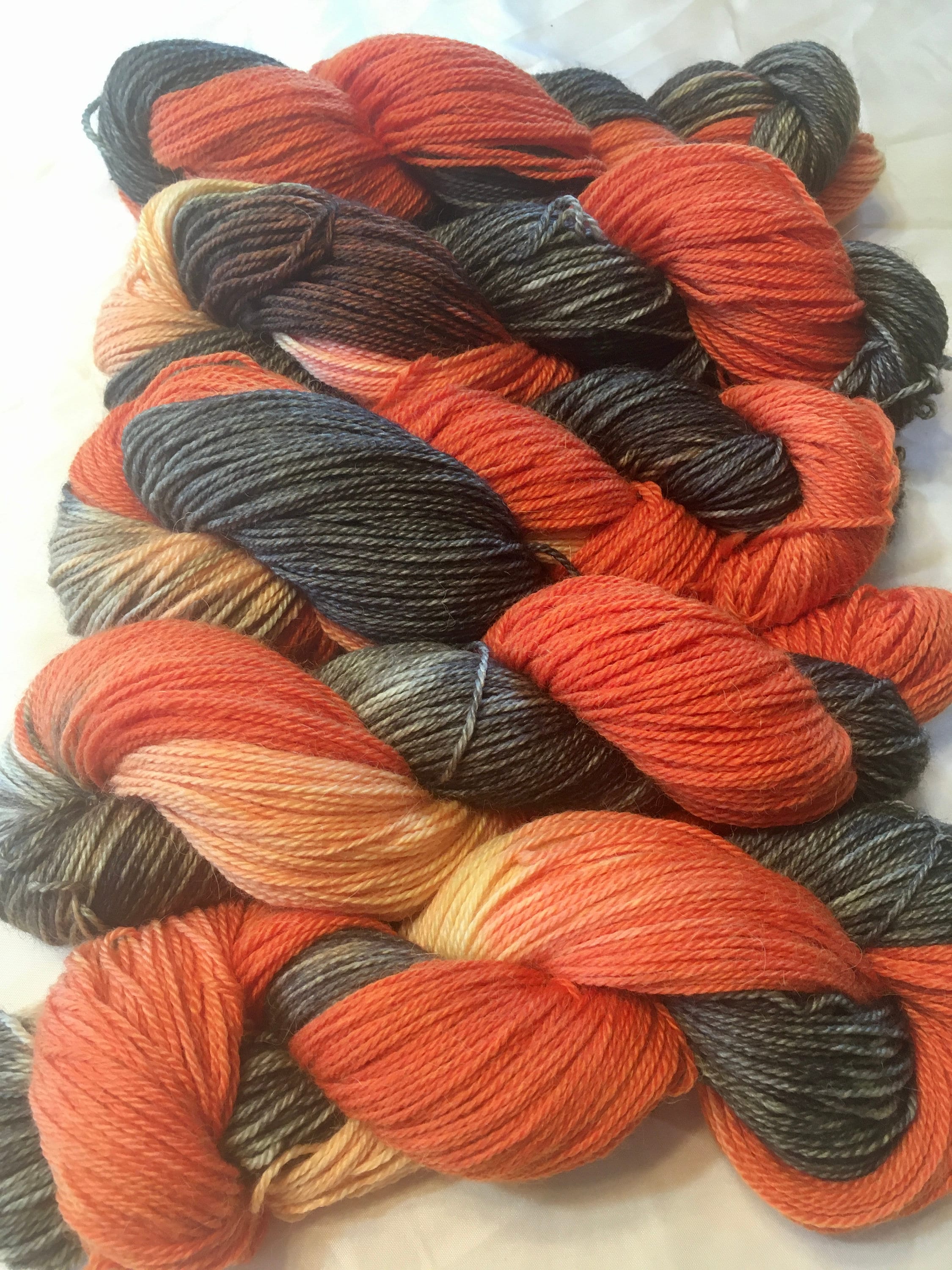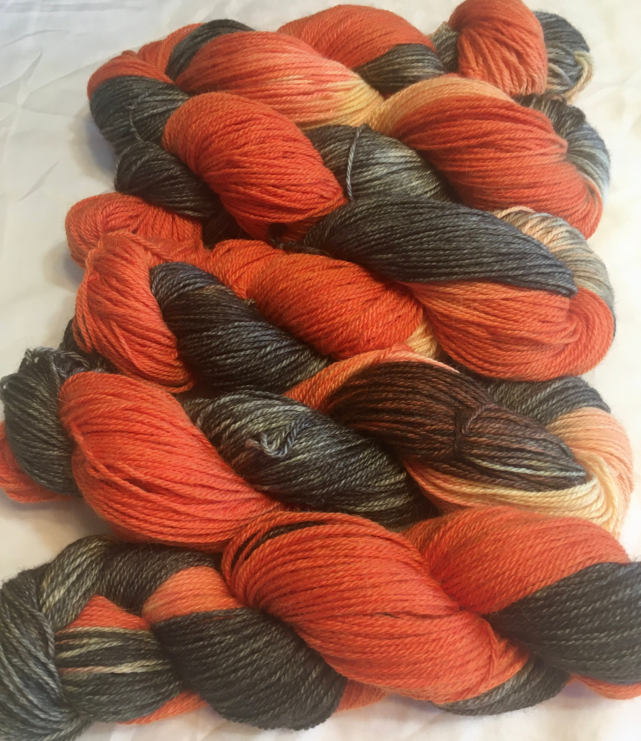 Soft as a cloud baby alpaca yarn, hand painted with Halloween colors: black, charcoal, gray, orange, yellow & cream and ready for you to make something truly yummy with it! Each skein is 291 yards per 3.5oz. This a sport weight yarn.