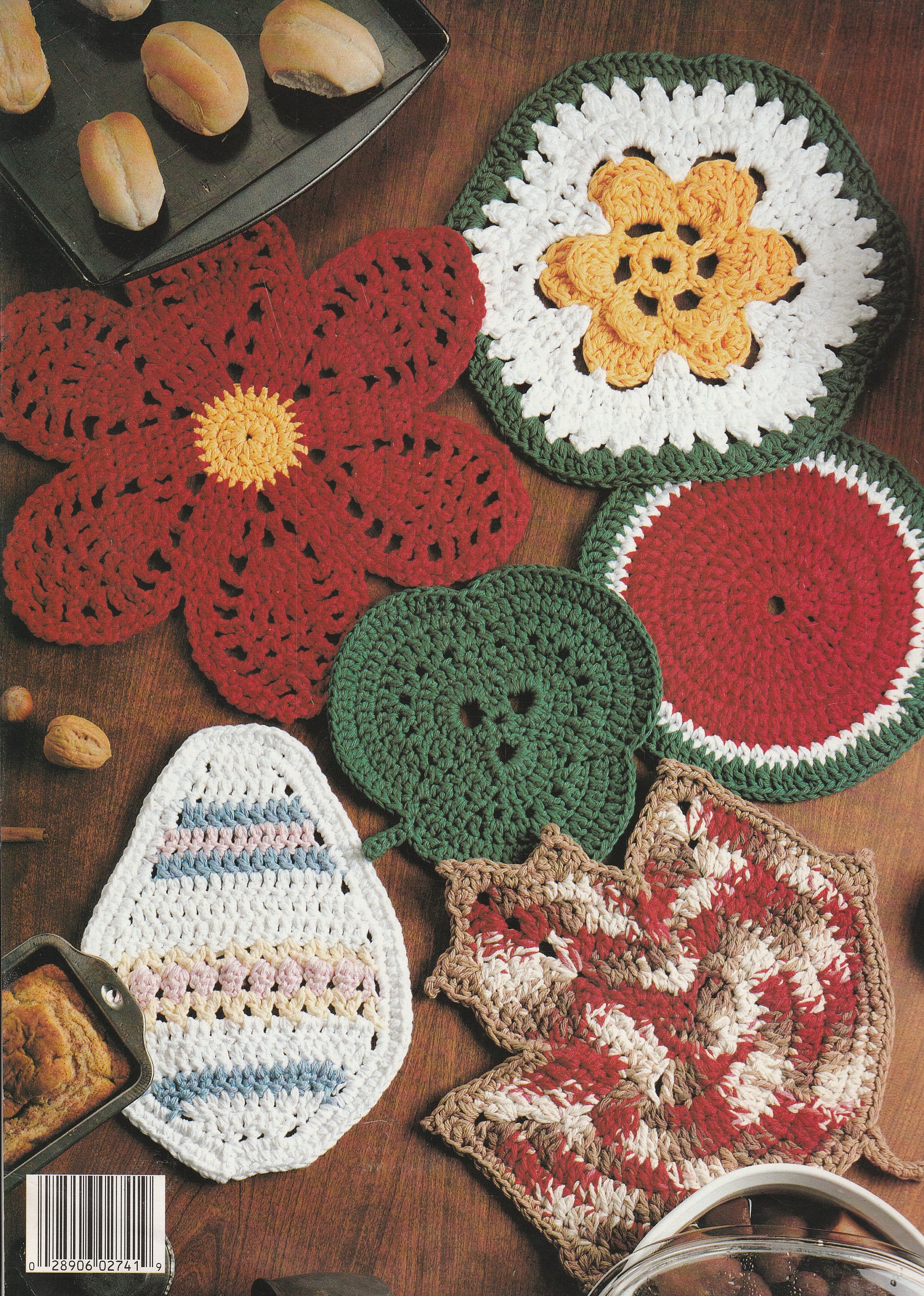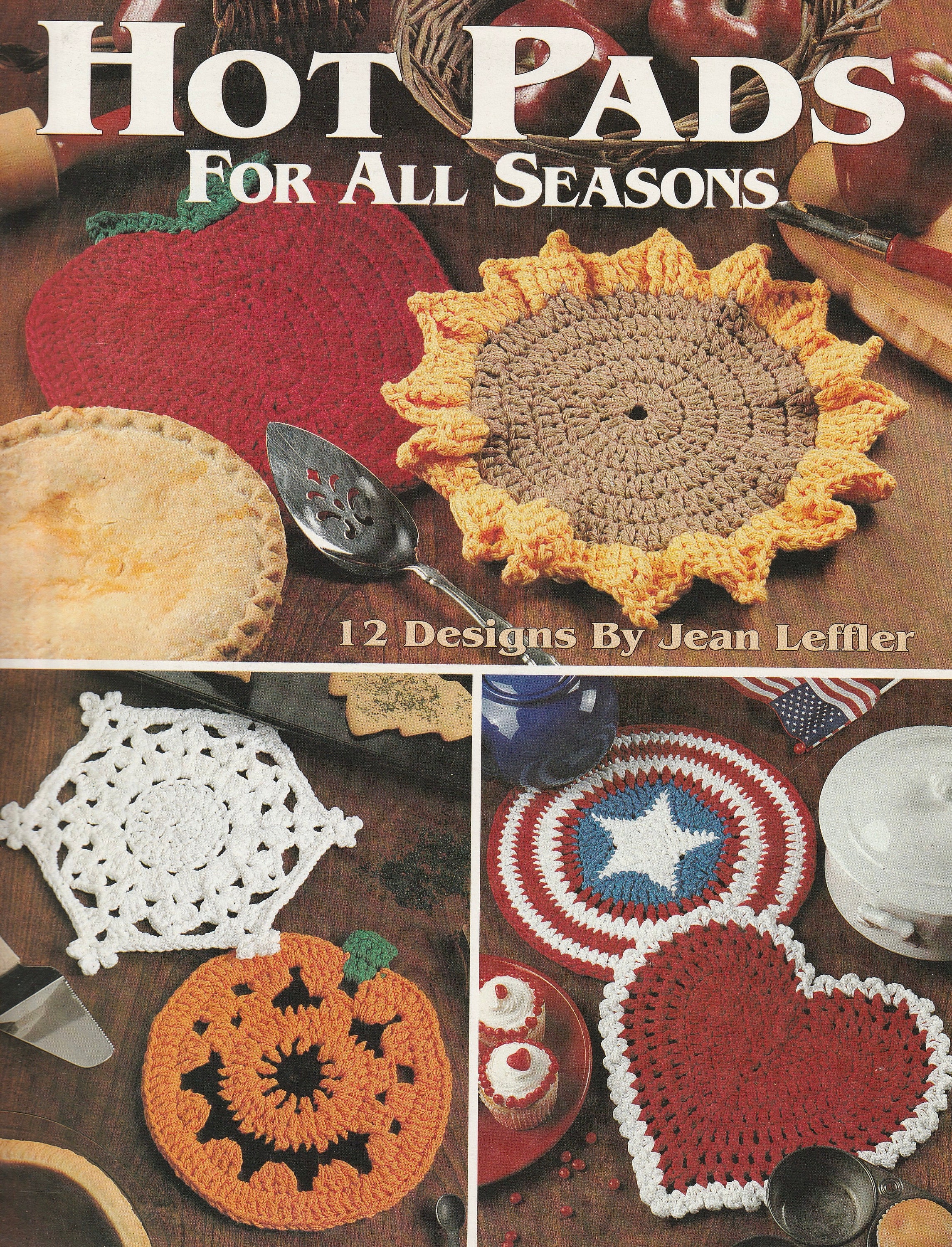 Contains patterns for 12 different hot pads: Snowflake for January, Heart for February, Shamrock for March, Easter egg for April, Posy for May, Watermelon for June, Stars and Stripes for July, Sunflower for August, Apple for September, Jack-o-Lantern for October, Leaf for November & Poinsettia for December.