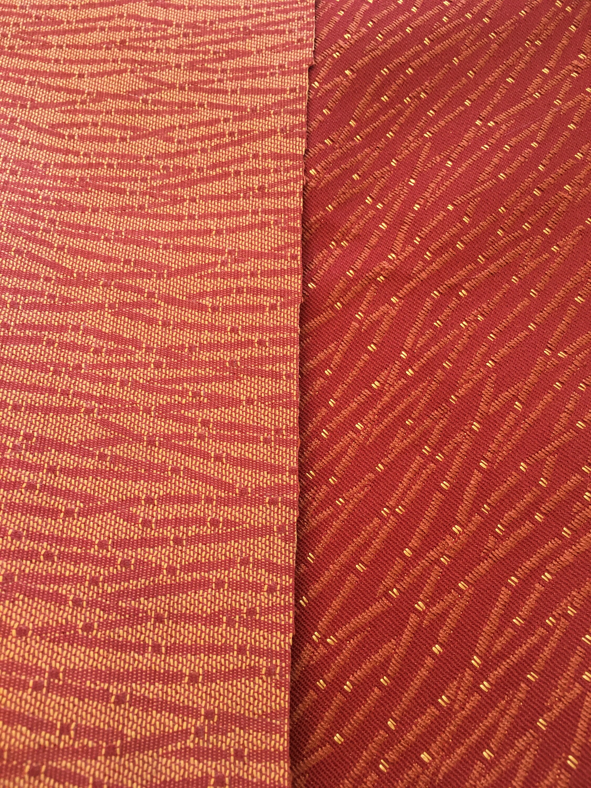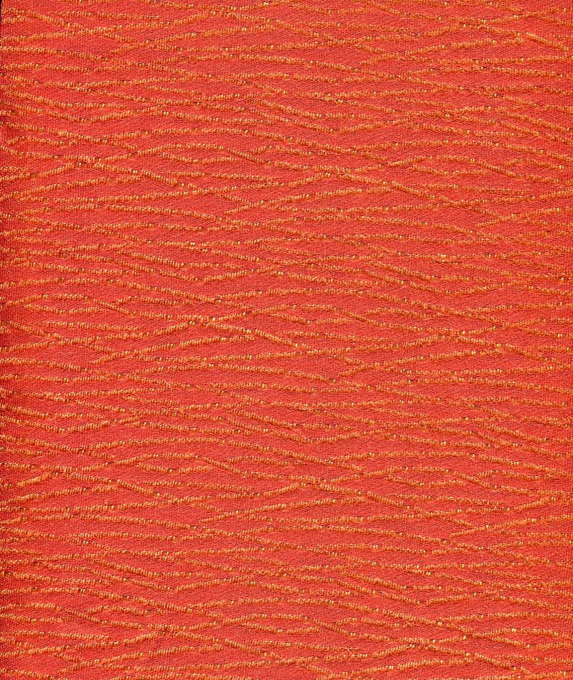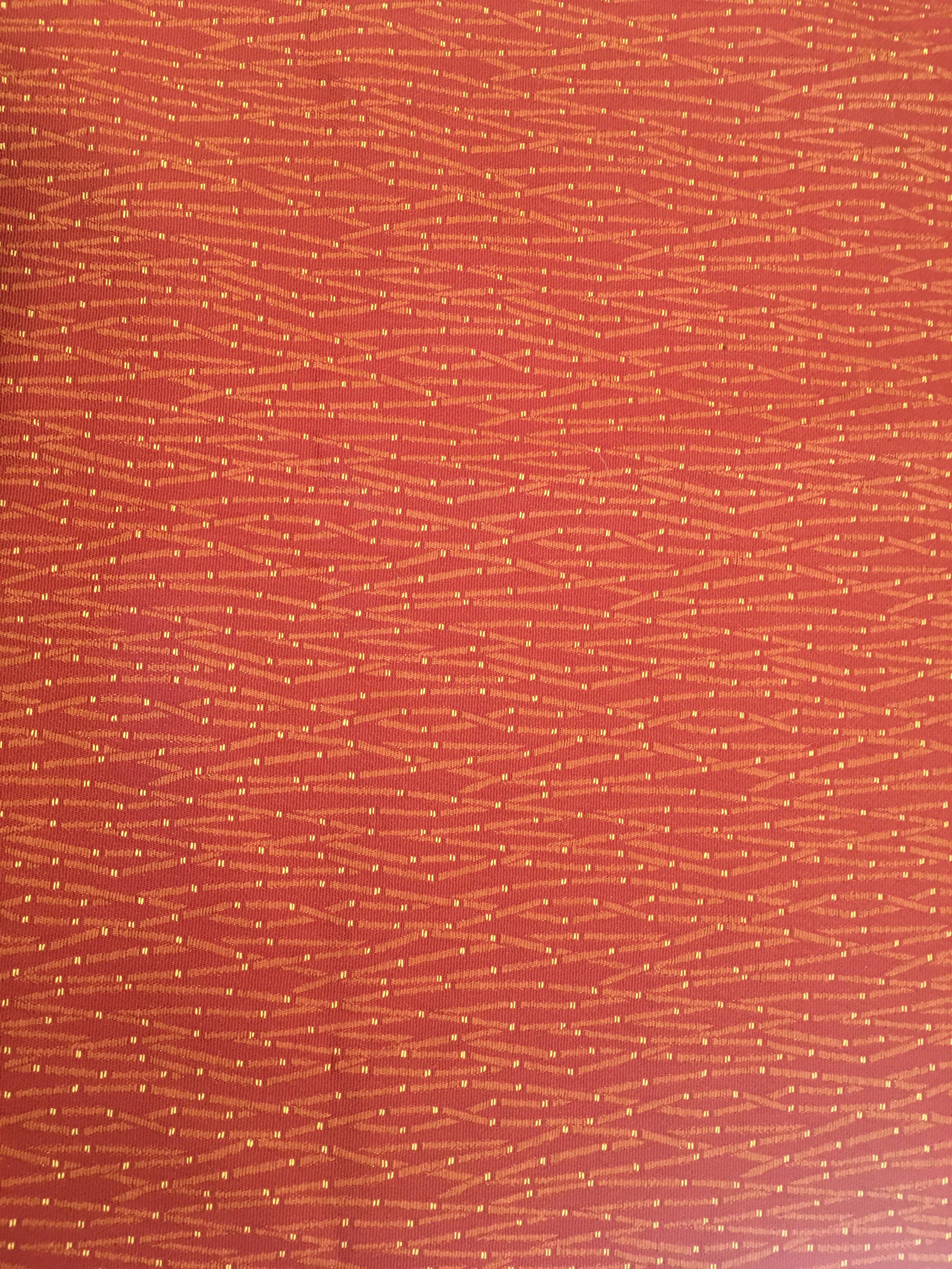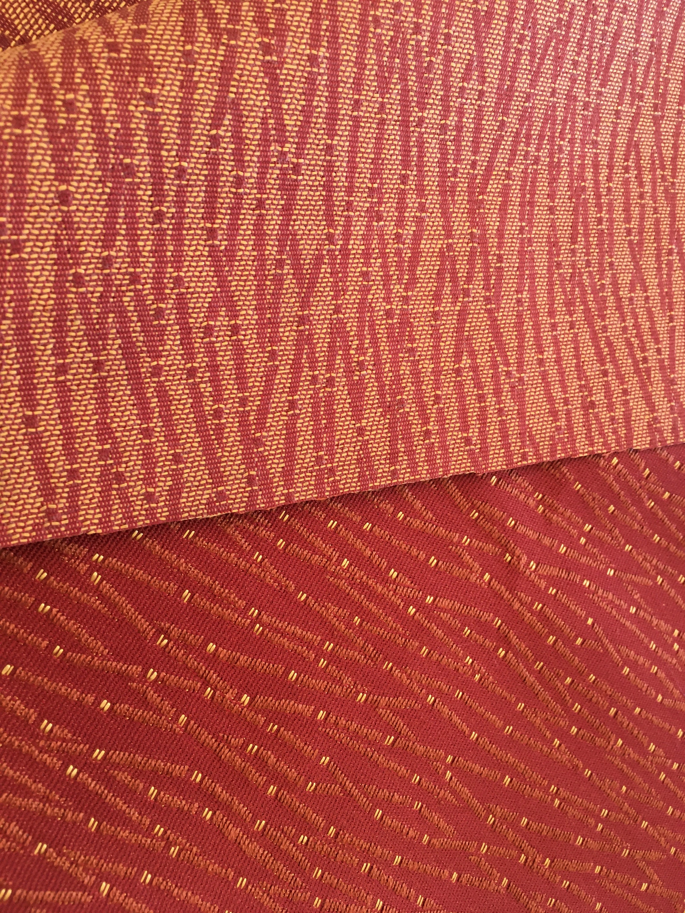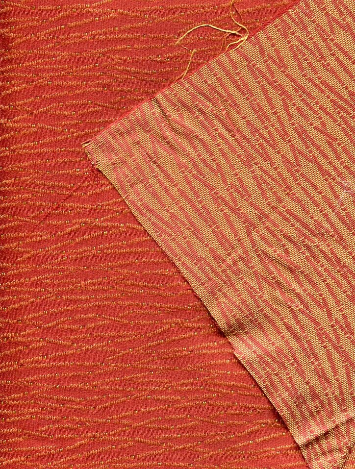 The background is Terra Cotta with some angled designs highlighted with gold. As you can see on the back this is totally woven, not a printed design. Hard to find this quality today.