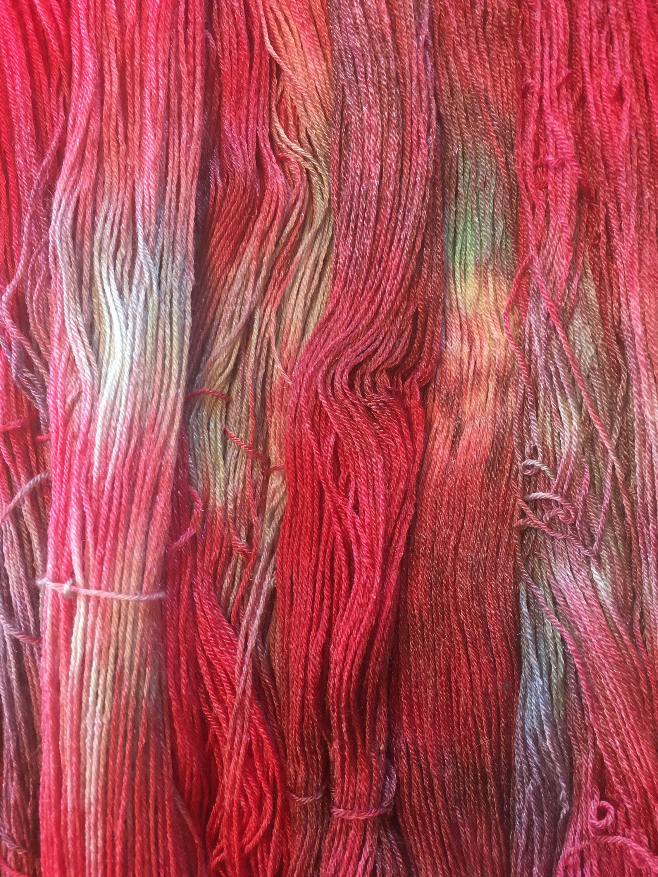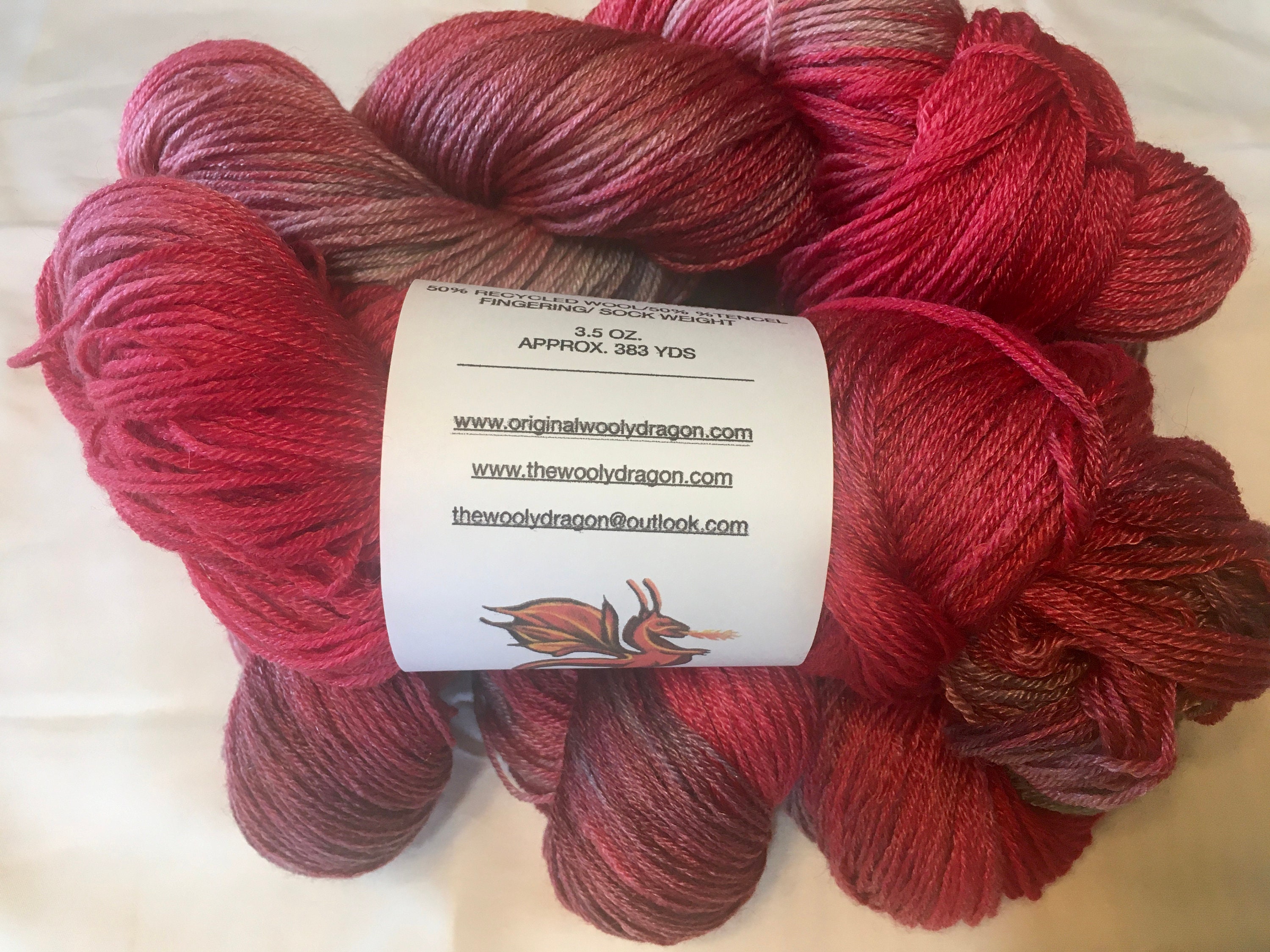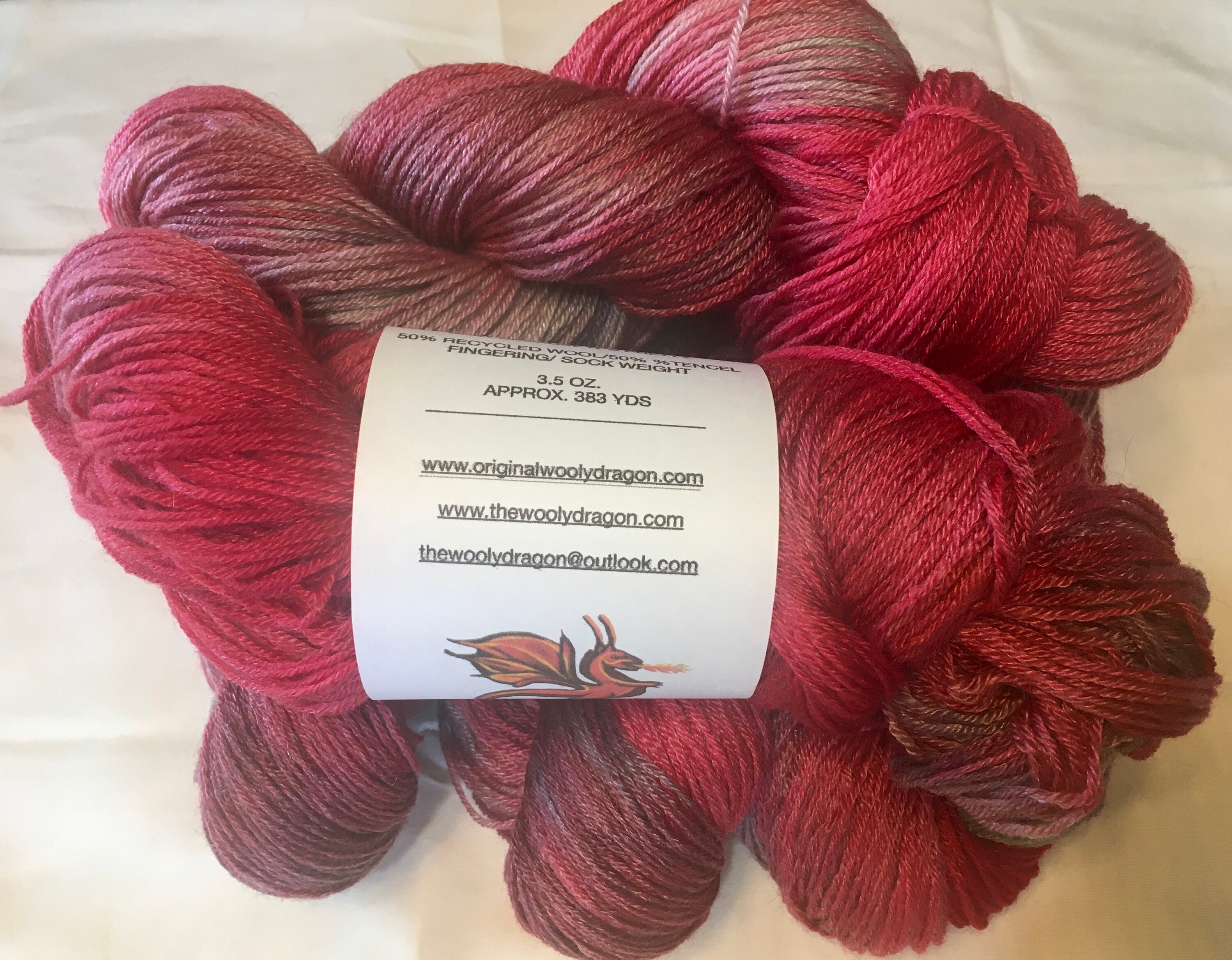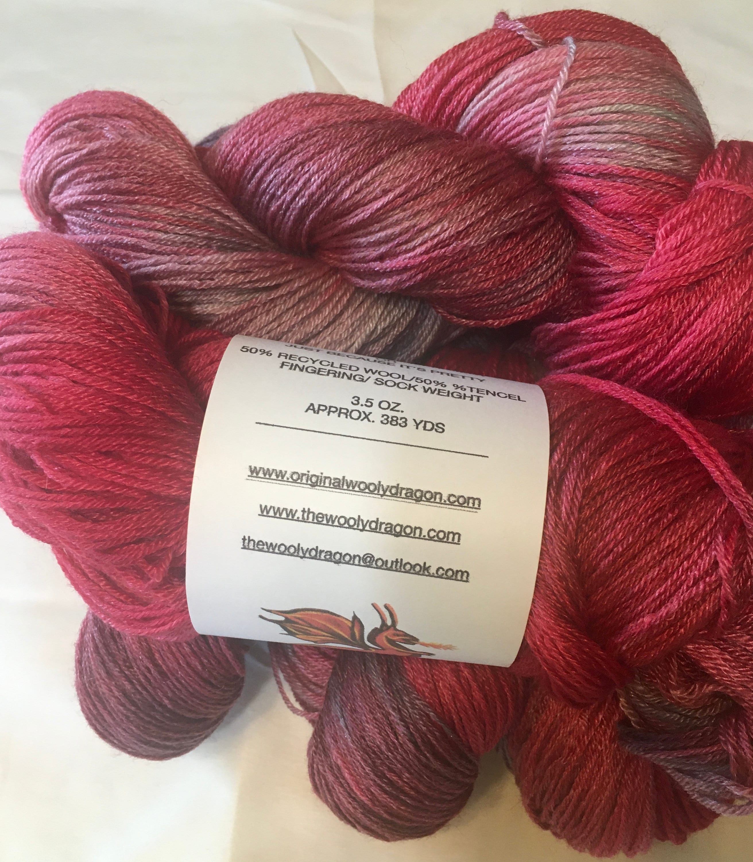 Hand painting means each skein is unique; no two skeins are exactly alike. The yarn is made from recycled wool and Tencel (50/50). Tencel is a type of rayon made from plant cellulose. It wicks moisture better than cotton or hemp and is softer too. 383 yards/100 gms.