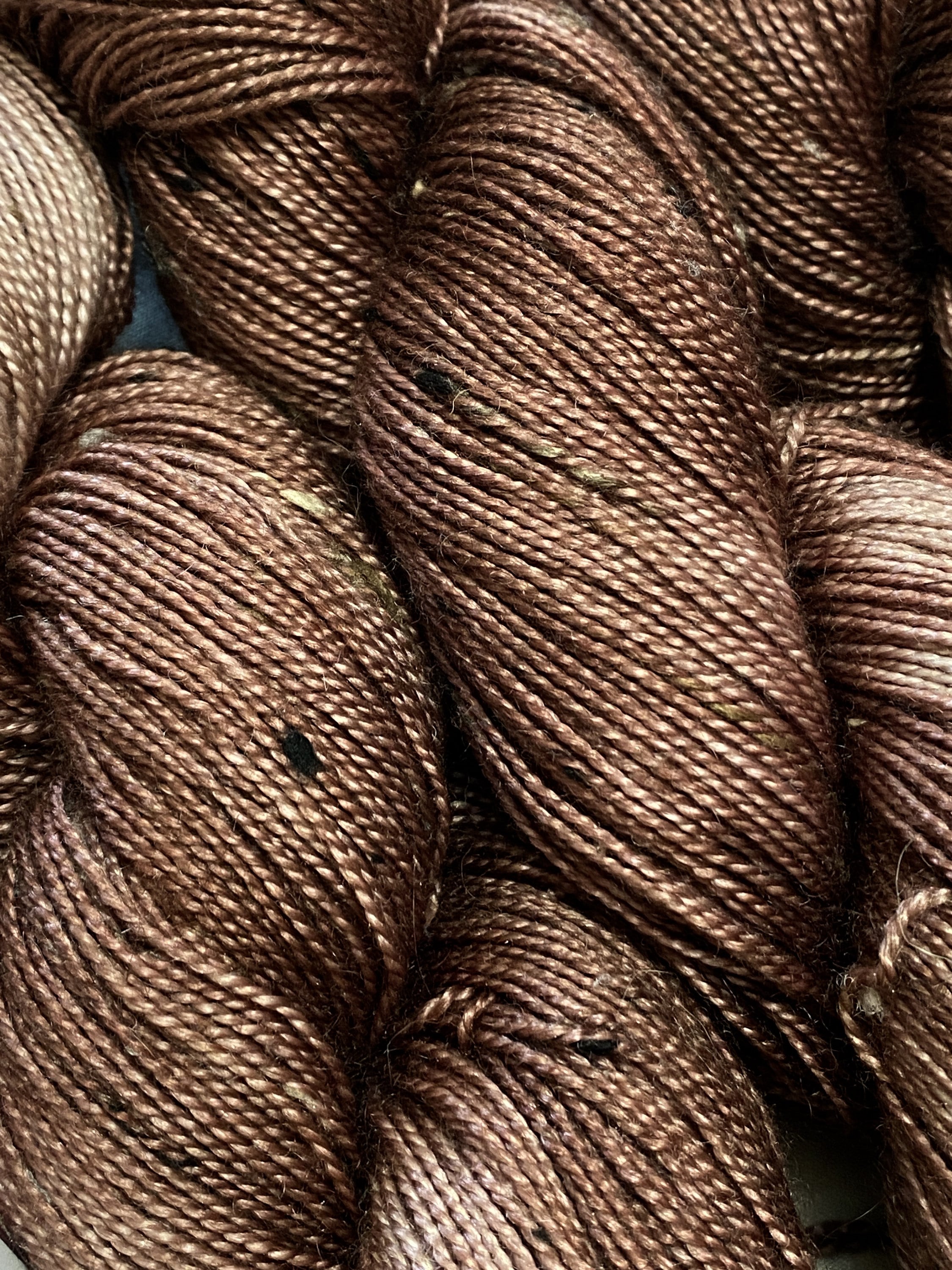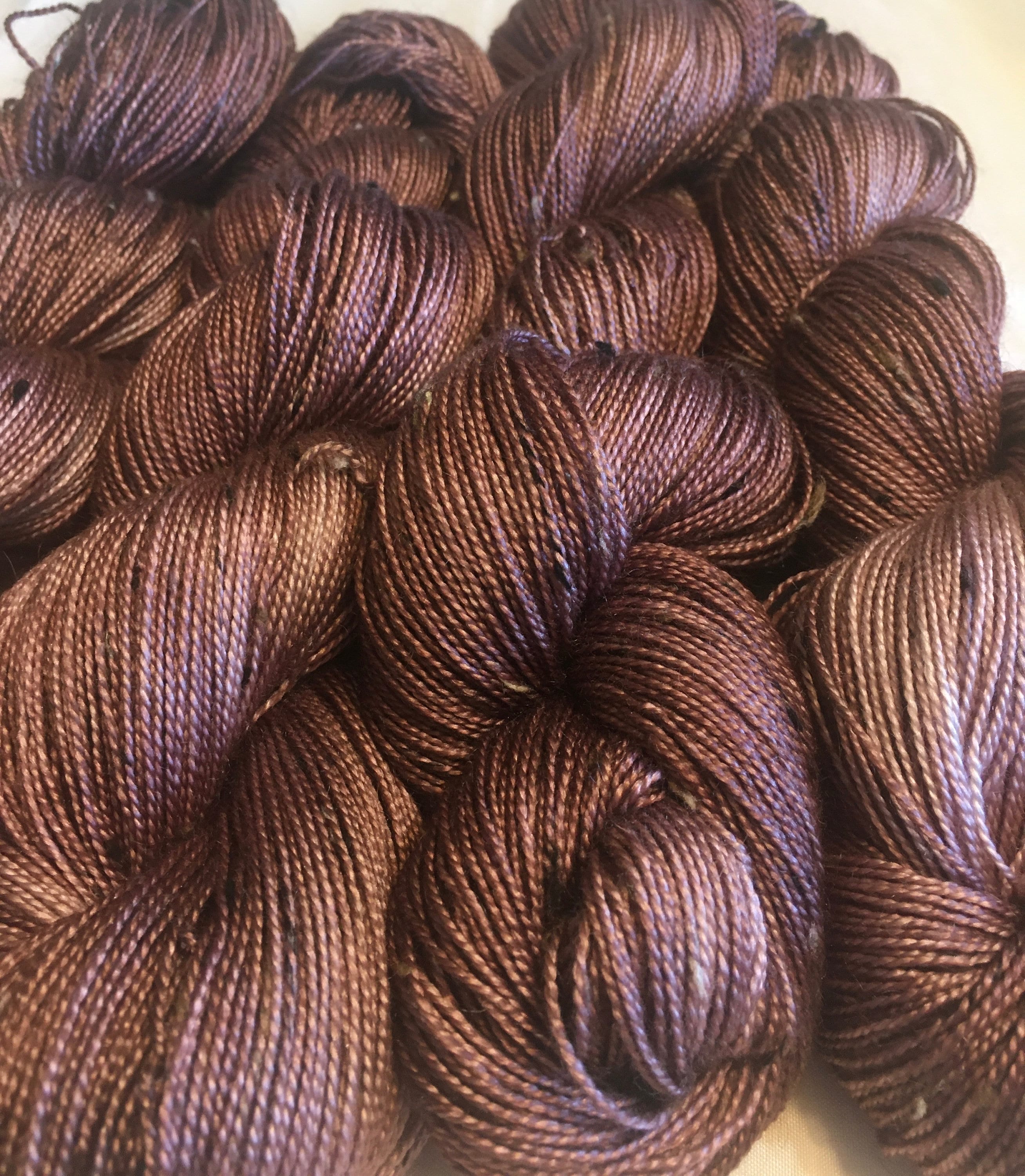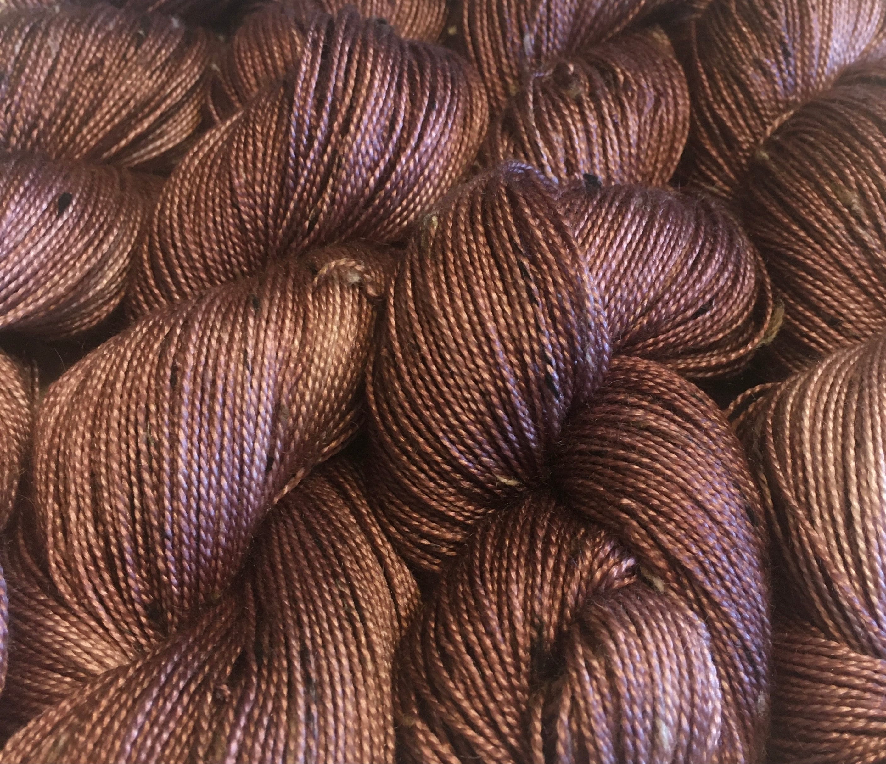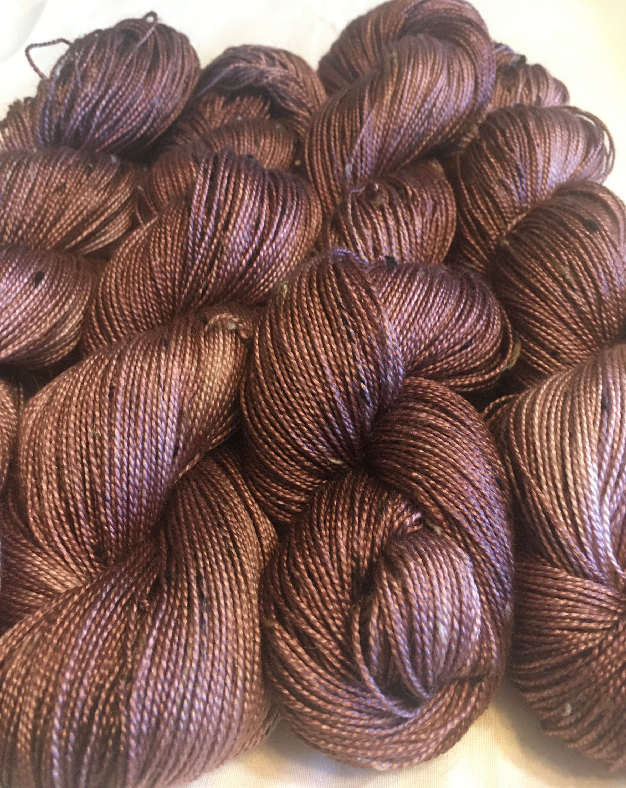 This yarn is kettle-dyed; depending on the light and angle, this yarn can look brown, chestnut brown, reddish brown, burgundy or grayish brown. Hand-dyed yarns are not uniform in color; each hank will have slight differences.