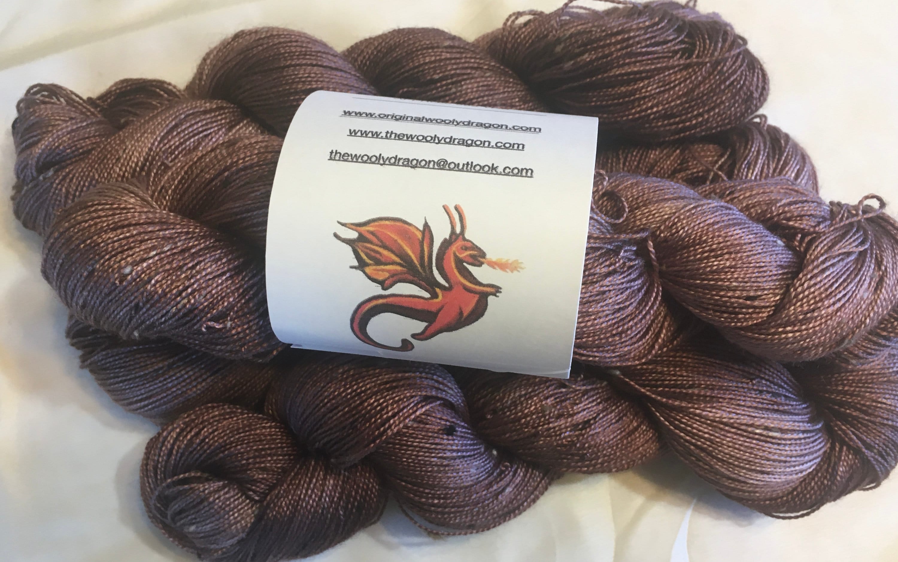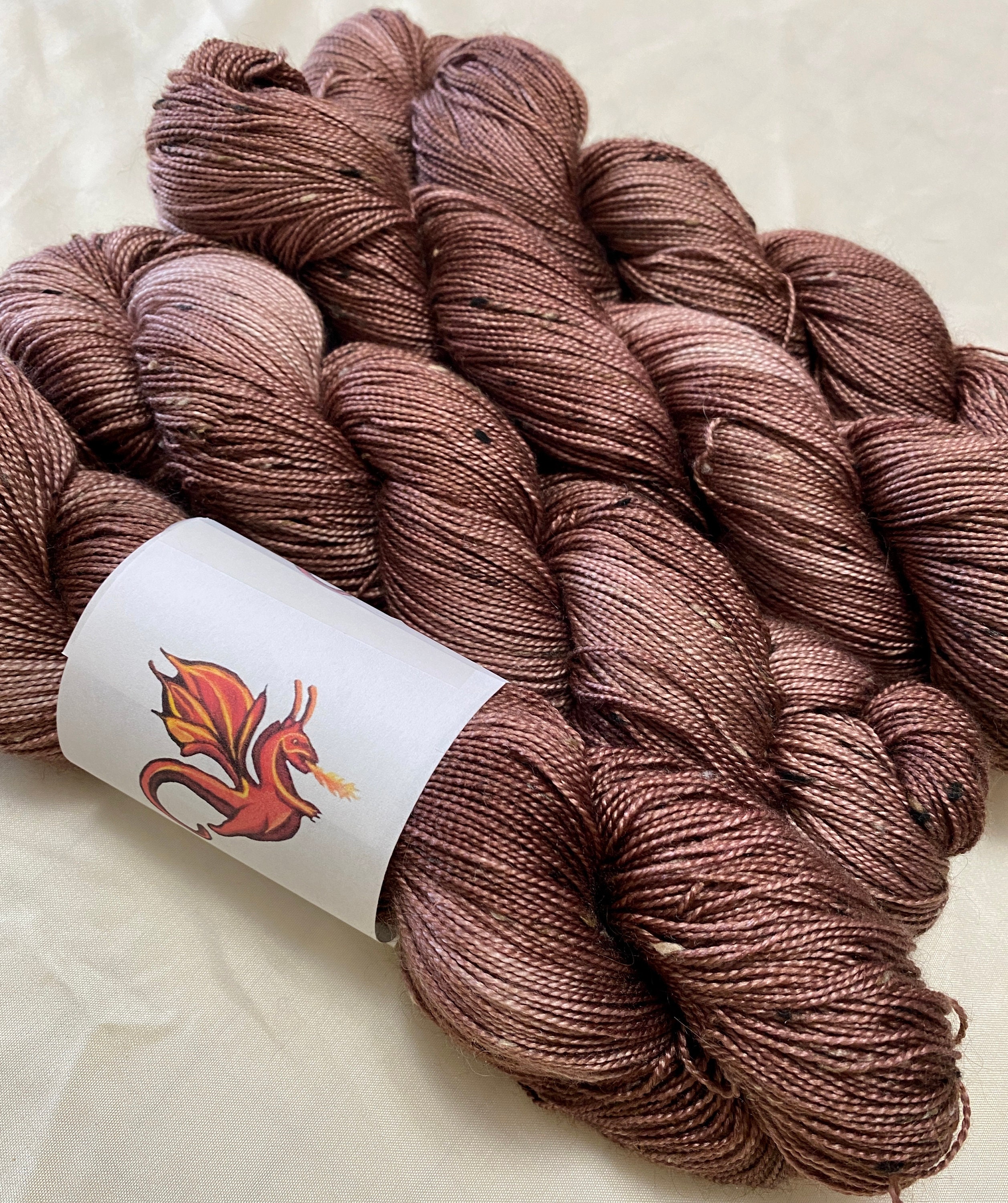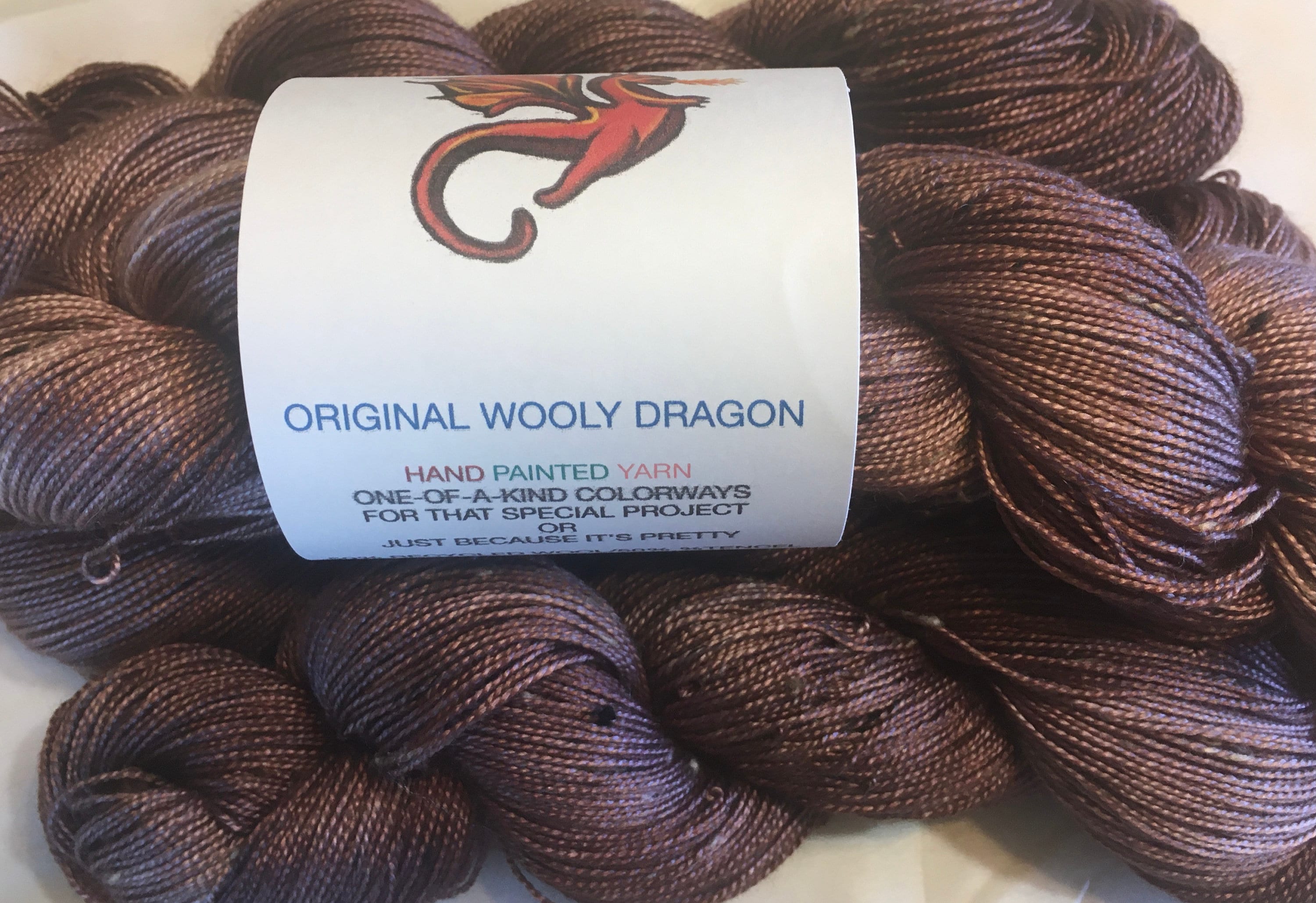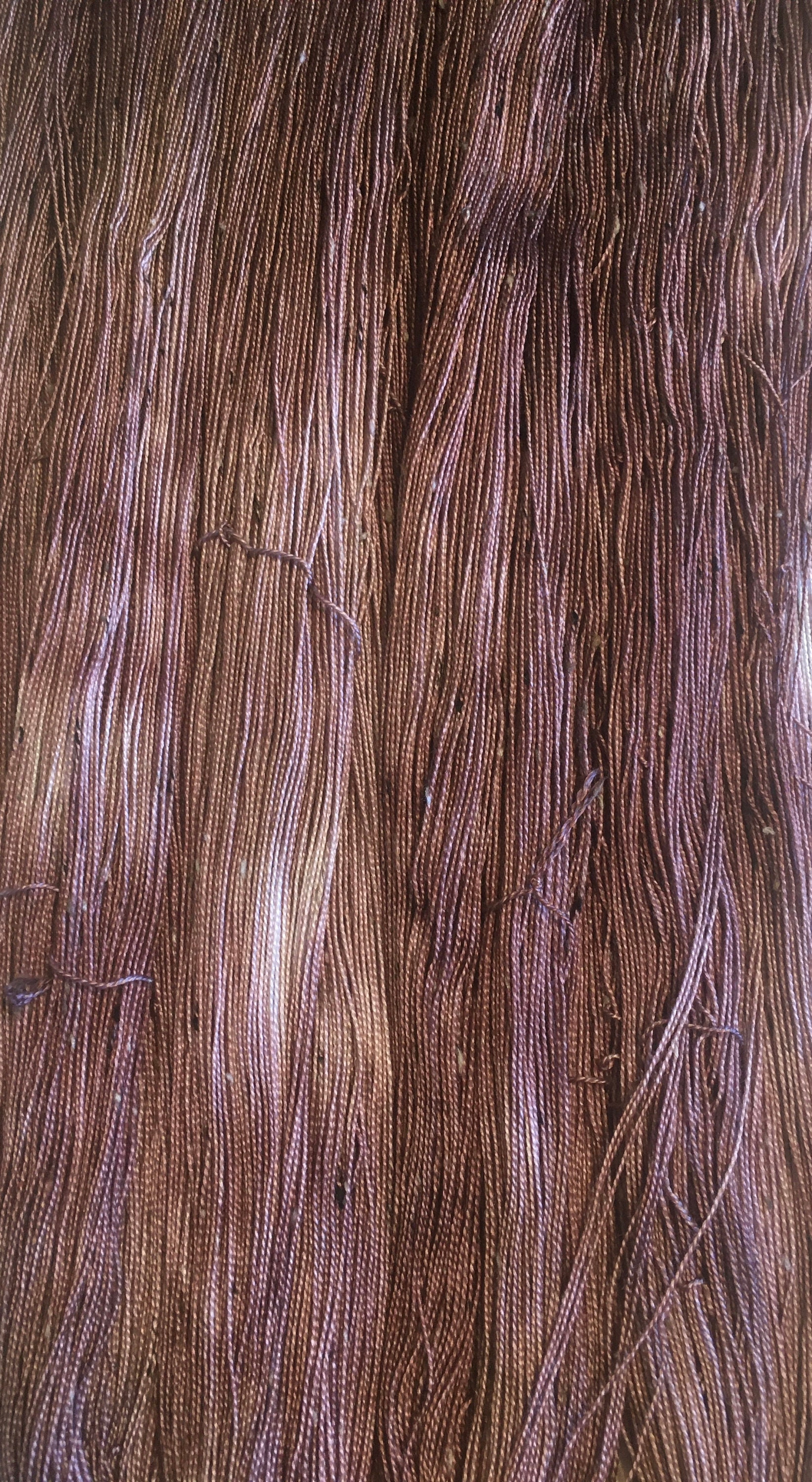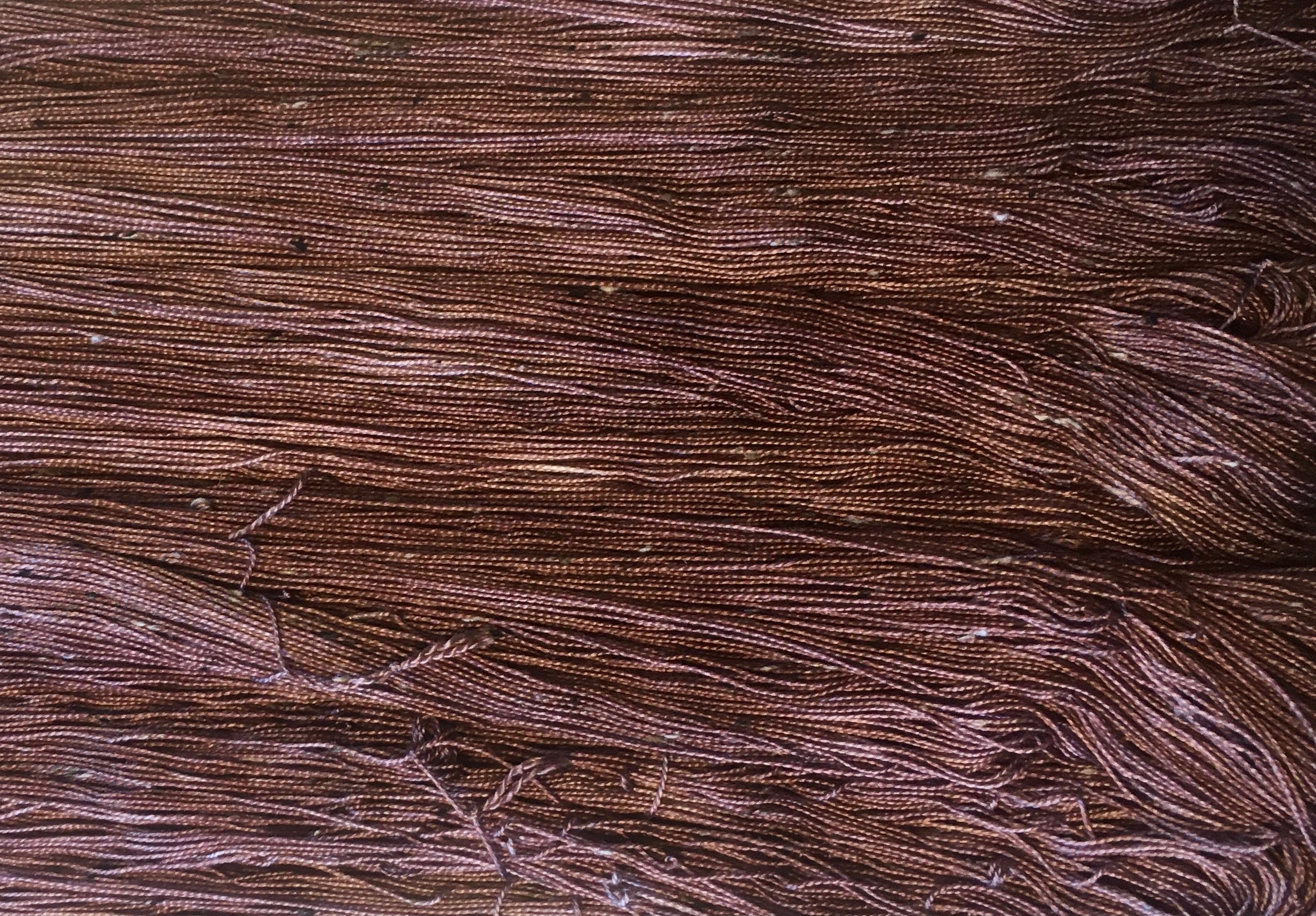 This yarn is kettle-dyed; depending on the light and angle, this yarn can look brown, chestnut brown, reddish brown, burgundy or grayish brown. Hand-dyed yarns are not uniform in color; each hank will have slight differences.