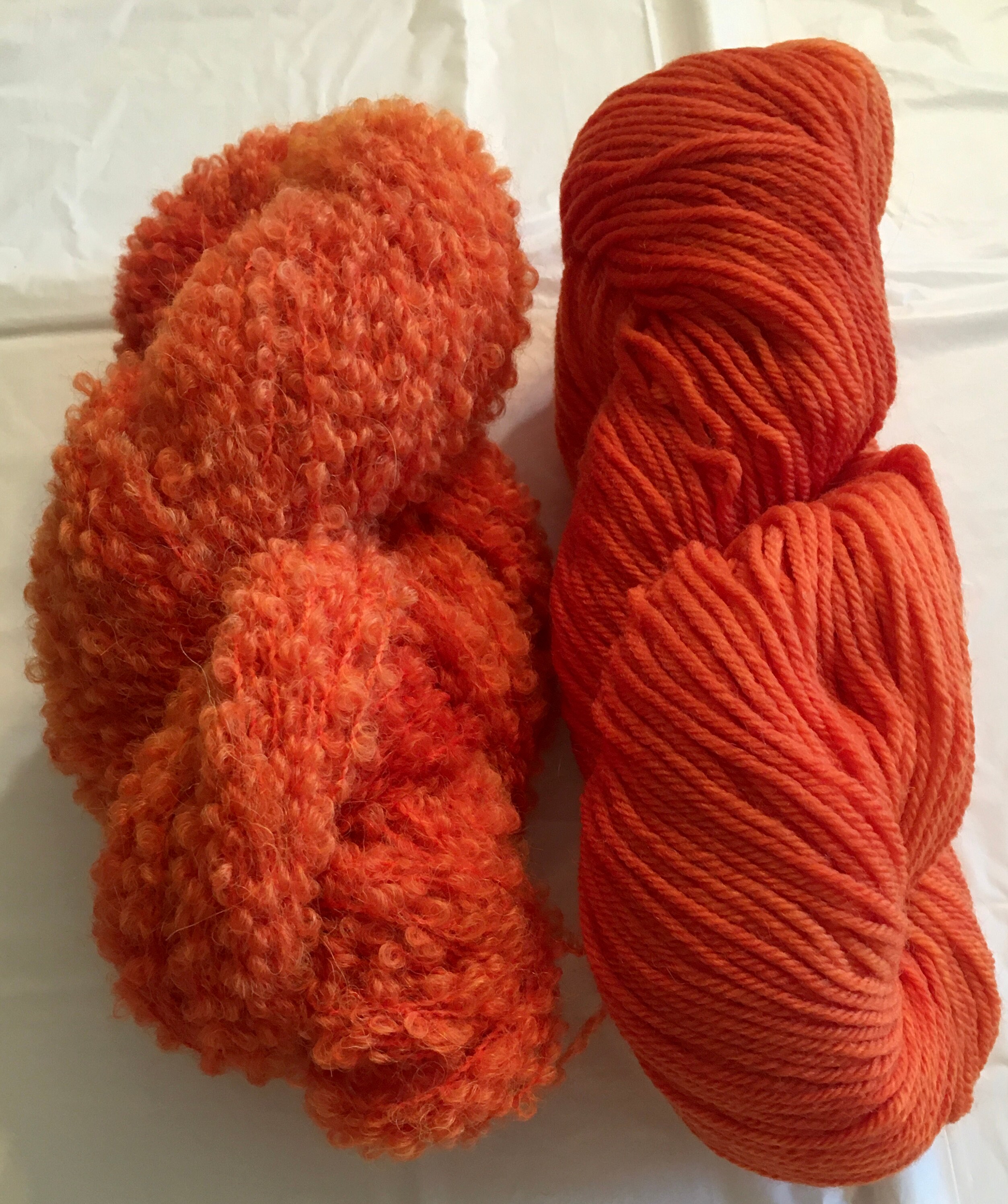 This qualifies as a truly scrumptious and soft yarn! Wooly loves citrus fruits, especially oranges & tangerines. This yarn is a true orange color with some areas of lighter & darker orange throughout. It is a blend of 82% Alpaca, 13% Merino and 5% nylon. 328 yards on a 3.5oz/100 gm hank (fingering weight). It is kettle dyed.