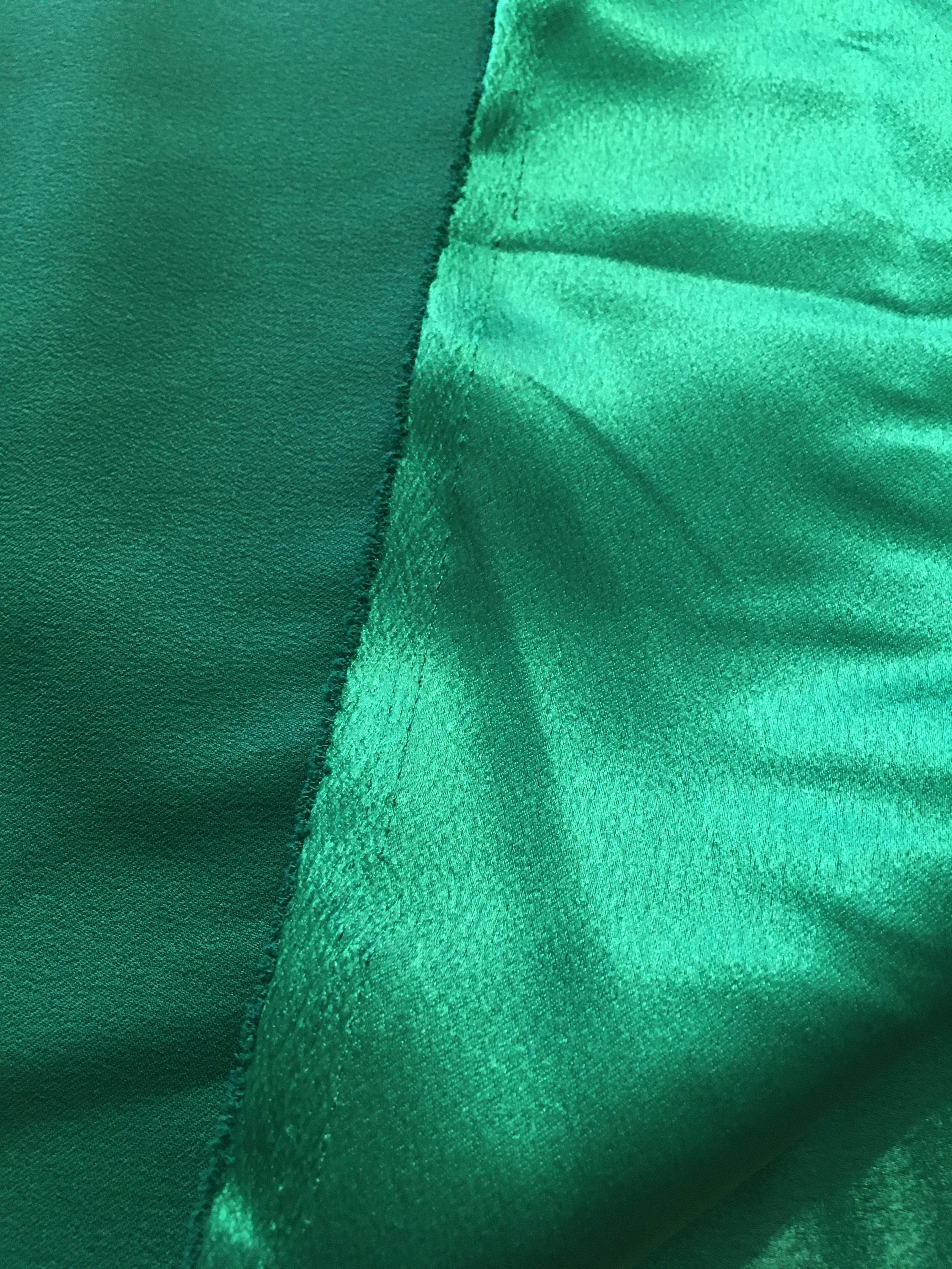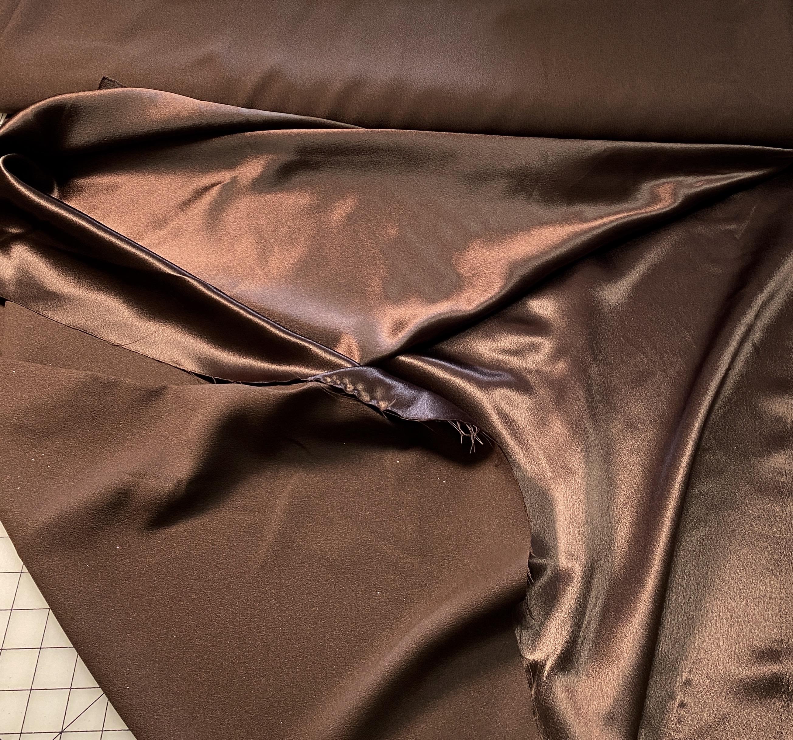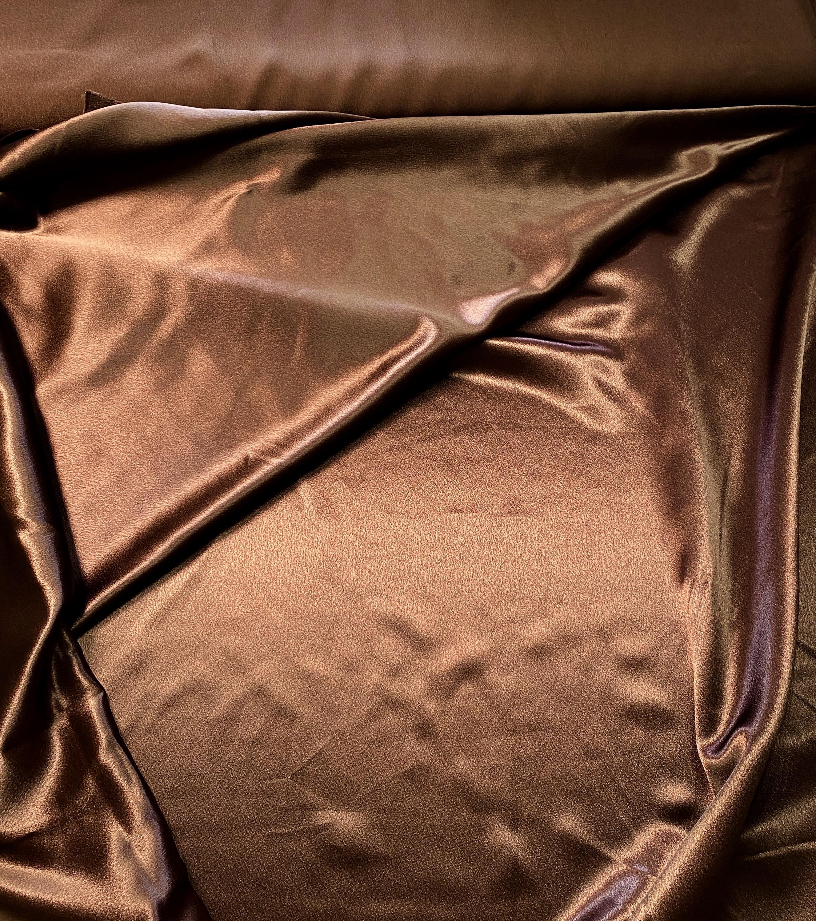 Beautiful Crepe Back Satin in either a luscious Nile Green color or sumptuous Chocolate Brown. 58/60" Wide, the crepe side is a matte and the satin side is shiny. You could use either side for cuffs, collars & various design bits that would coordinate beautifully with the other side.