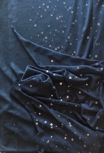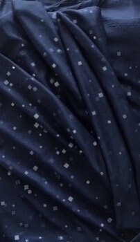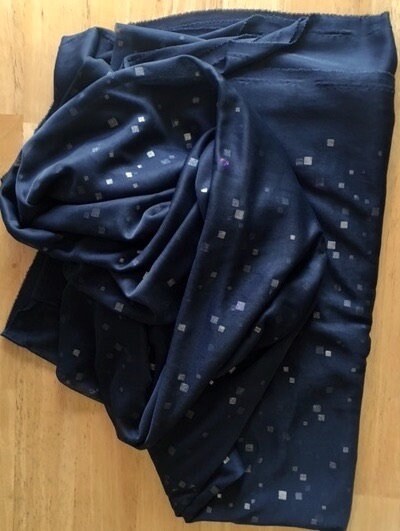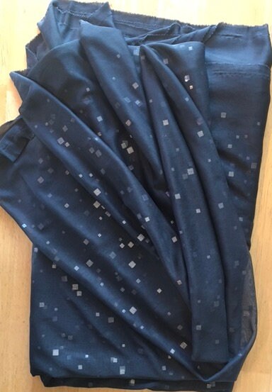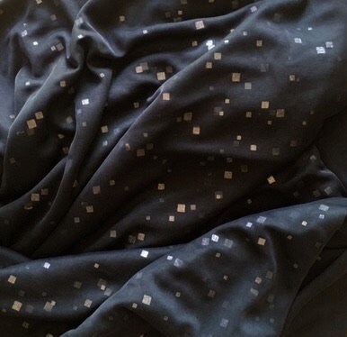 This is a beautiful piece, light and airy, muted black/charcoal with pewter squares randomly fused on it. It is 58" wide with a large selvage, perfect for so many projects. It has been very difficult to photograph as the pewter squares keep reflecting silver or gold. But they are pewter, a low key dramatic look.