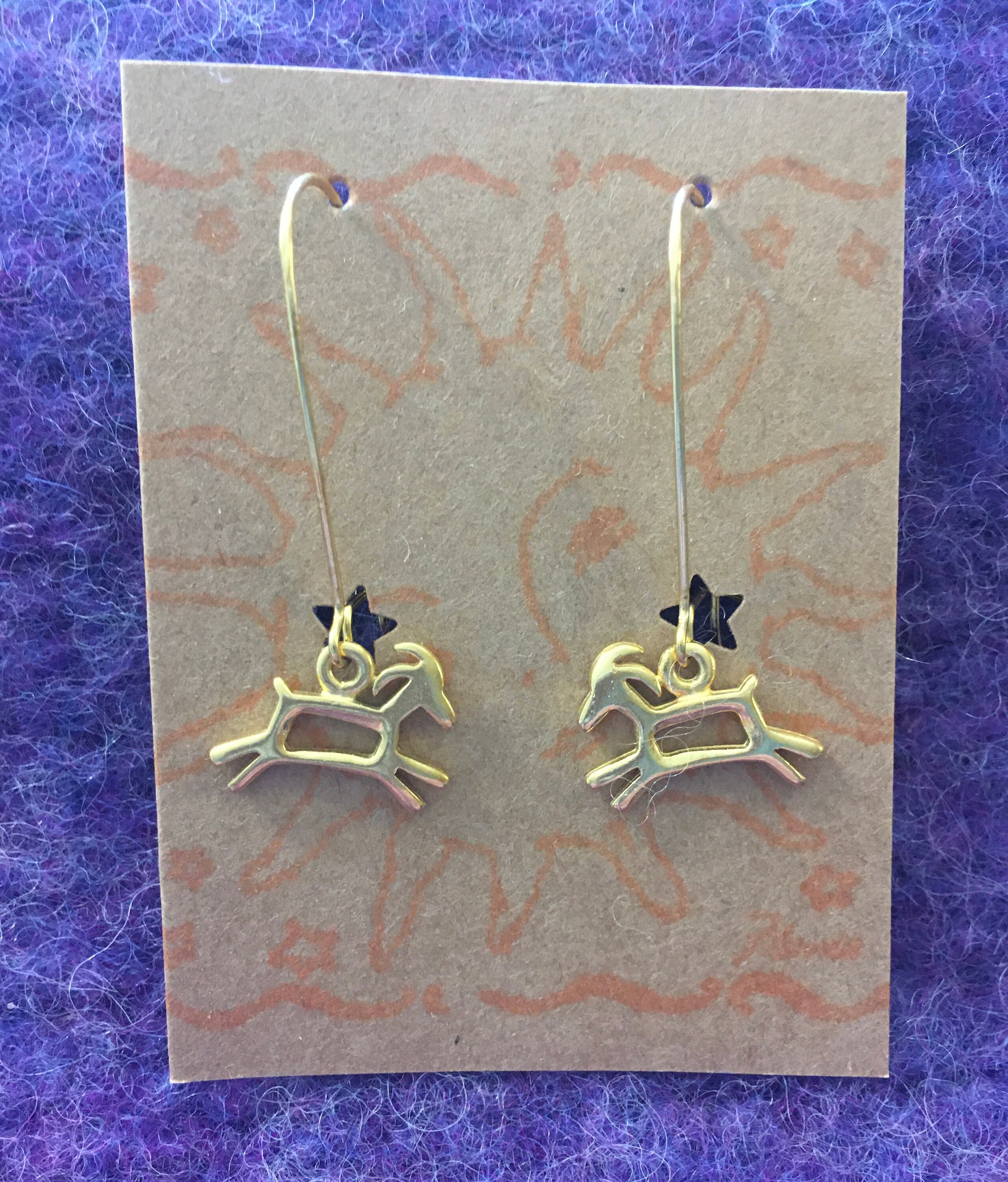 These earrings are handmade, vintage and gold plated. The 15mm x 10mm goat charms dangle from 1.25" gold plated kidney-shaped wires. The length of the wires allow the goats to dance along your jawline. The wire hooks easily on itself, so there is no need for an earring back to prevent an earring from falling out of your earlobe.