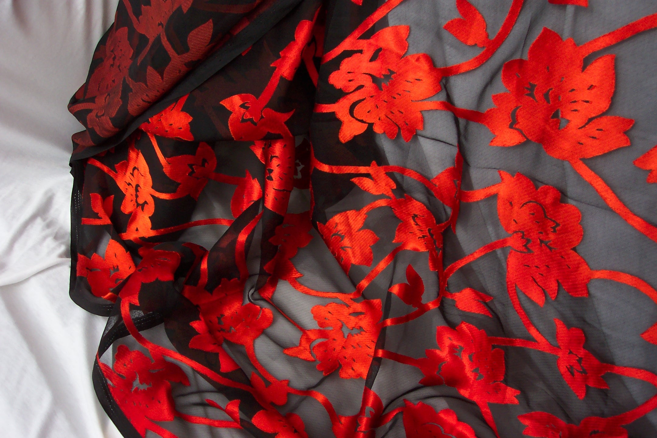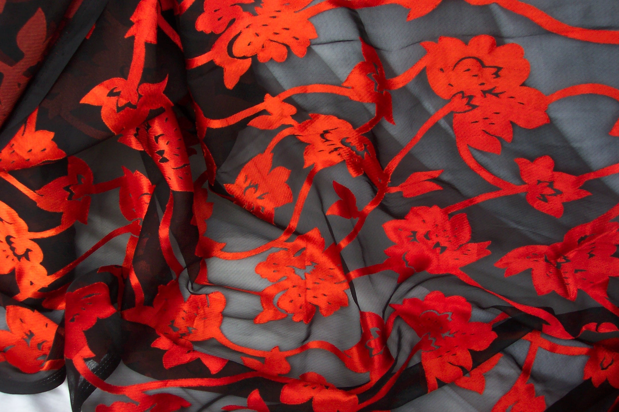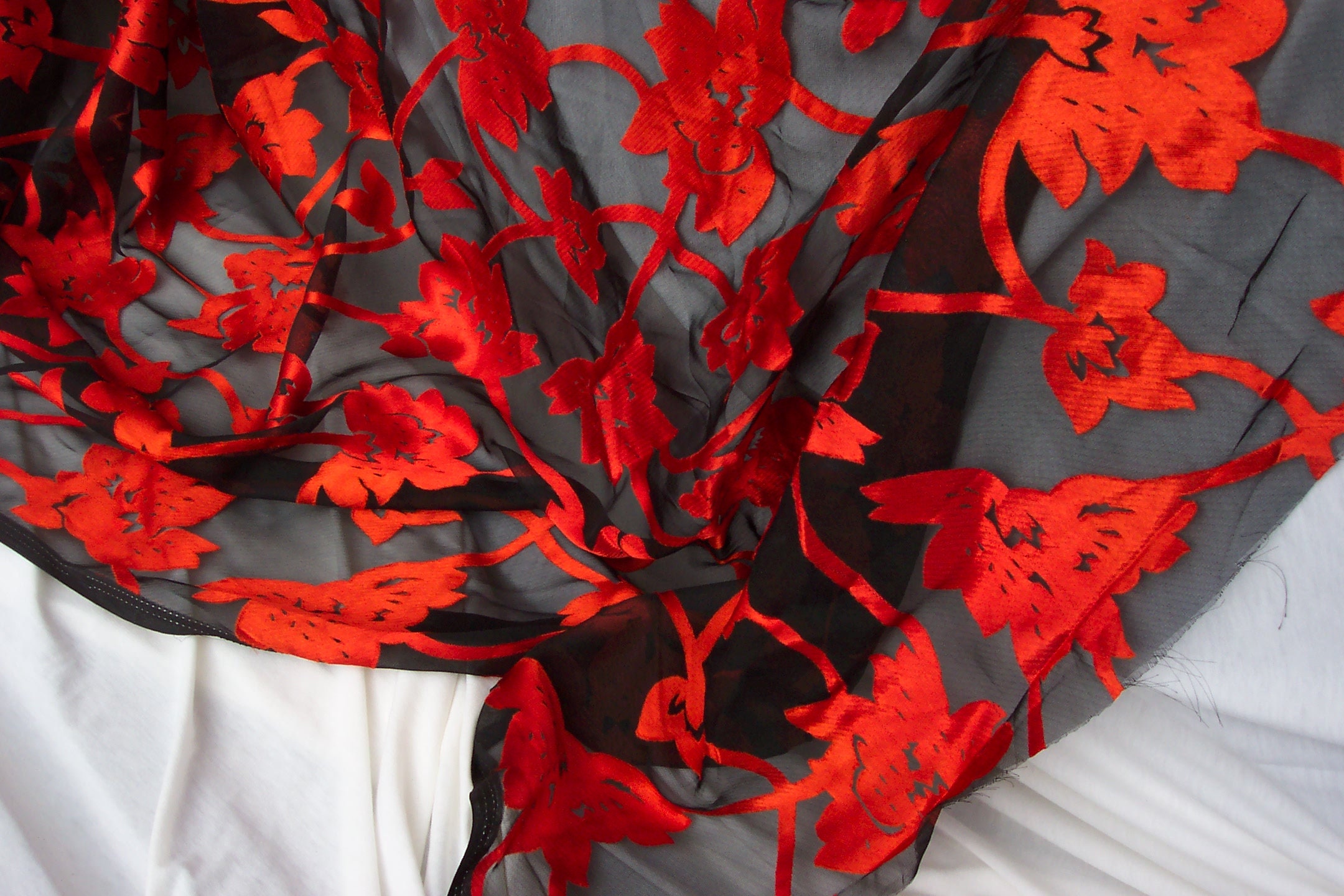 Beautiful sheer burnout fabric, red-orange floral and/or leaves on black. 43-44" wide, 60% Polyester, 40% Viscose, made in India.