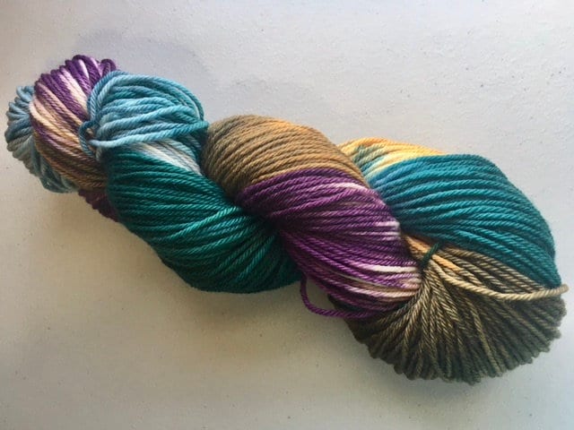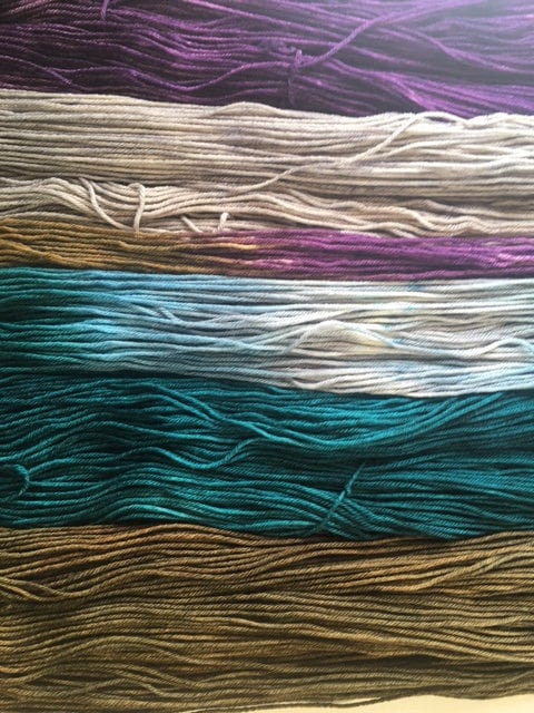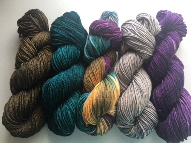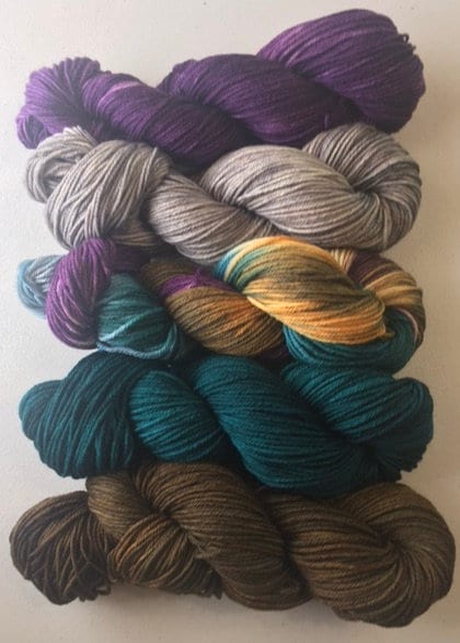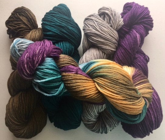 This is a yarn set comprised of 5 skeins; 4 skeins each kettle-dyed a different color: gray, teal, purple and brown & one skein hand painted with all 4 colors to tie everything together.