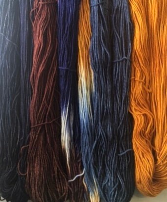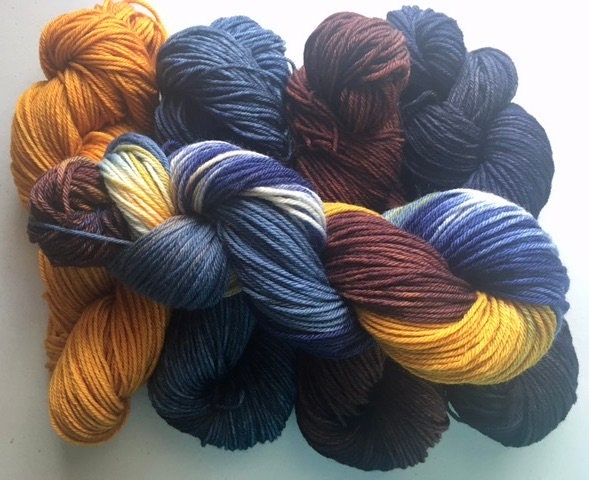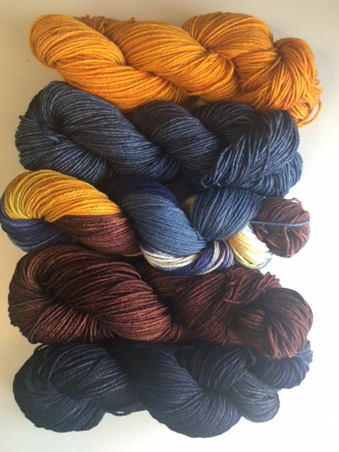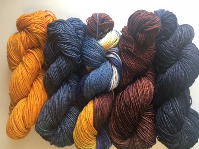 This is a yarn set comprised of 5 skeins; 4 skeins each kettle-dyed a different color: navy, chestnut brown, gunmetal blue & gold and one skein hand painted with all 4 colors to tie everything together.