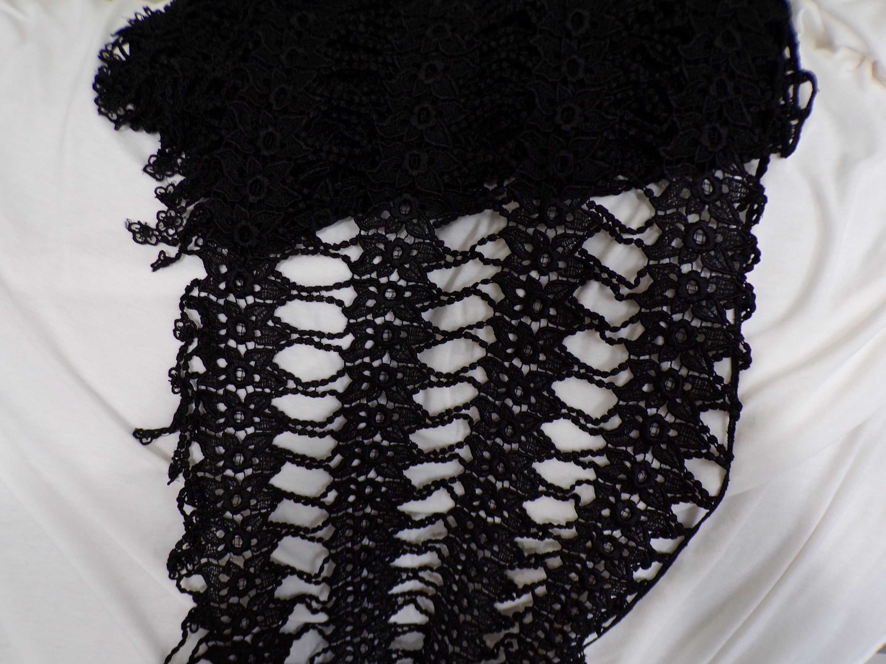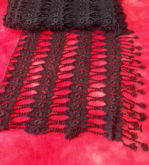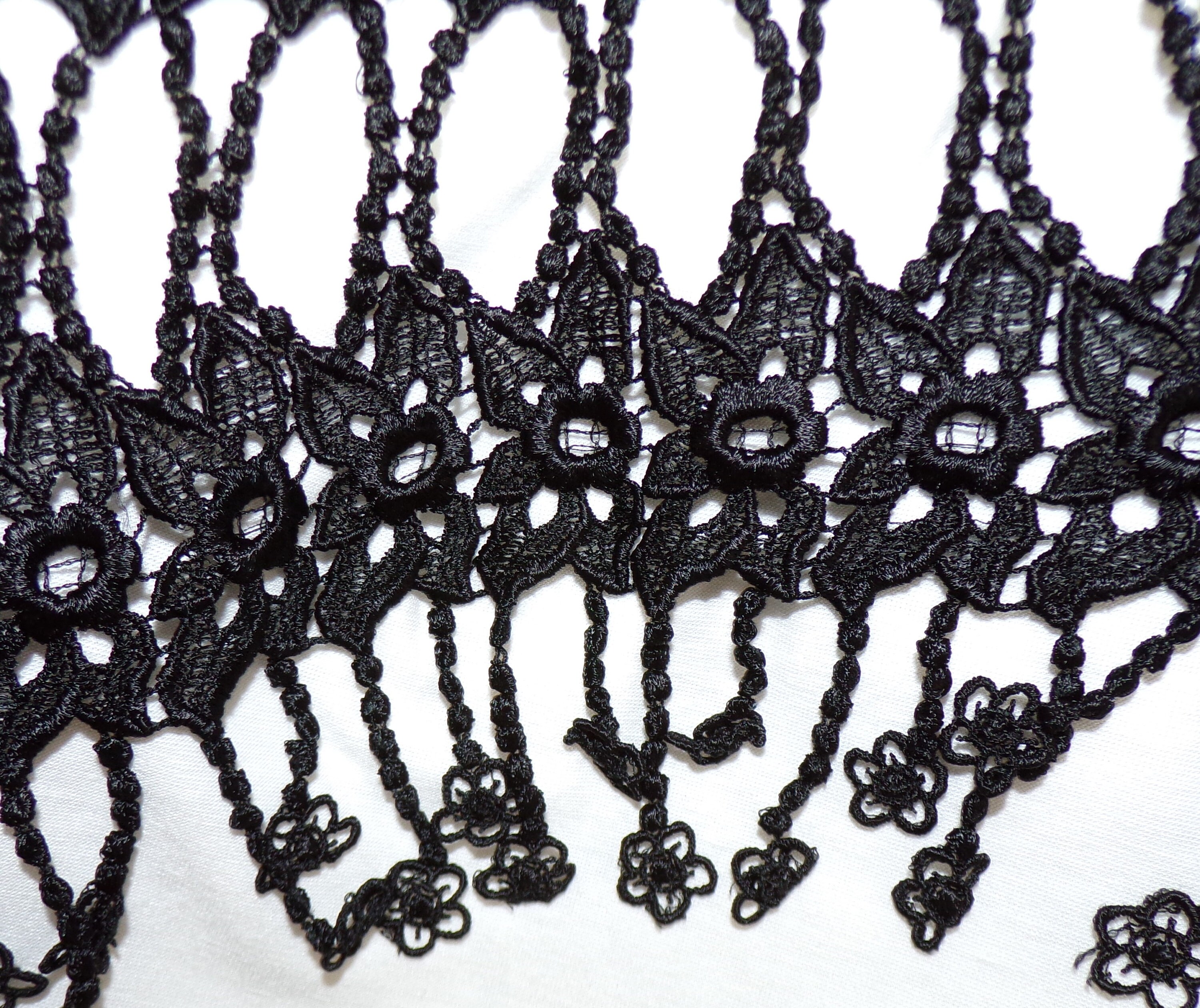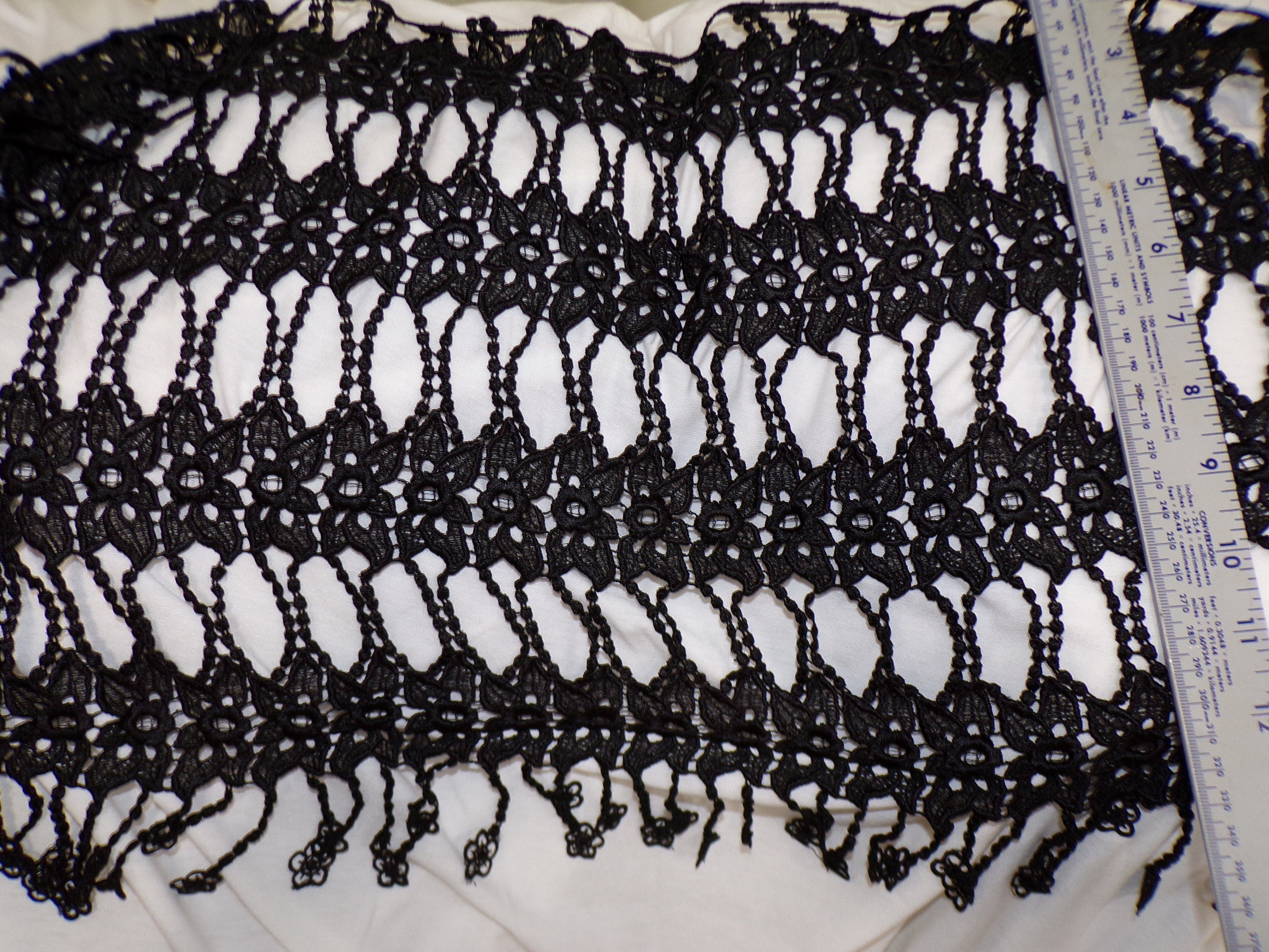Very deep Venice lace trim in black. Outstanding for costuming. Would look great over the top of a long skirt or on a bodice. ~15" from top to bottom.