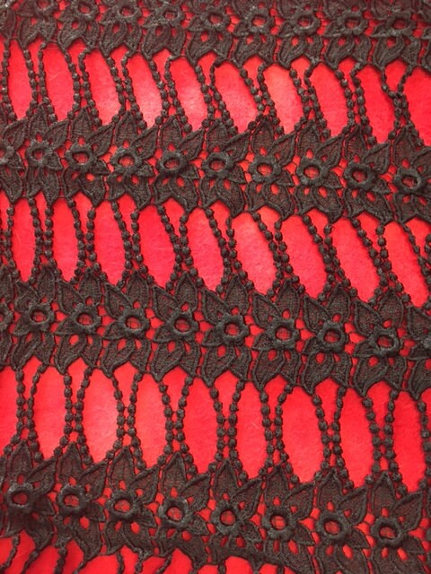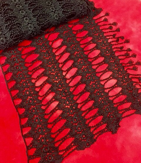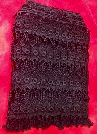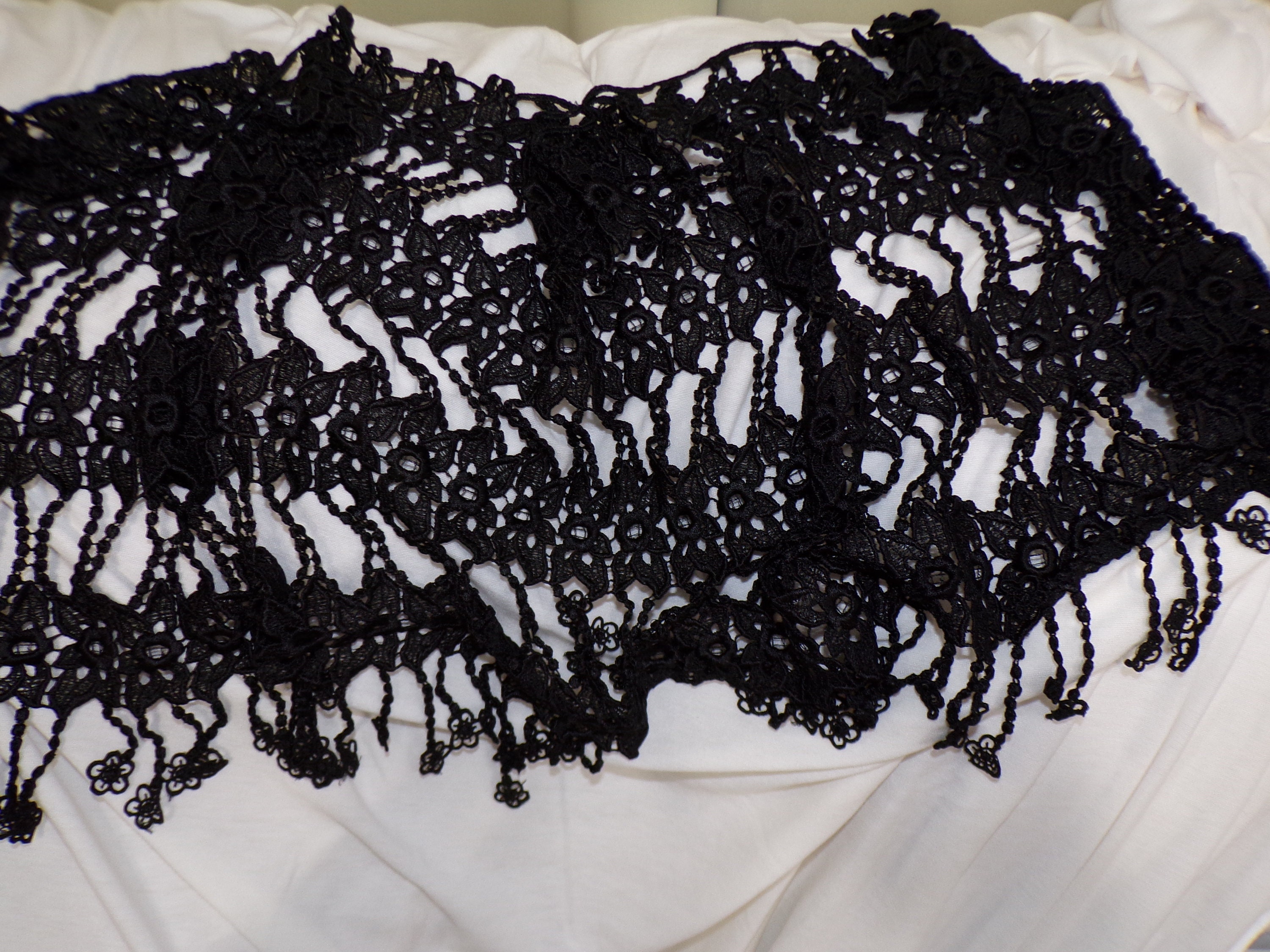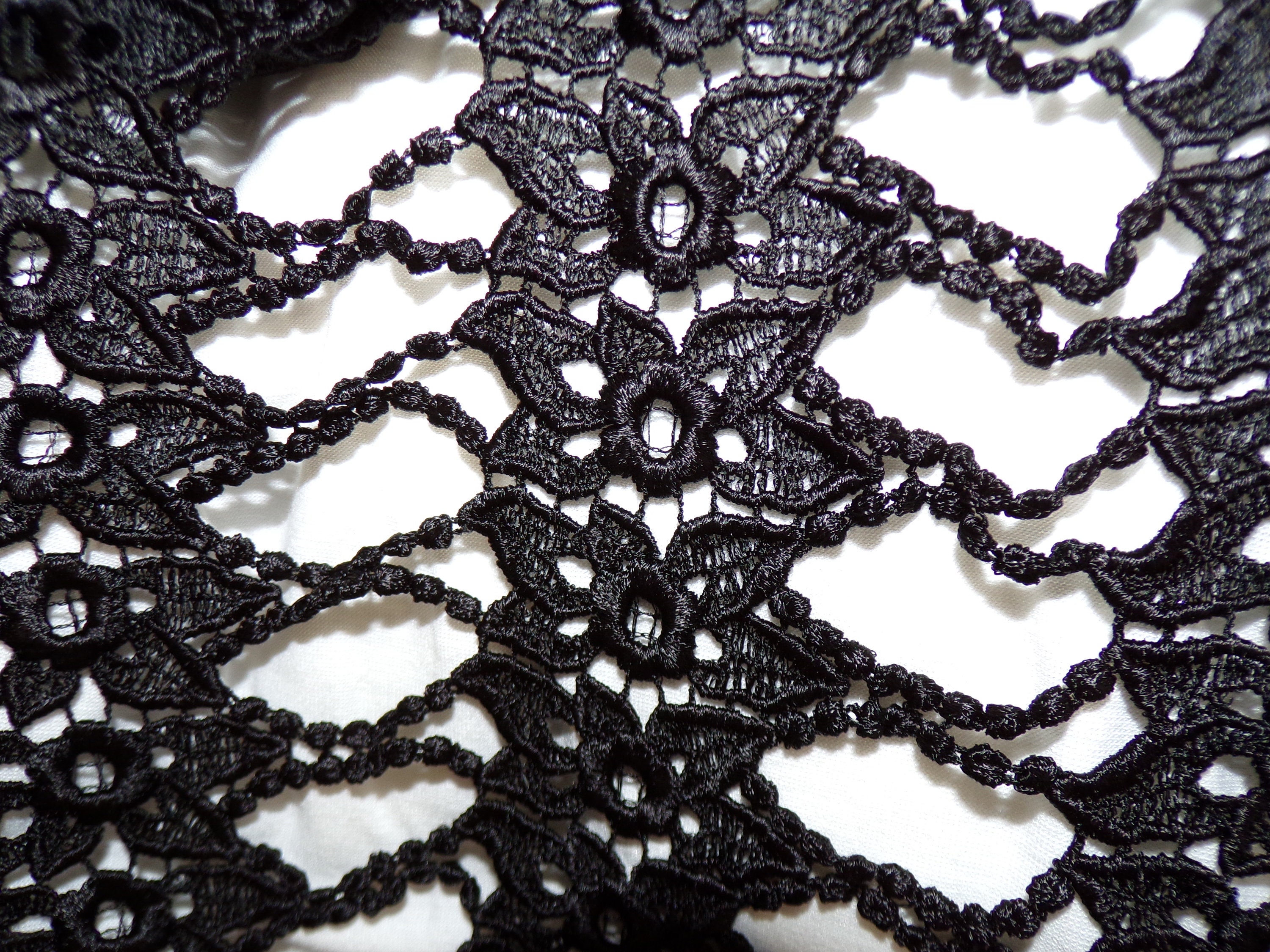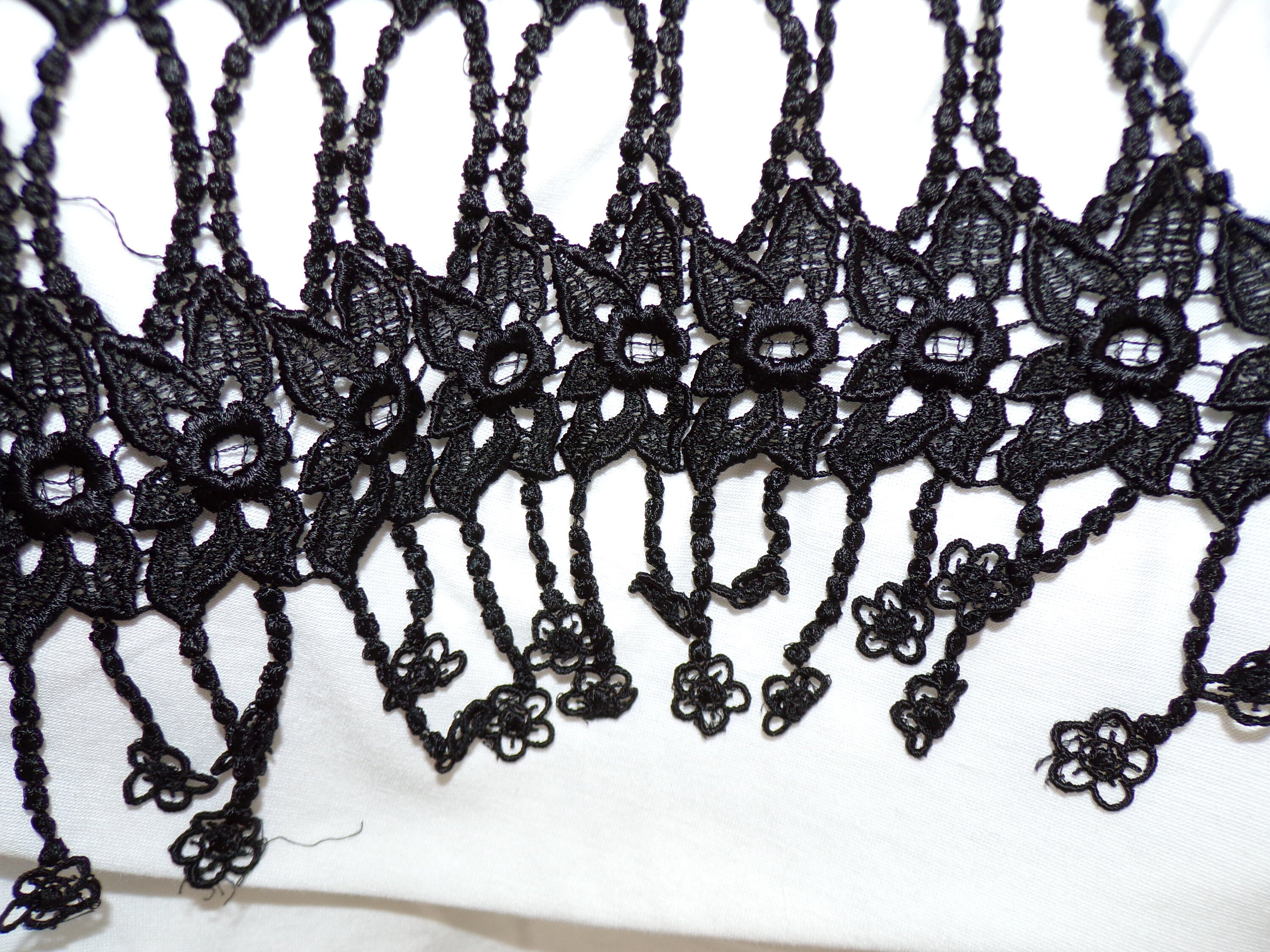 Very deep Venice lace trim in black. Outstanding for costuming. Would look great over the top of a long skirt or on a bodice. ~15" from top to bottom.