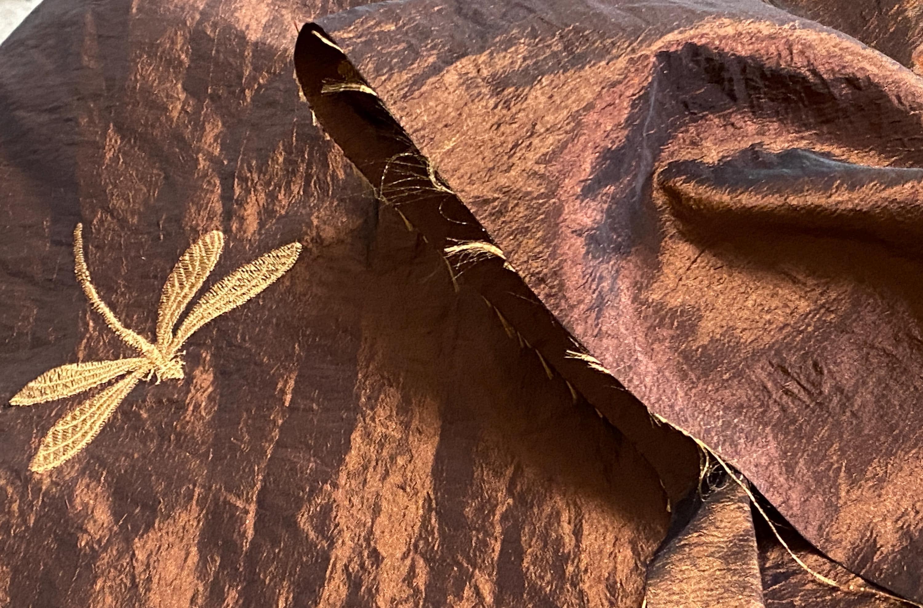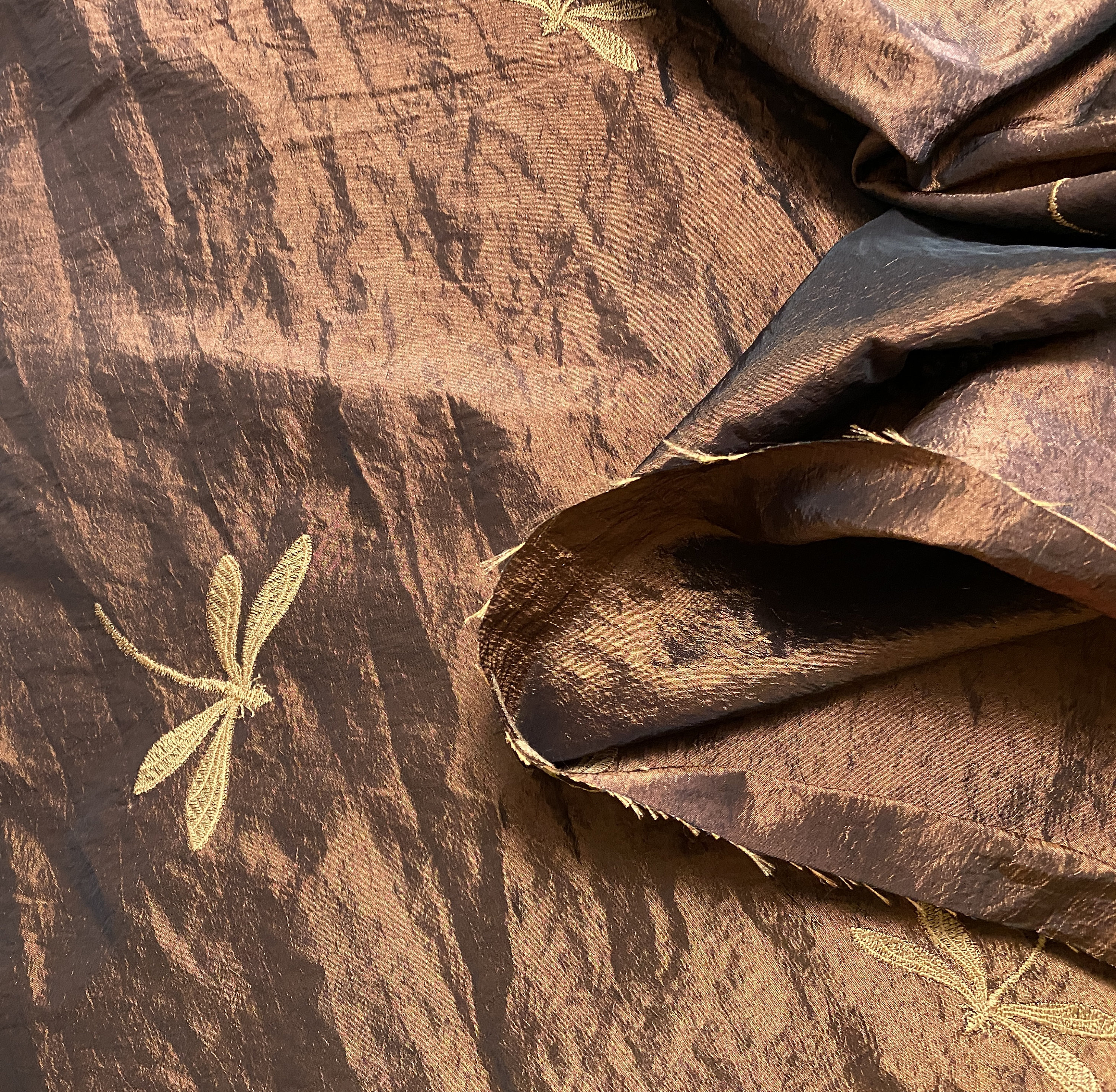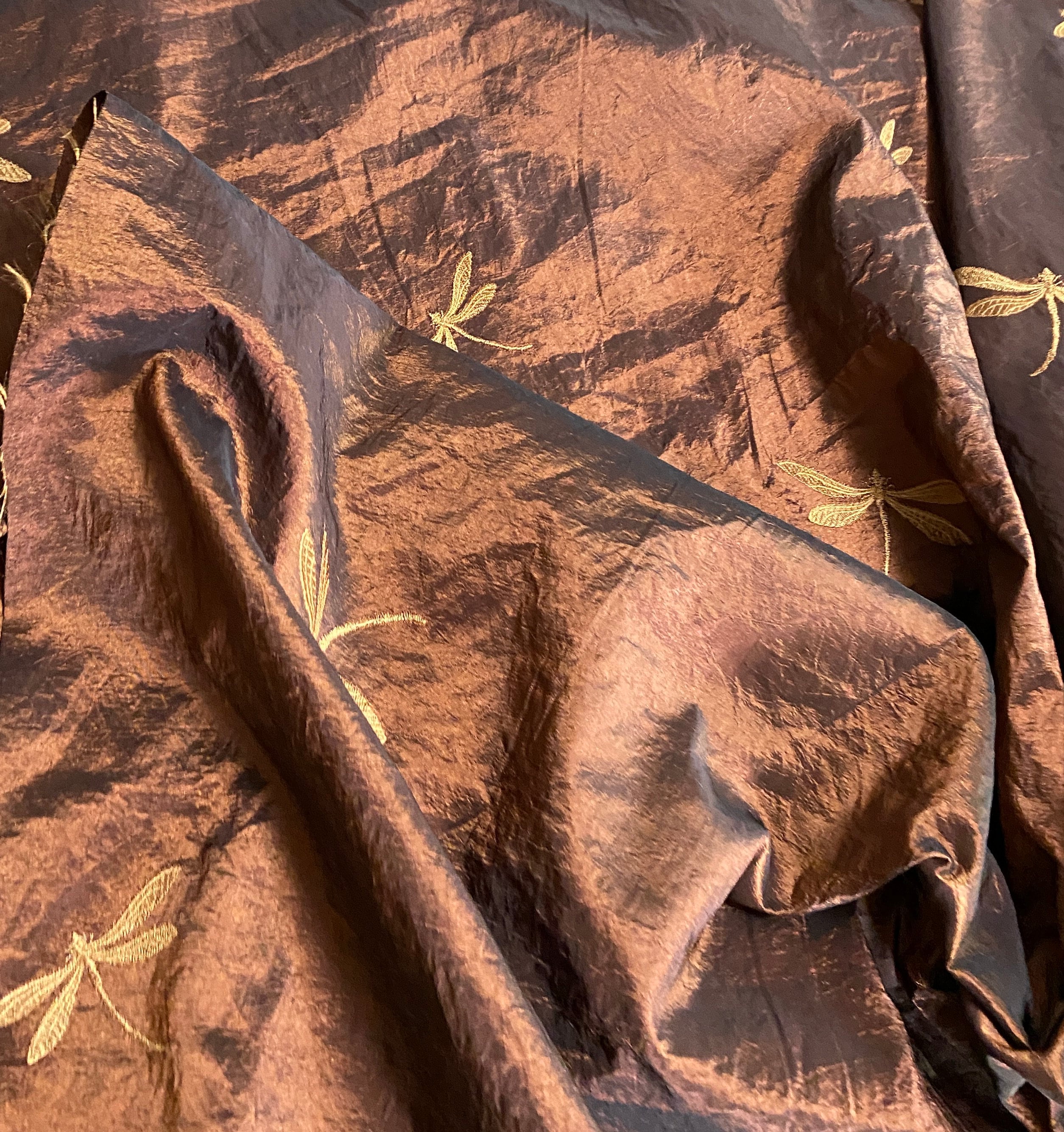 This taffeta has a nice soft hand; not as stiff as many taffeta fabrics can be and with the tiniest bit of stretch to it. The crinkled look catches the light for dimensional color changes. The color of the fabric is a rich, coppery brown.