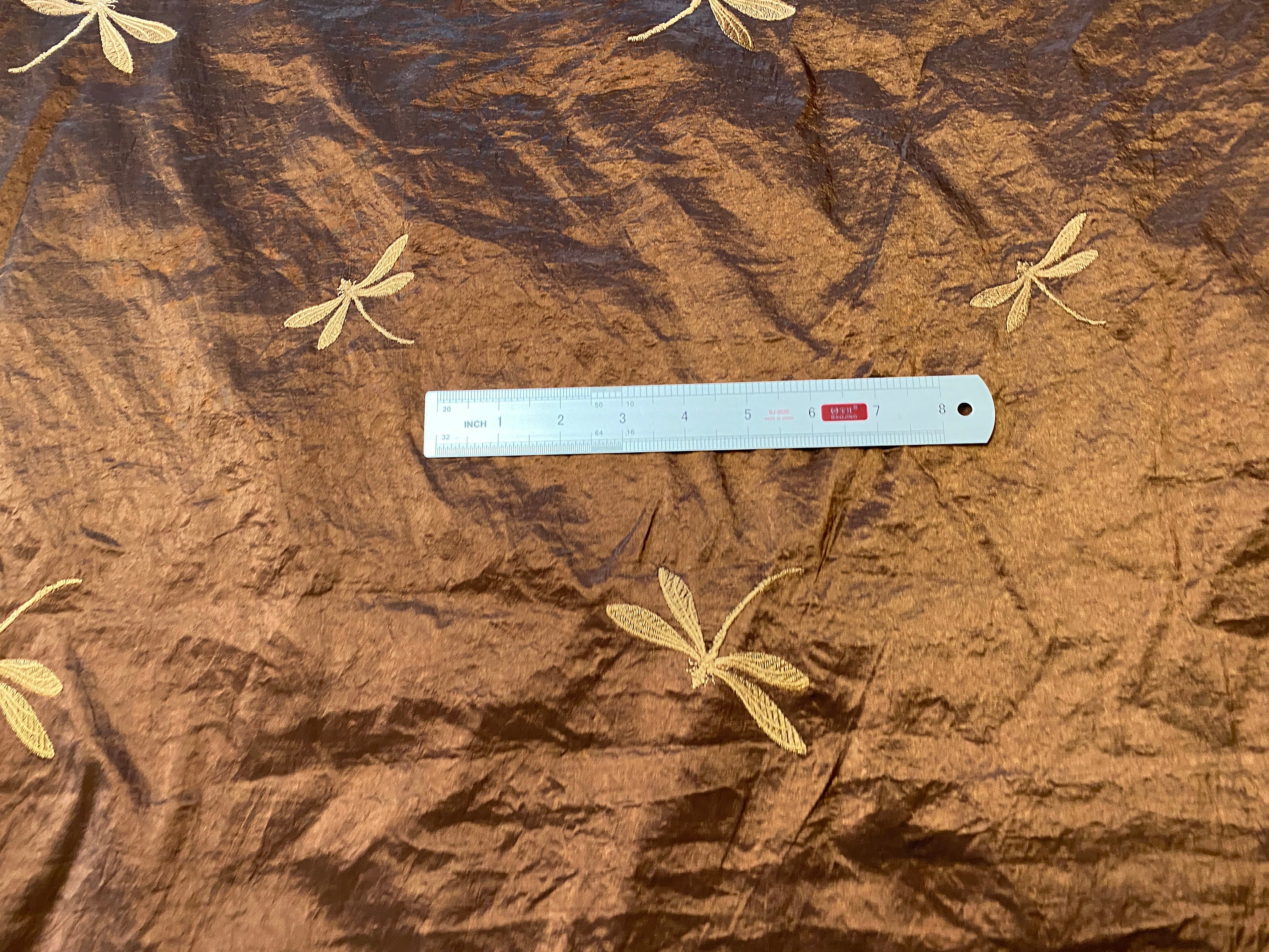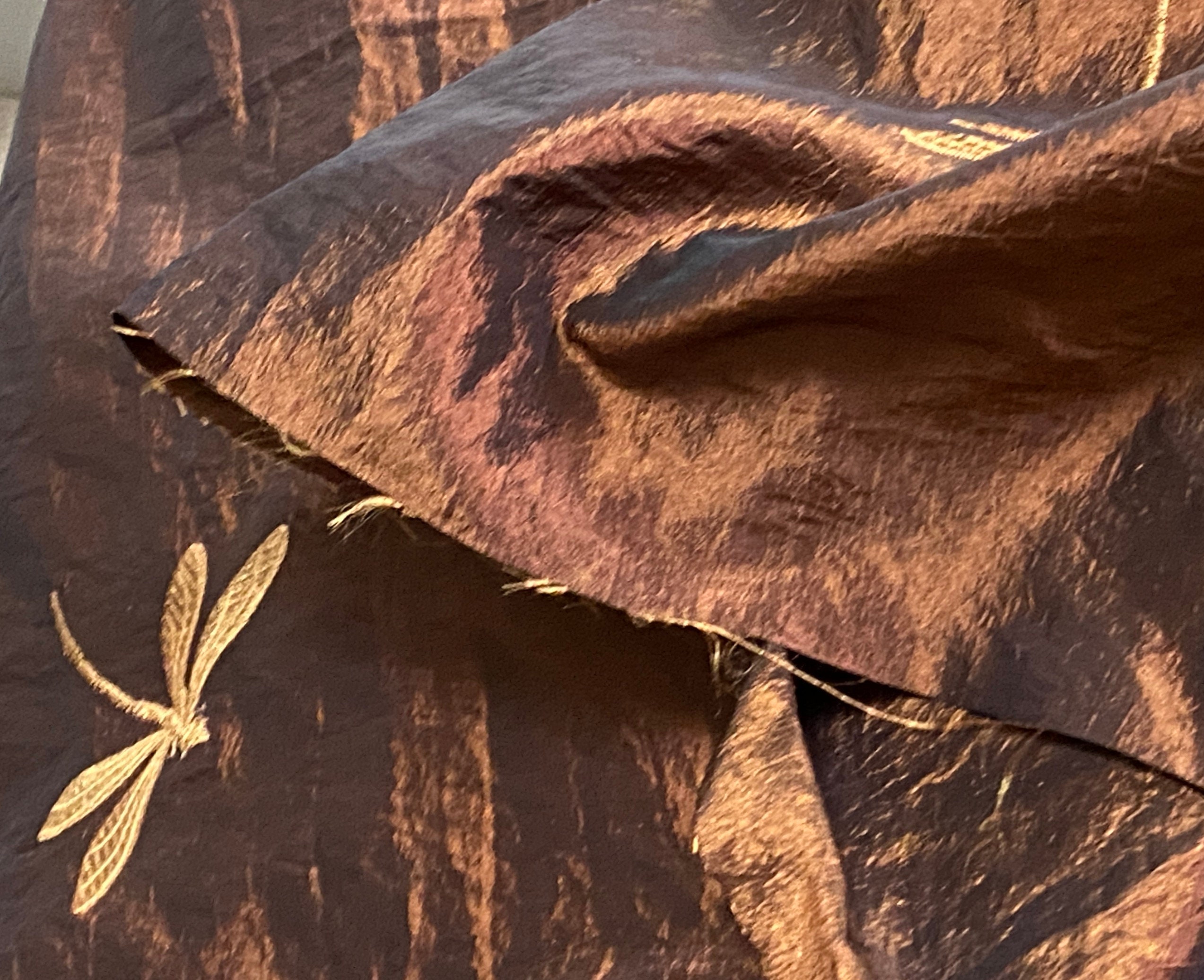 The dragonflies are made with gold embroidery thread; different sizes flit randomly about the material.