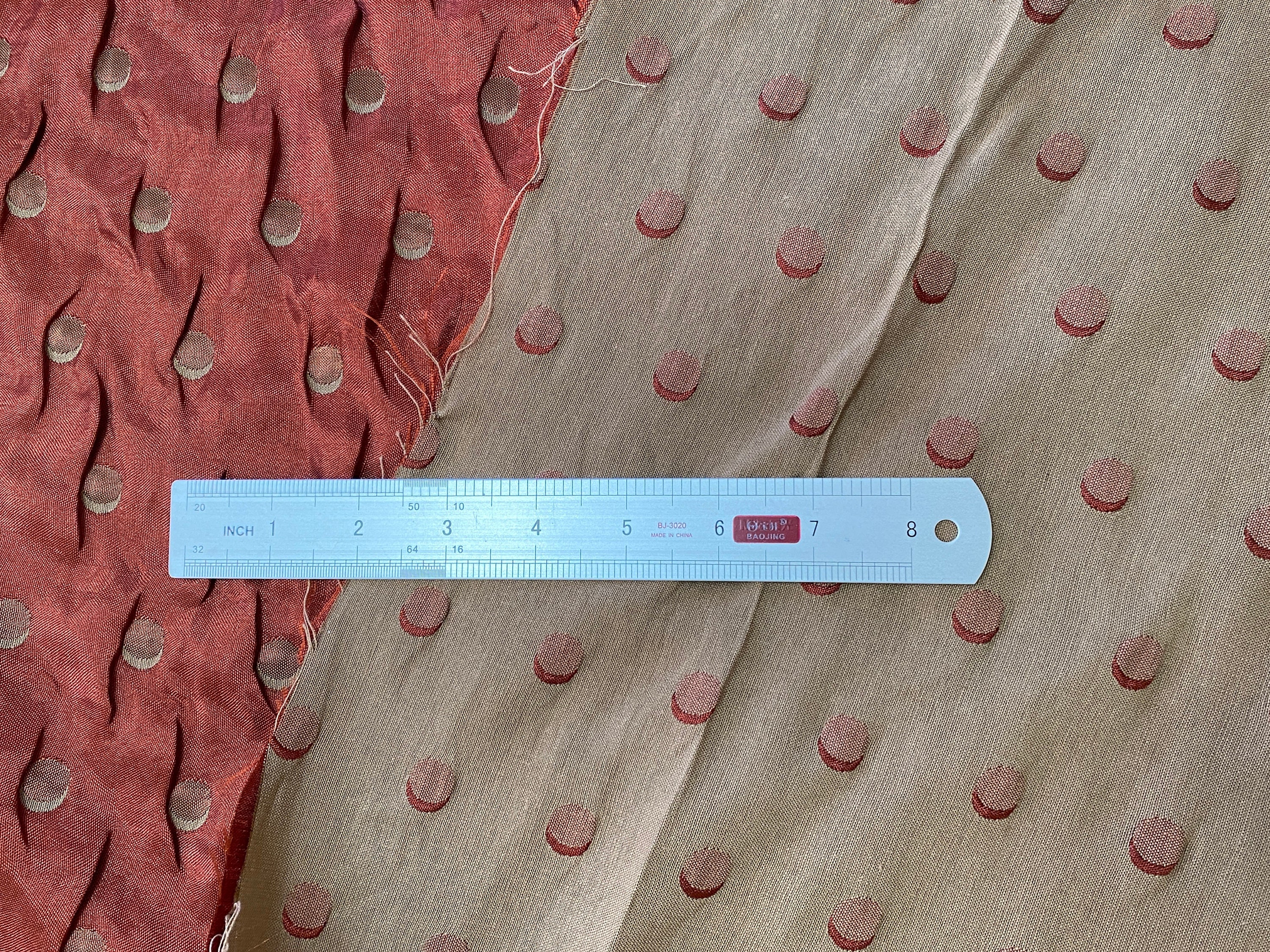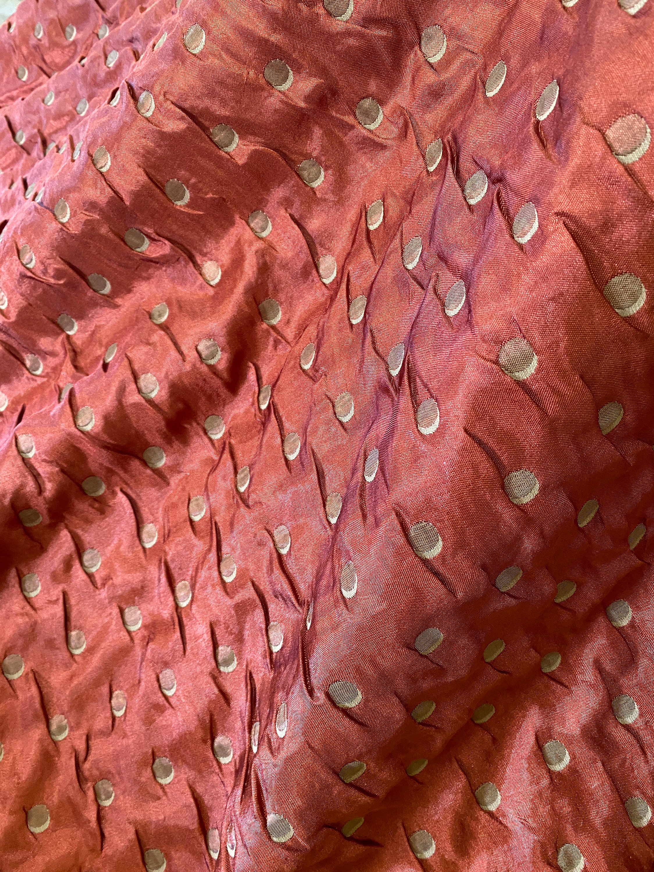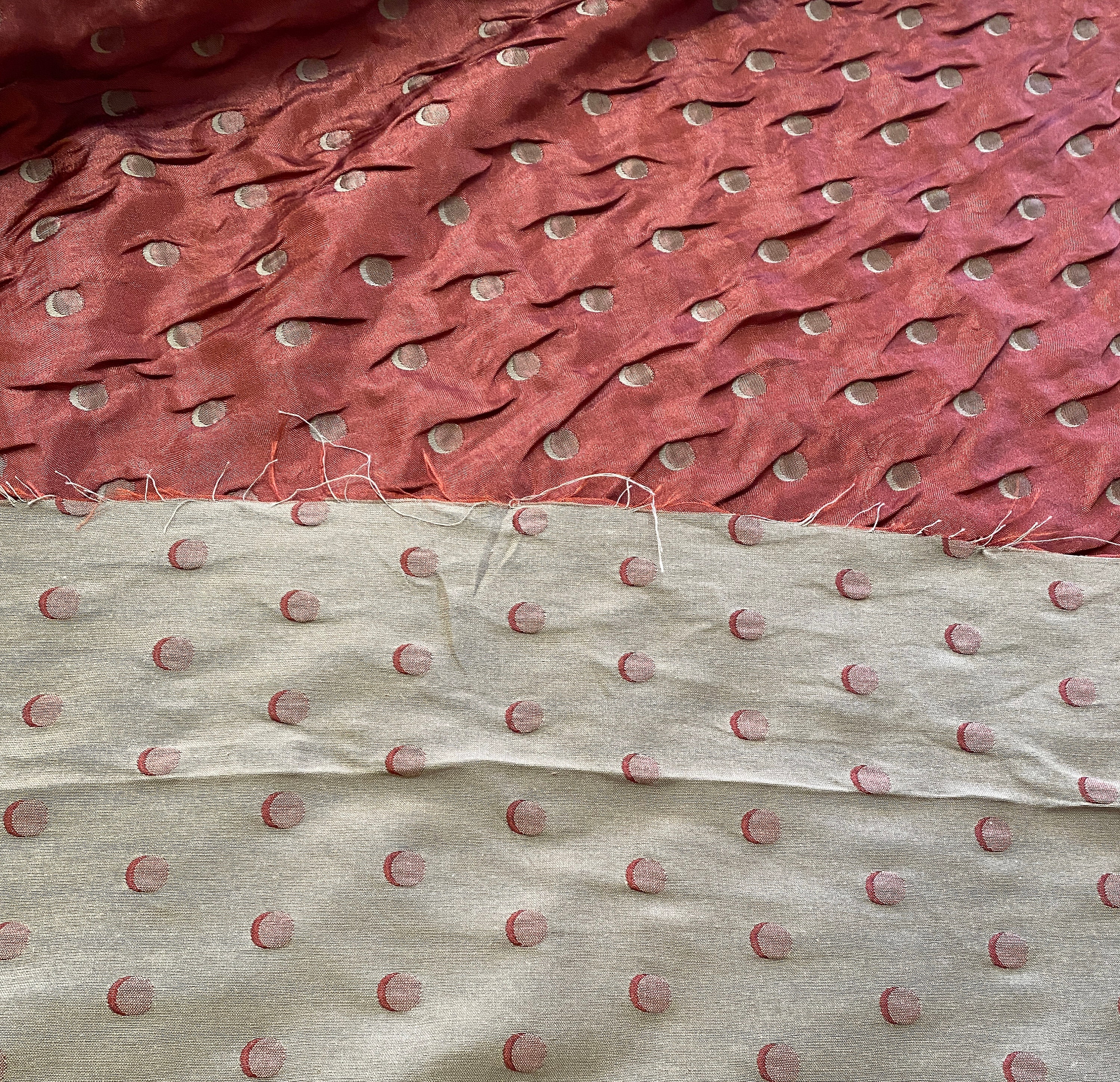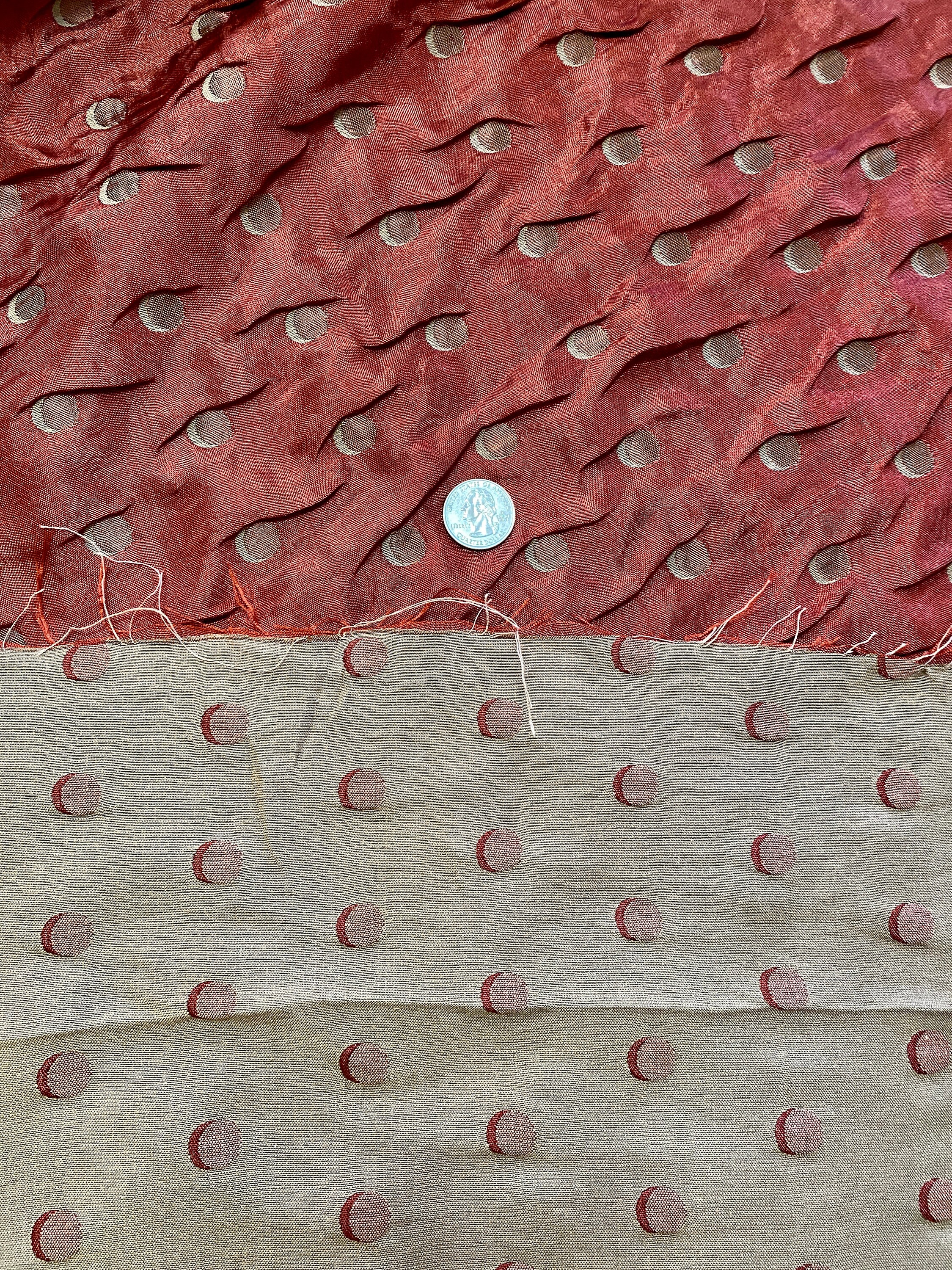 Unusual double layered fabric; a fine metallic copper rust woven together on the selvages with a thicker light khaki. The two pieces are further embroidered/quilted together with contrasting thread to make crescent moons. The metallic side shows khaki embroidery, the khaki side shows the copper/rust embroidery.
