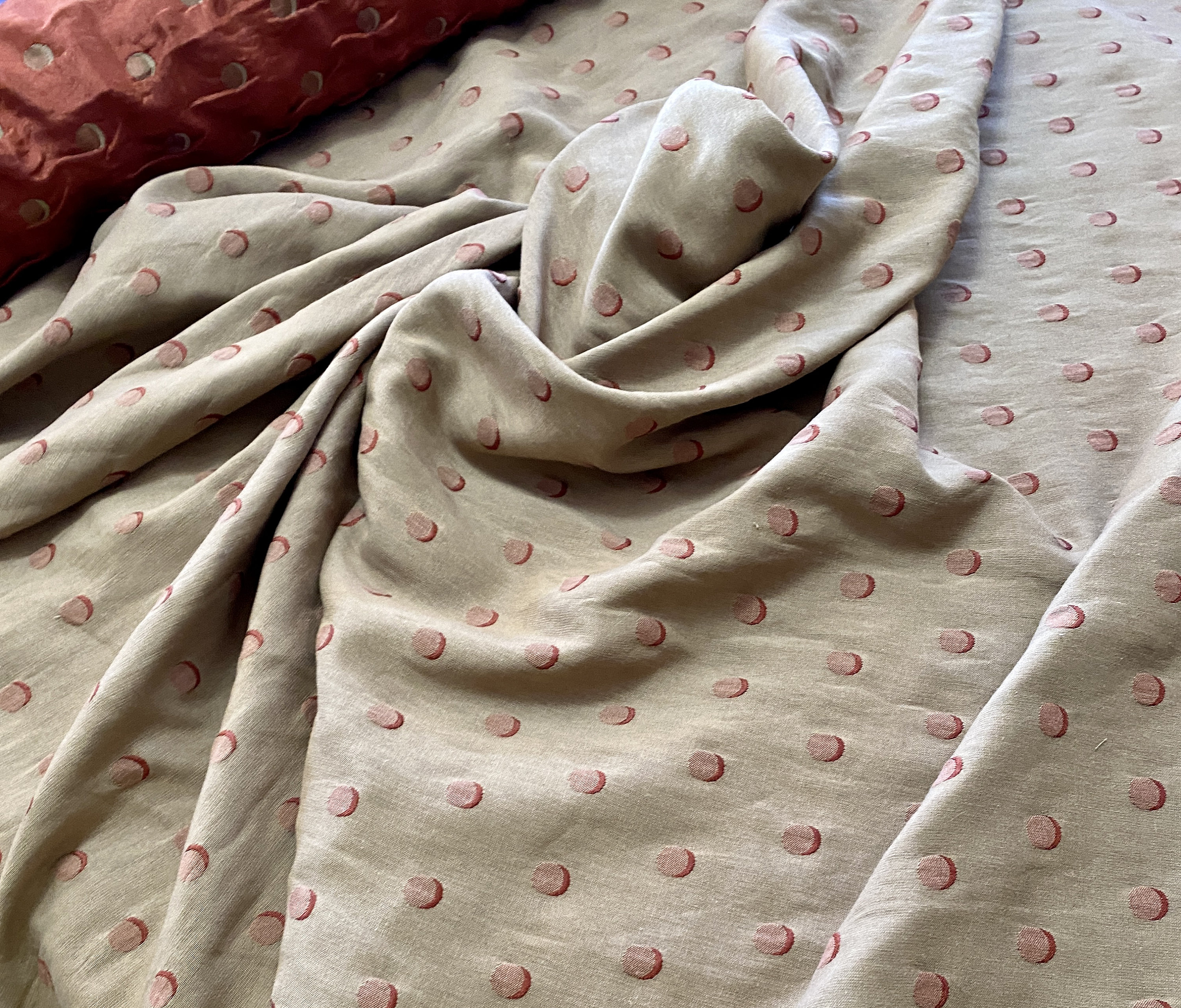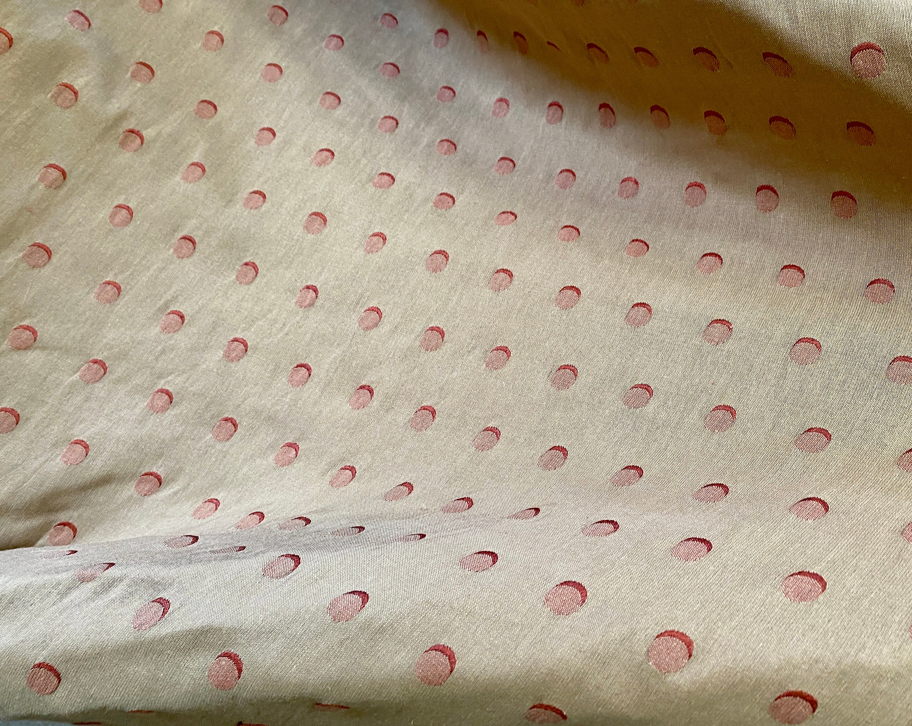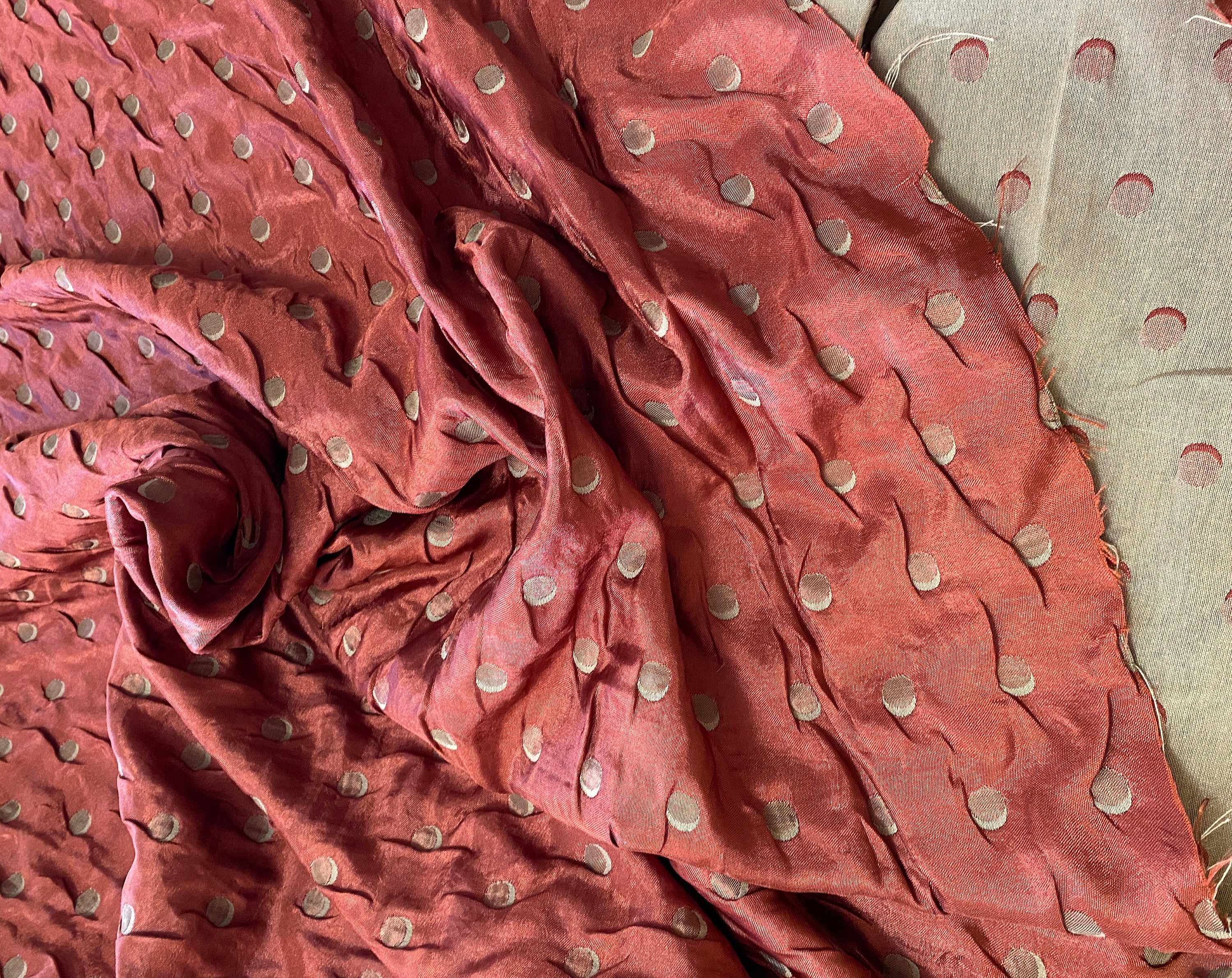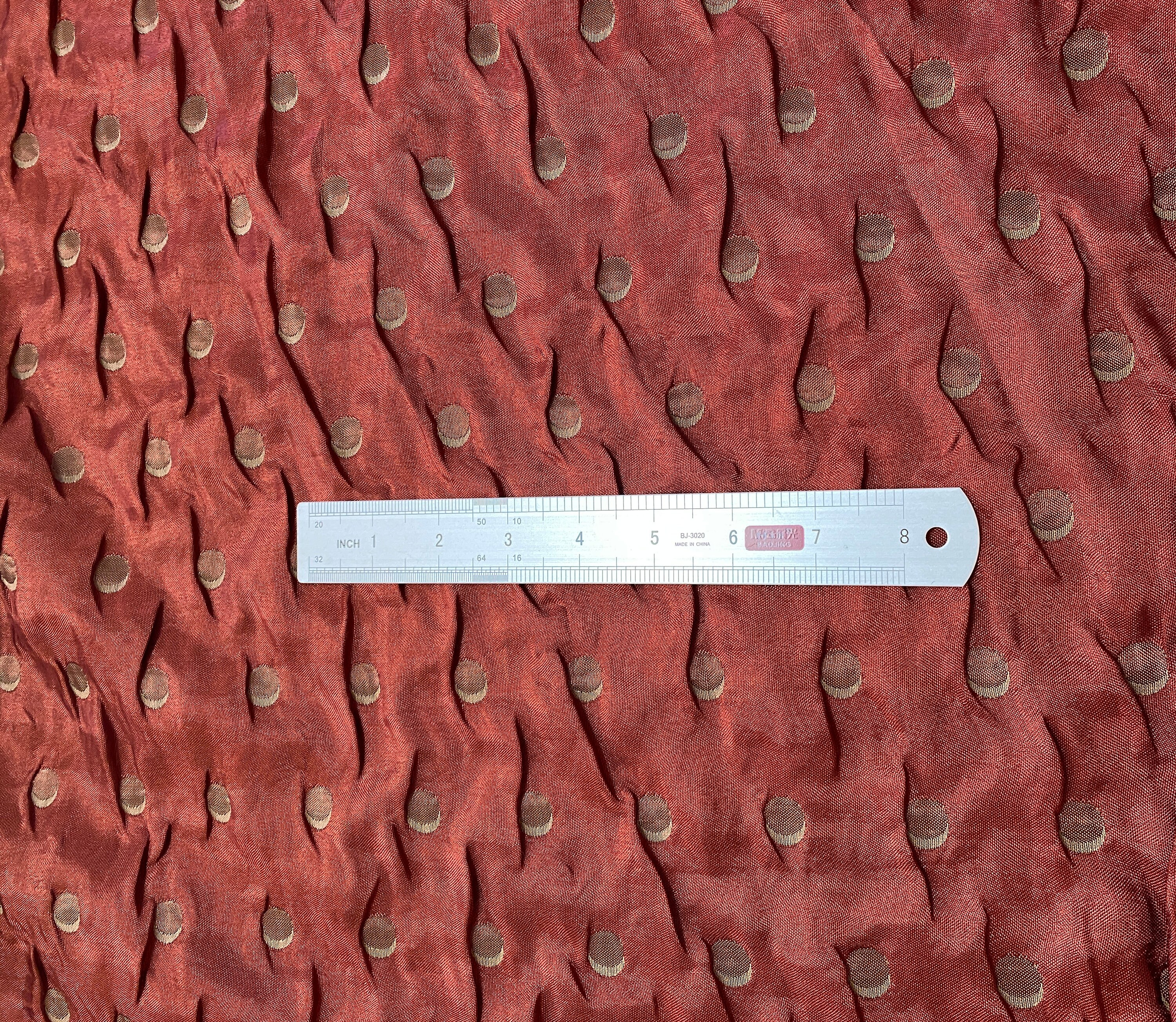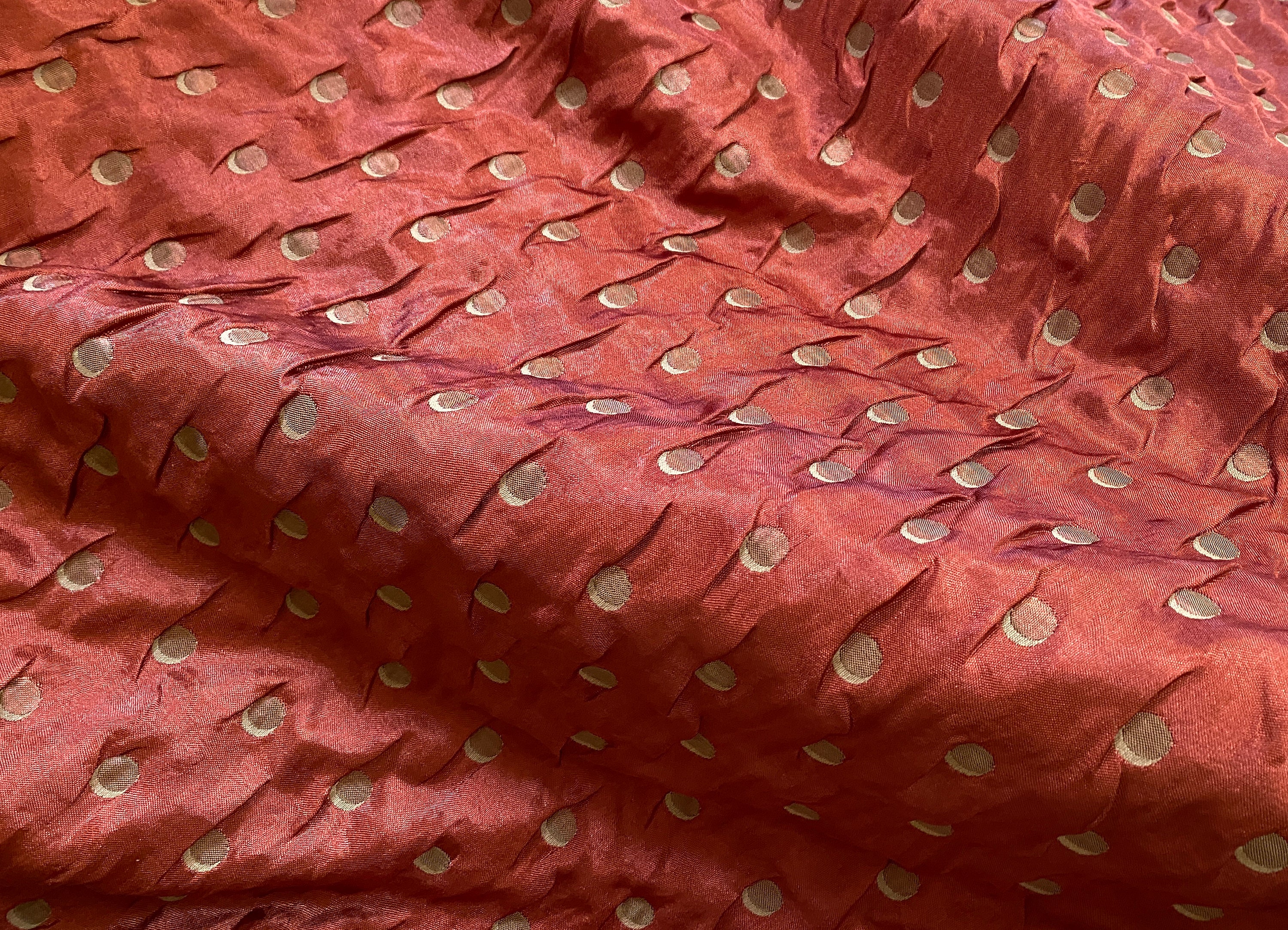 Unusual double layered fabric; a fine metallic copper rust woven together on the selvages with a thicker light khaki. The two pieces are further embroidered/quilted together with contrasting thread to make crescent moons. The metallic side shows khaki embroidery, the khaki side shows the copper/rust embroidery.