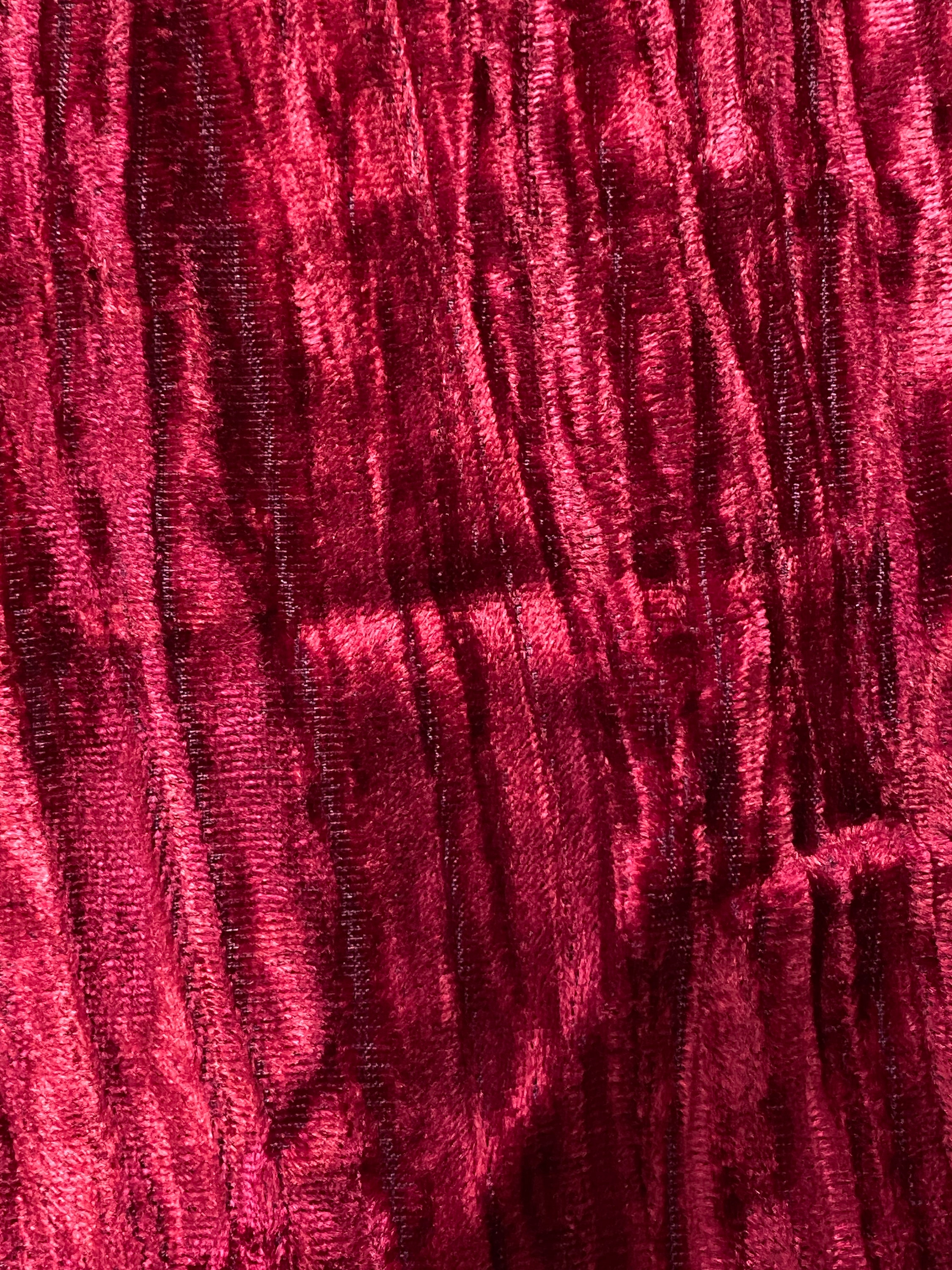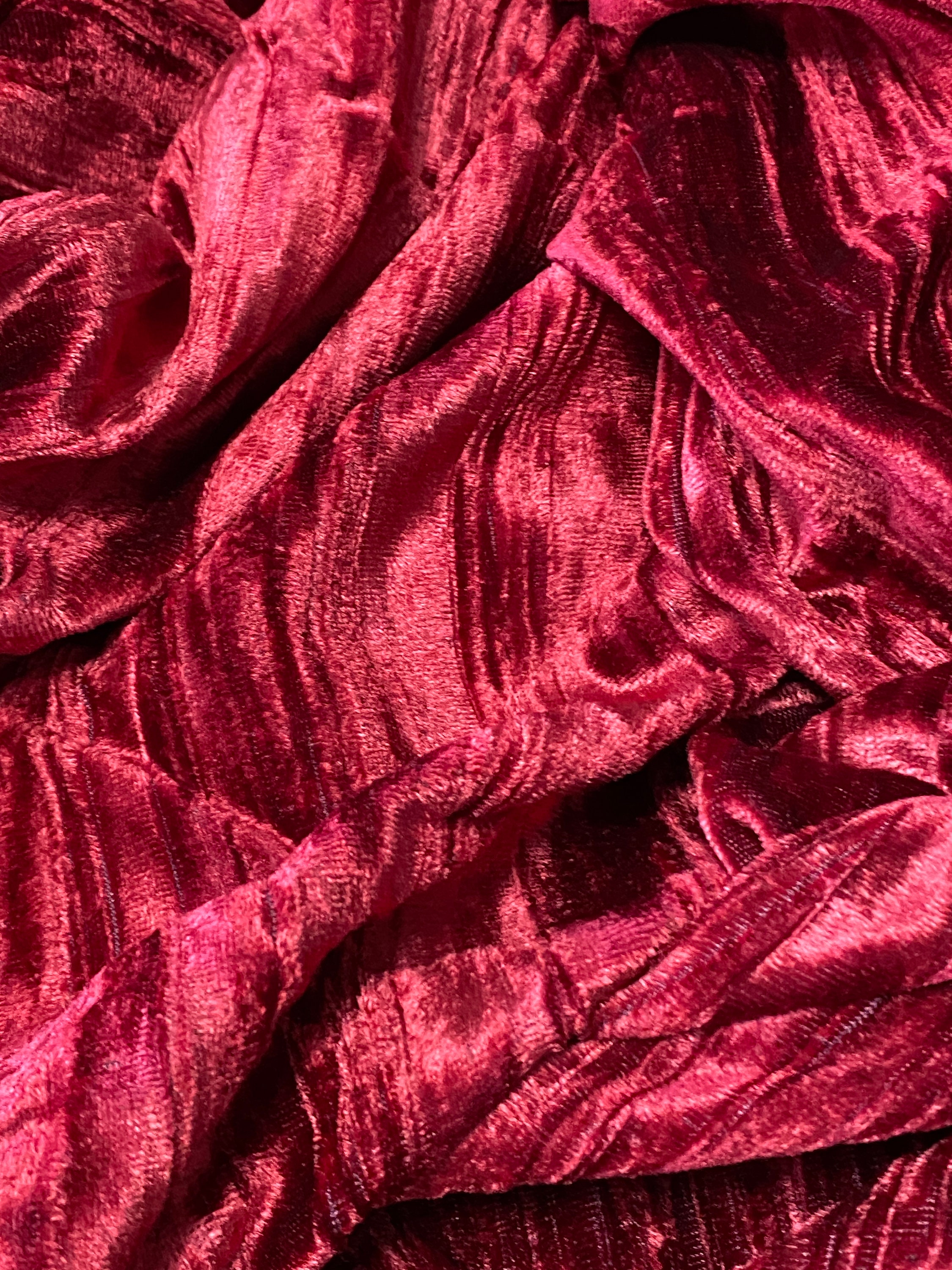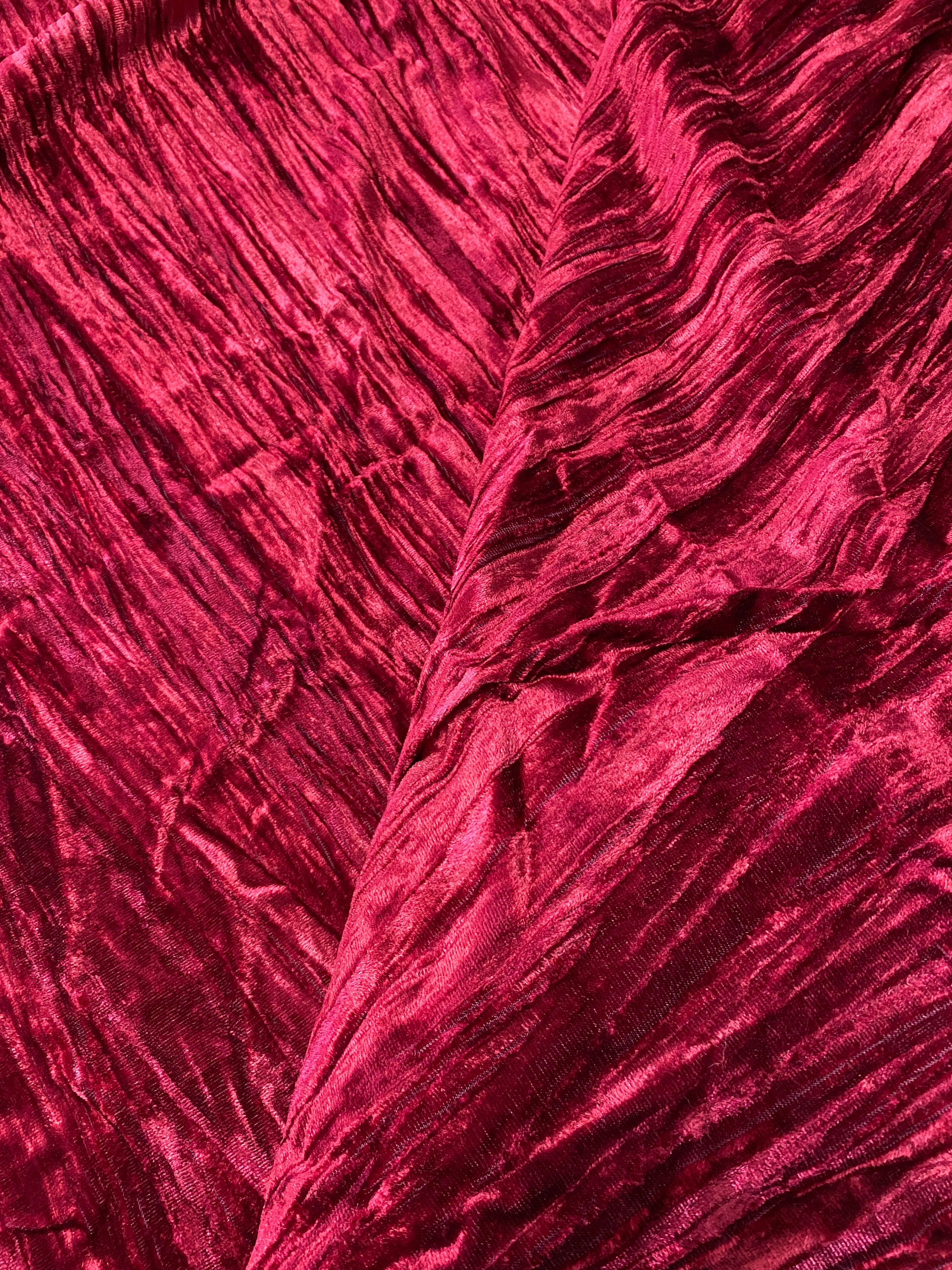 This is a gorgeous piece of crushed velvet. It is crushed lengthwise, like the old broomstick skirts used to be. The color is a vivid Ruby Red but, when the fabric moves different colors show depending on the light. I have seen true red to almost black to a purplish red show.
