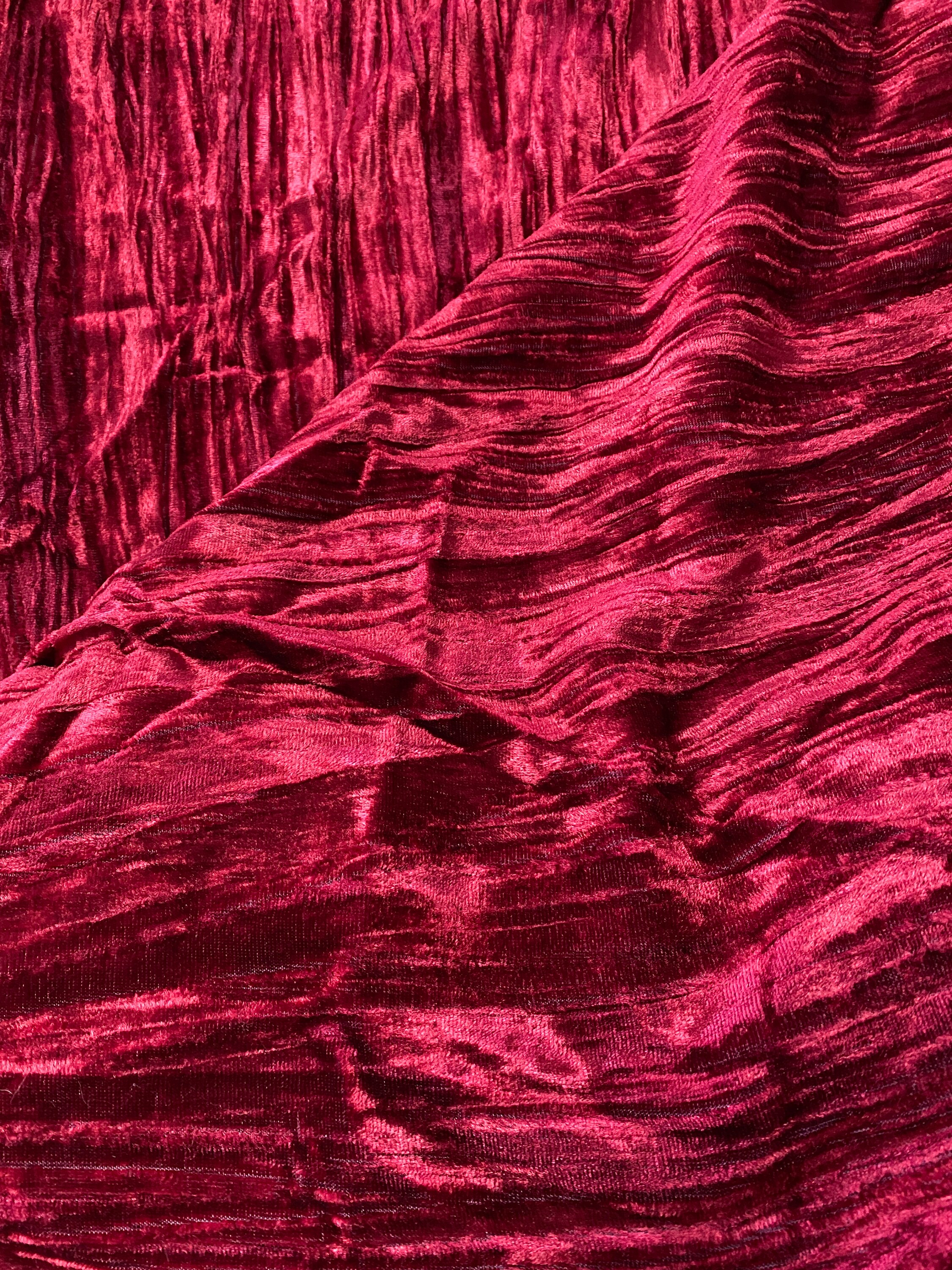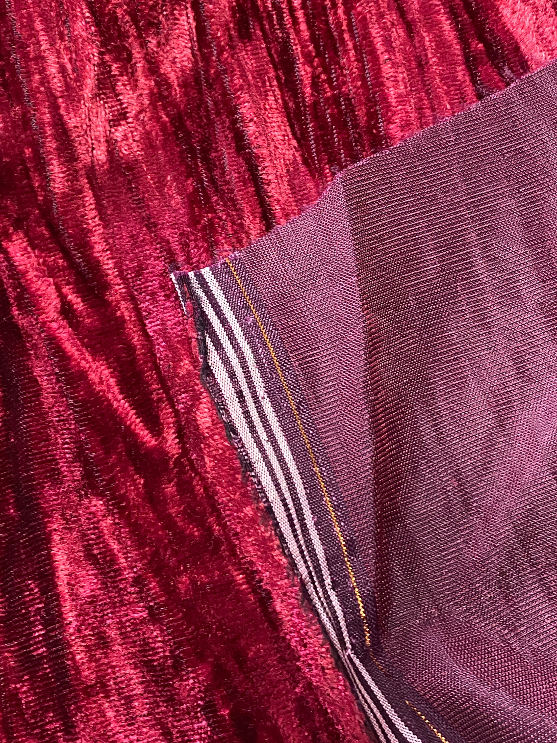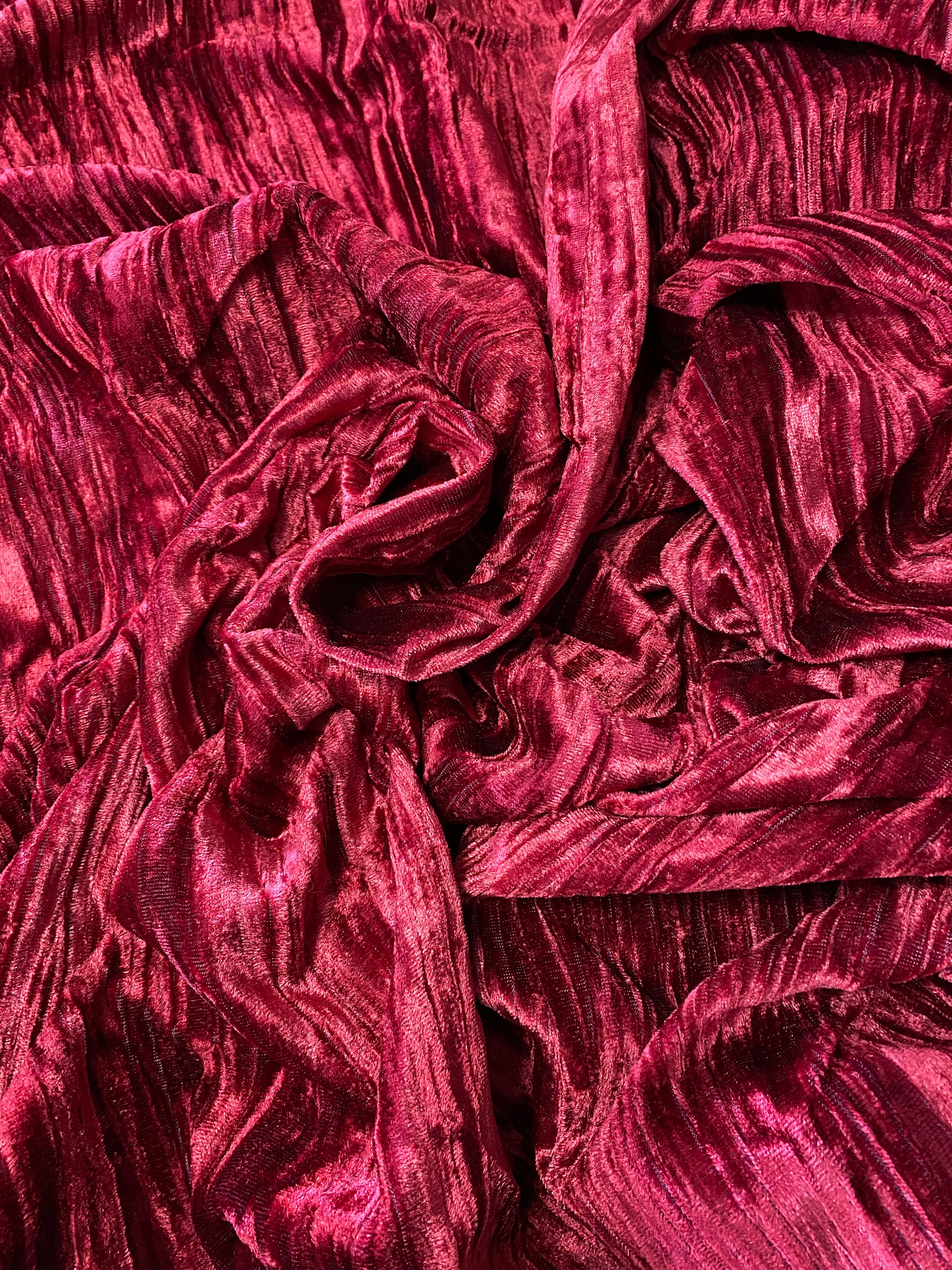 This is a gorgeous piece of crushed velvet. It is crushed lengthwise, like the old broomstick skirts used to be. The color is a vivid Ruby Red but, when the fabric moves different colors show depending on the light. I have seen true red to almost black to a purplish red show.
