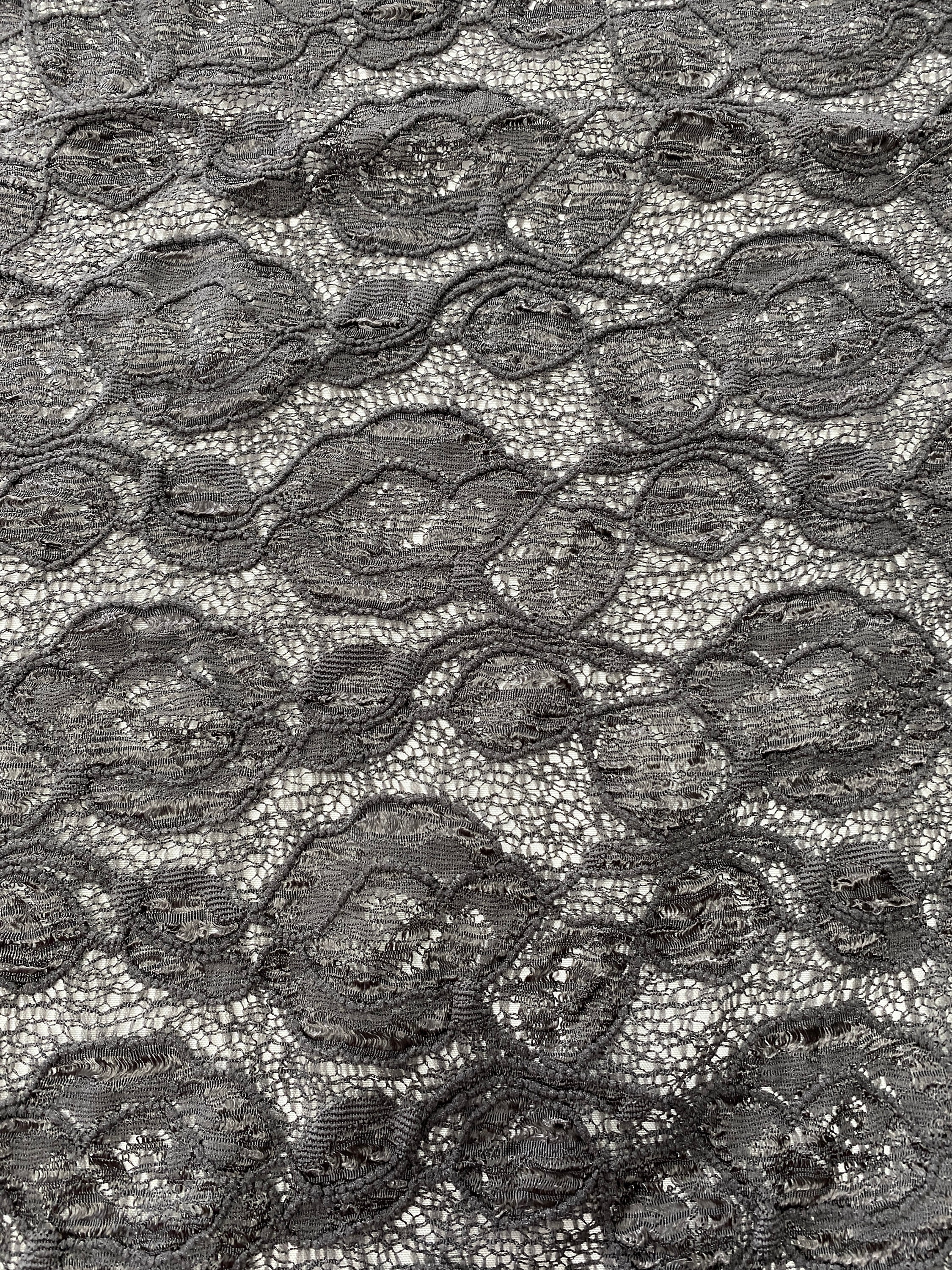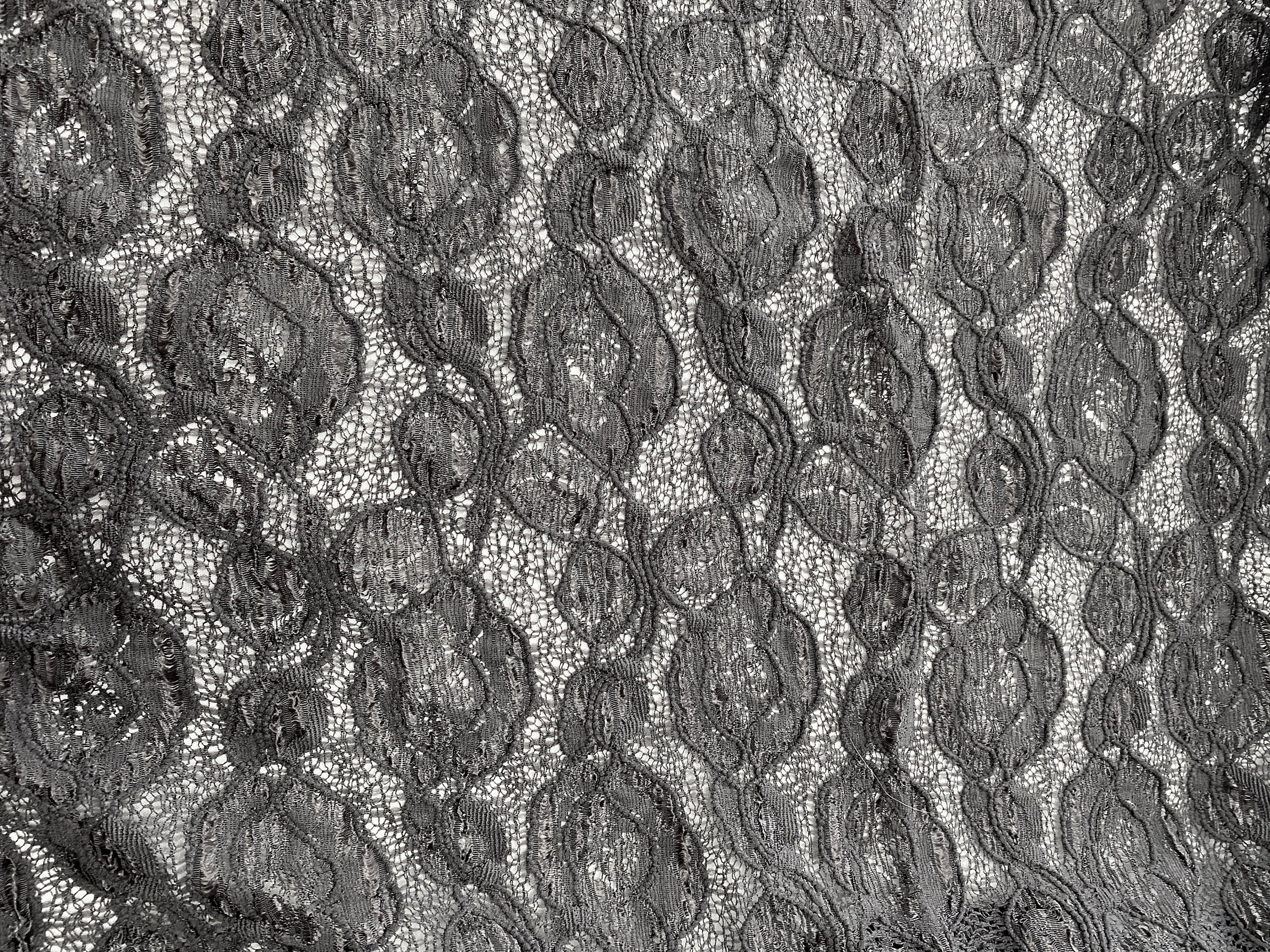 Floral embroidery over a lace backing with a raised/puckered/3-D effect. It looks like a charcoal color to me, not a true black & sometimes, in the right light, I can see a bit of lavender. Enough stretch to make it comfortable to wear, but not enough for you to find it at your feet.