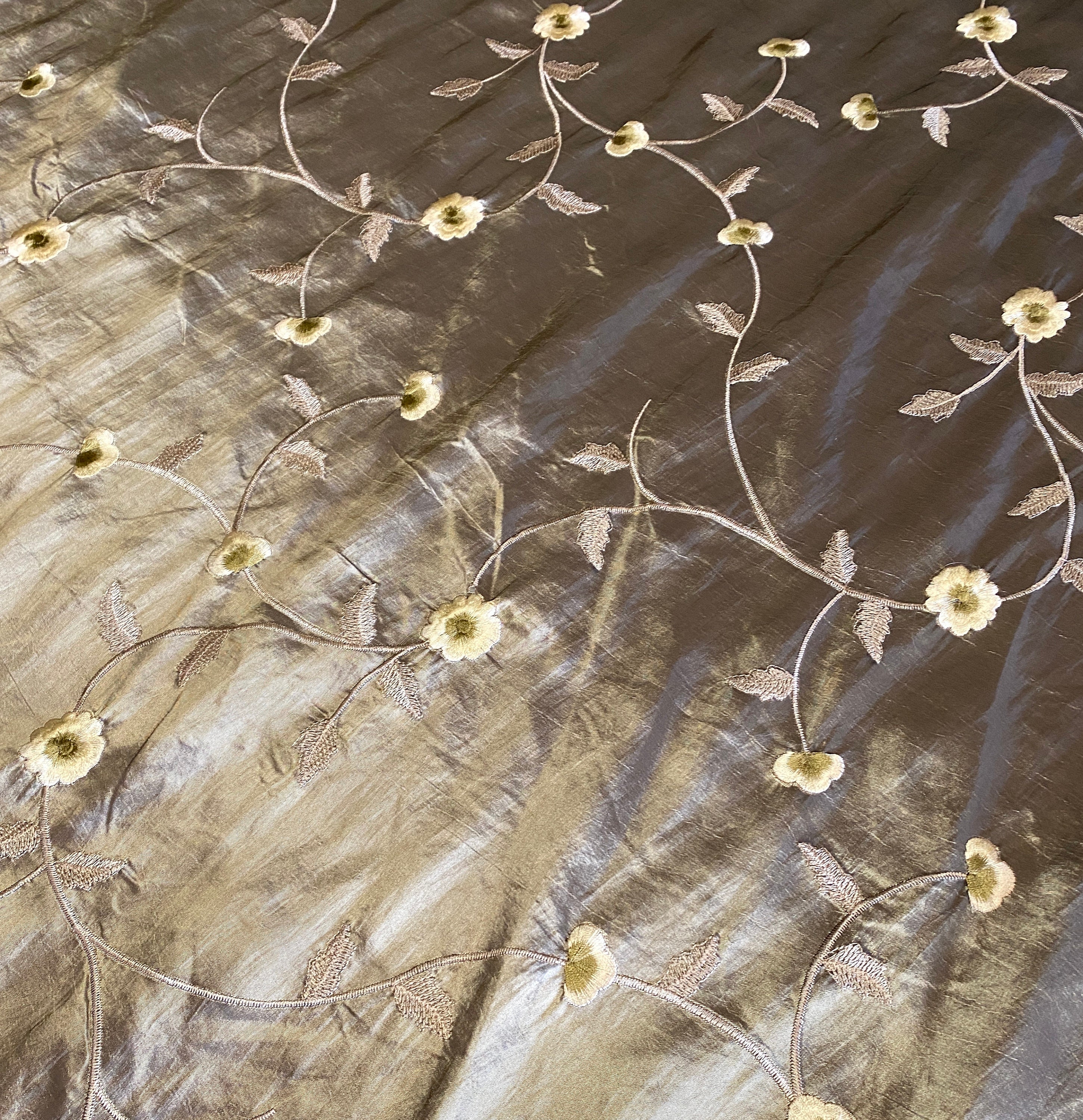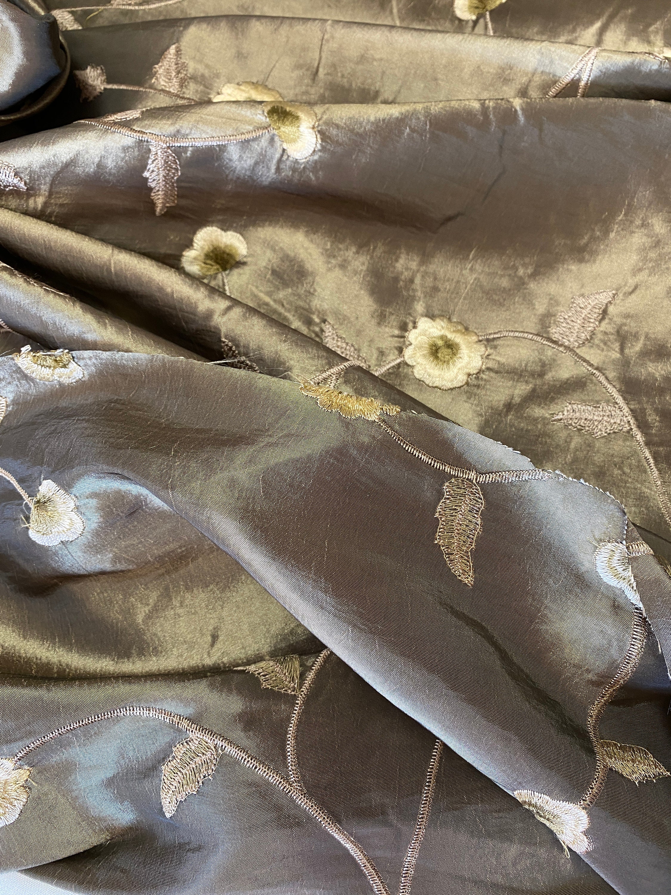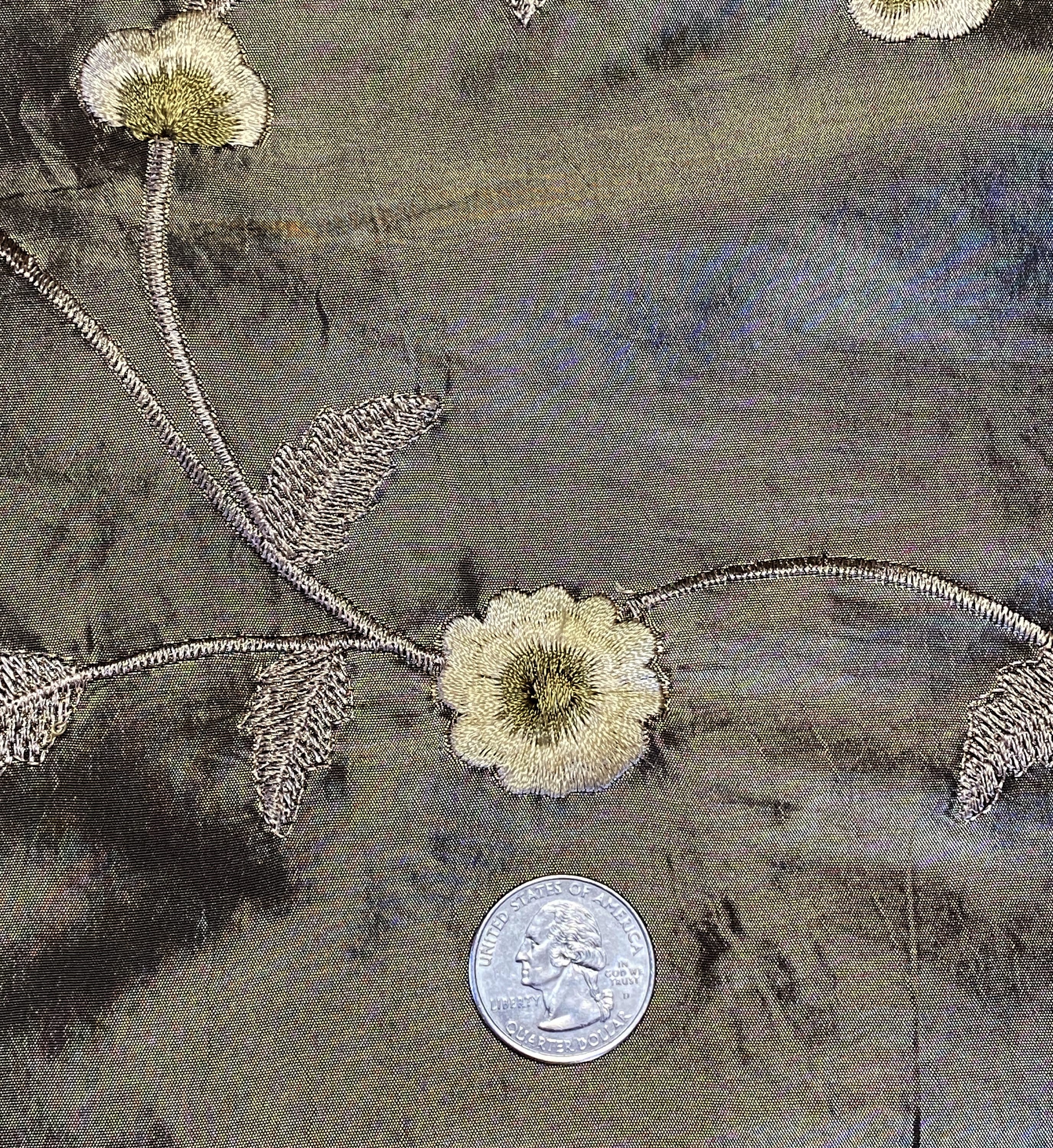 Embroidered with ecru & gold thread in a floral/vine pattern. The pattern is identical on each side.