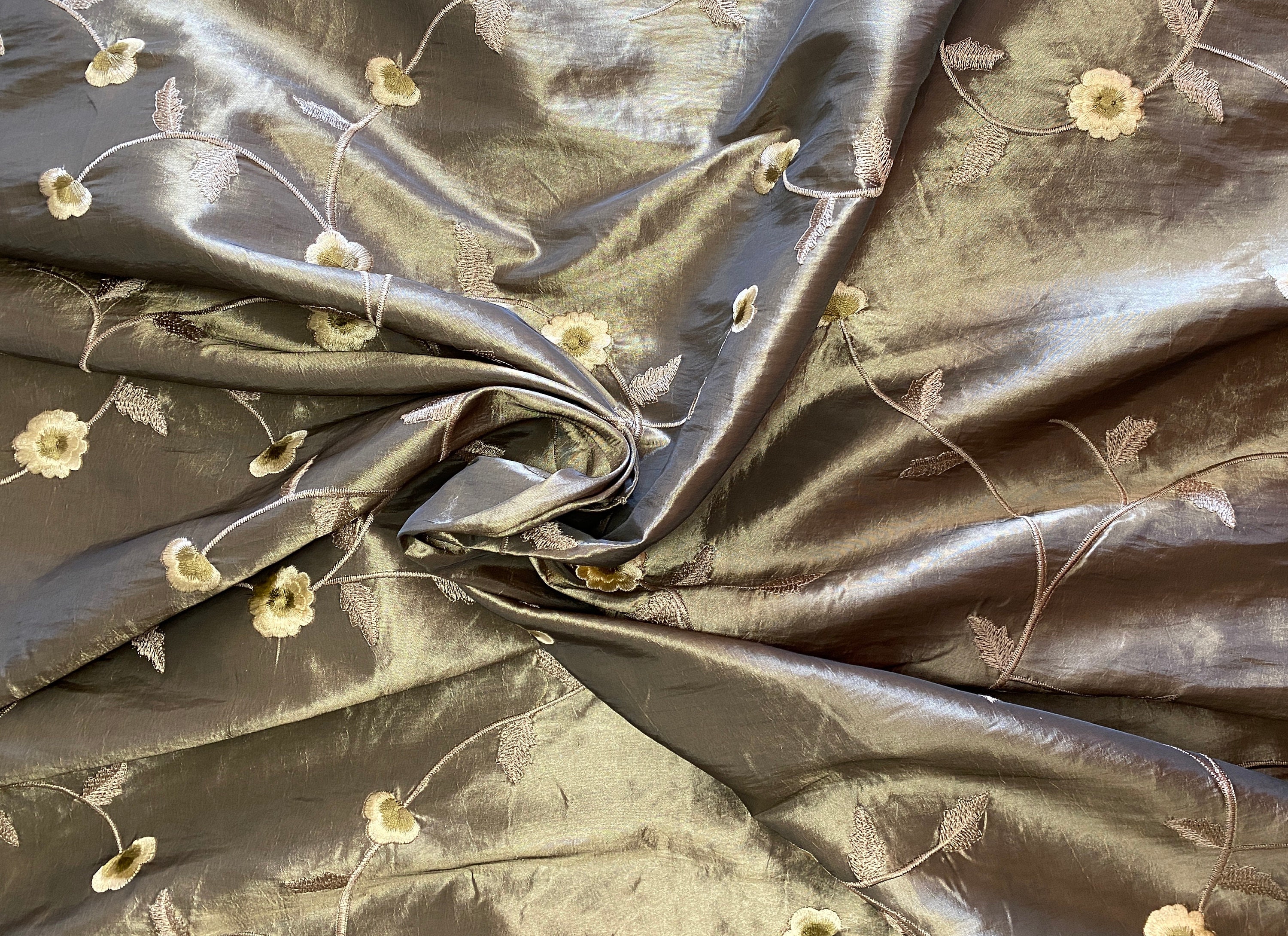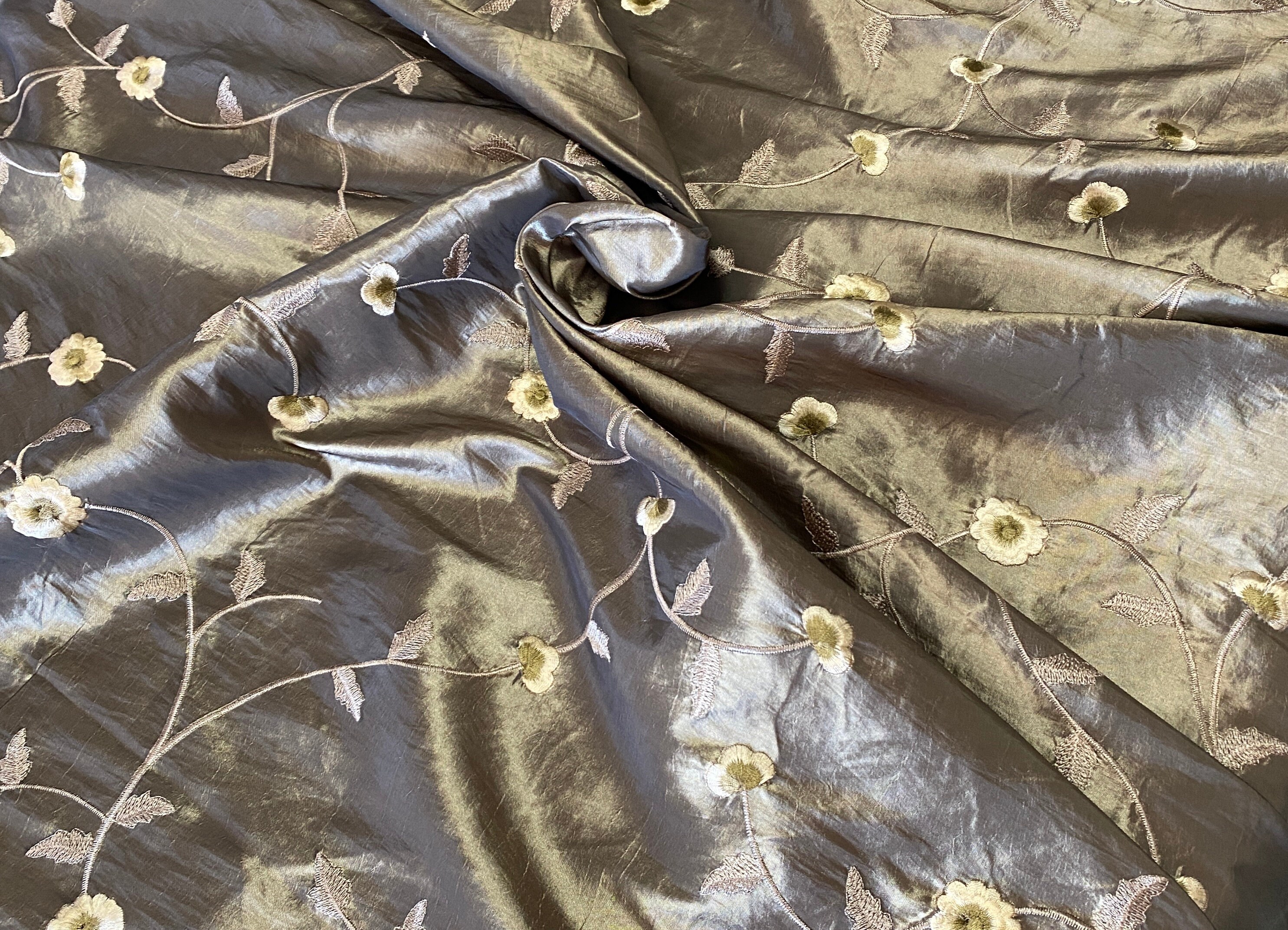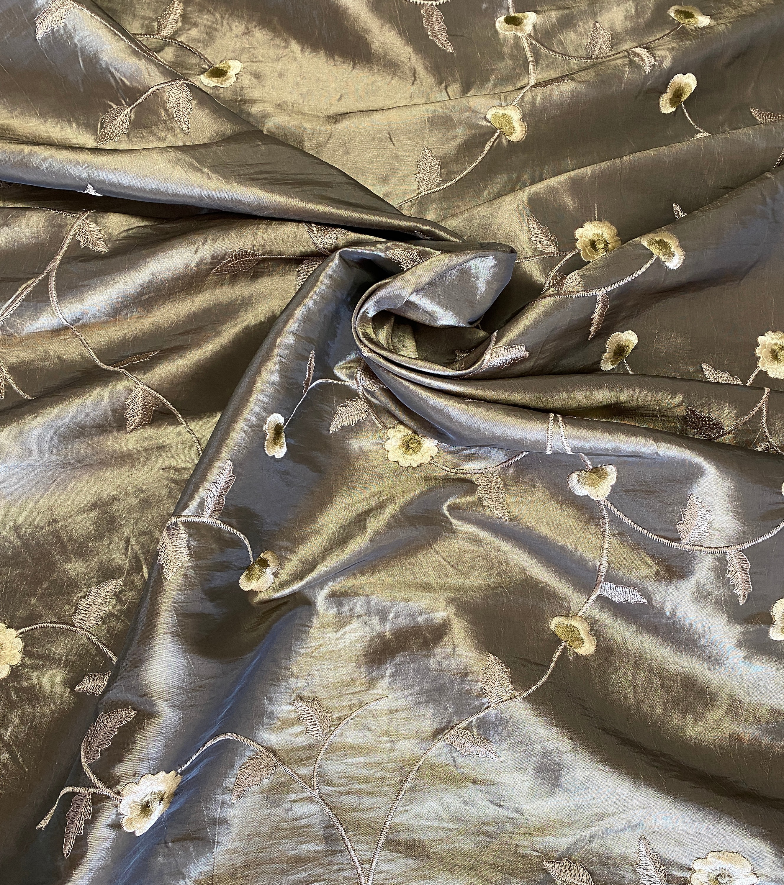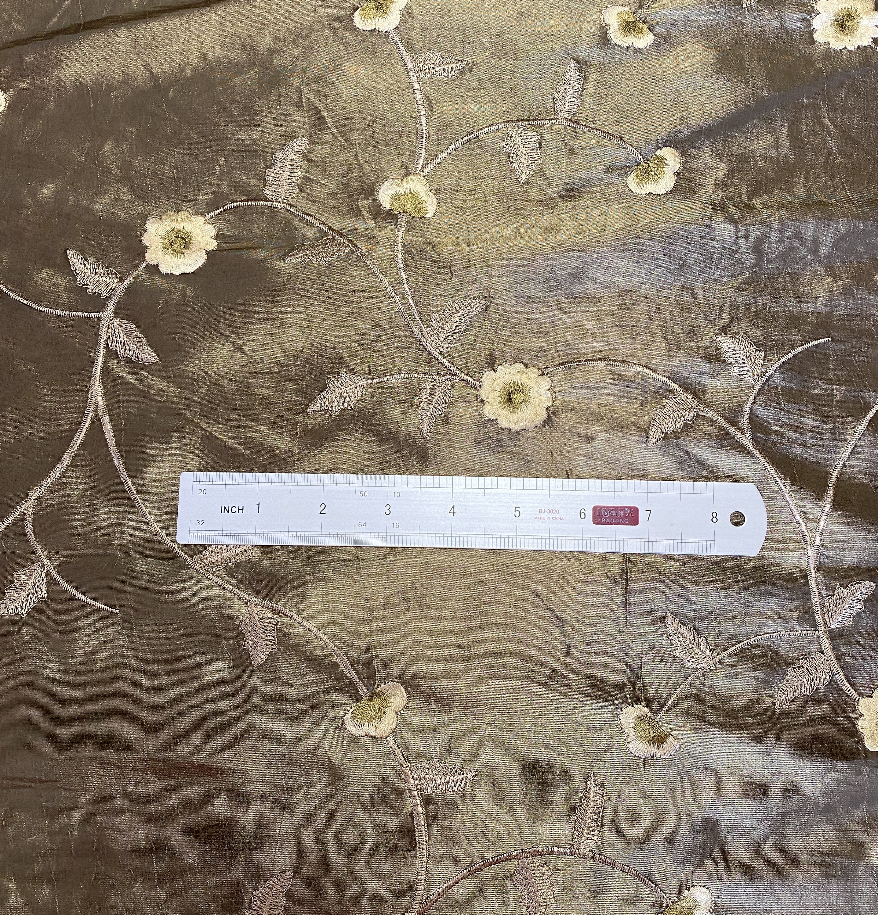 Embroidered with ecru & gold thread in a floral/vine pattern. The pattern is identical on each side.
