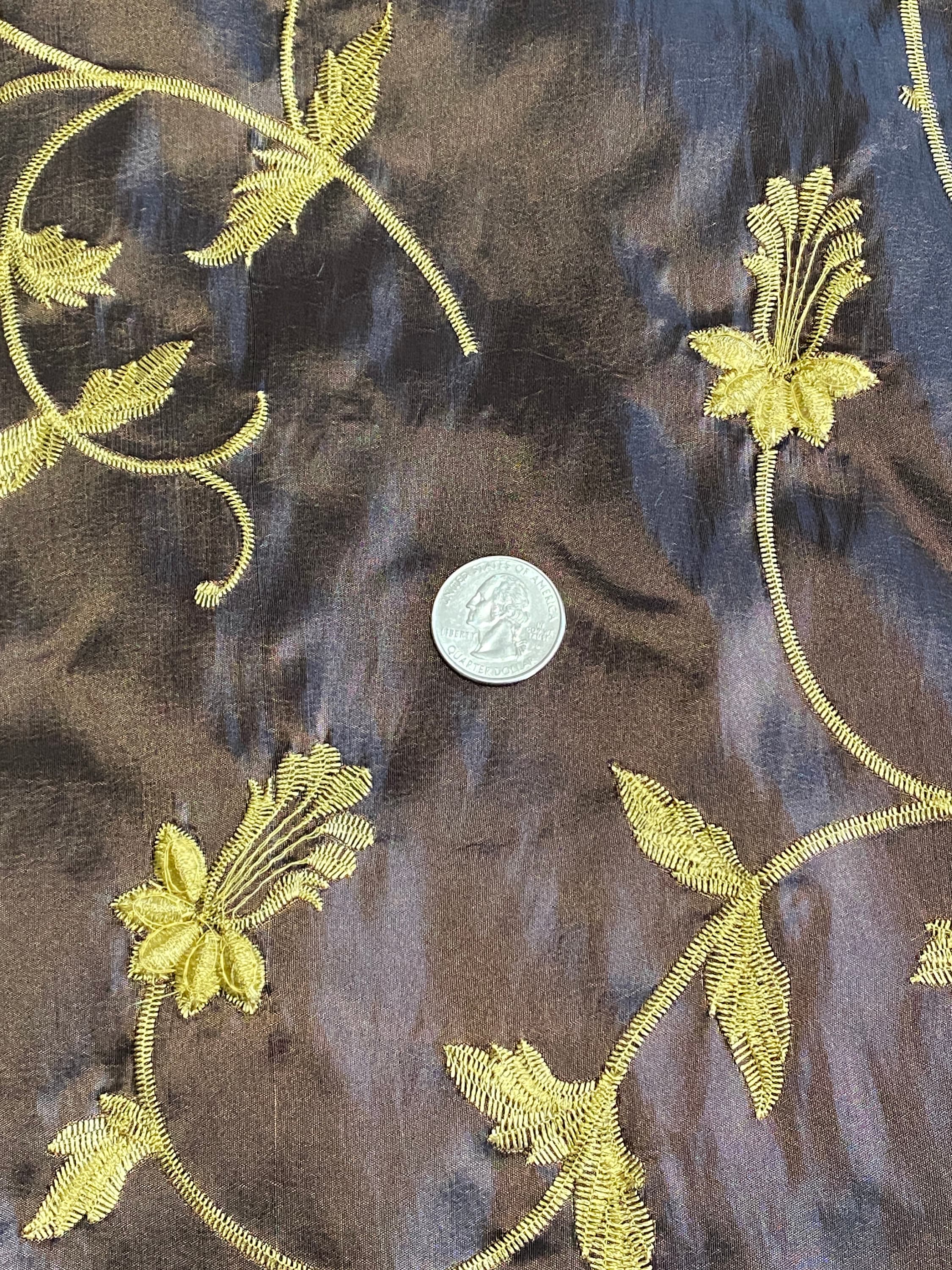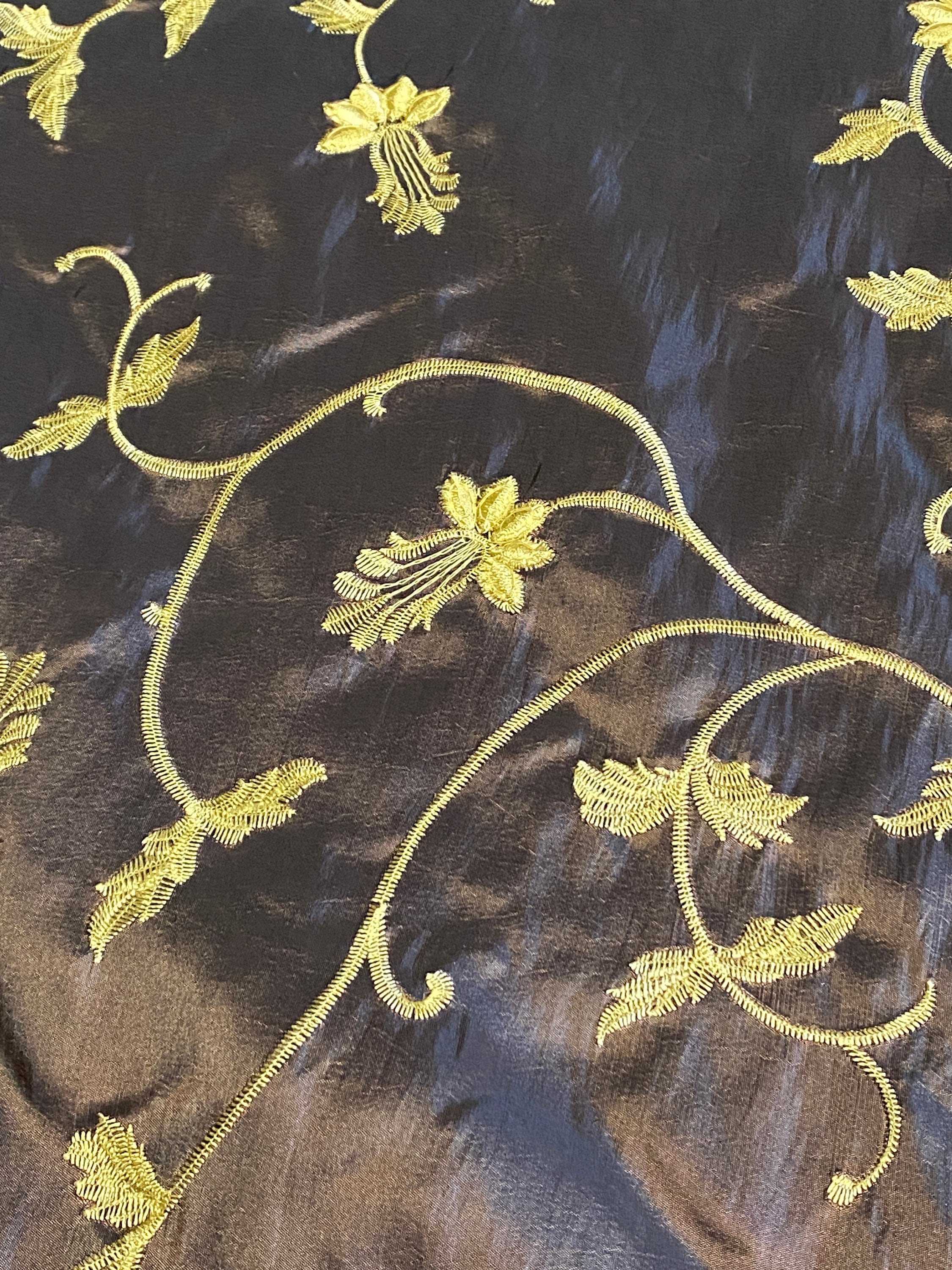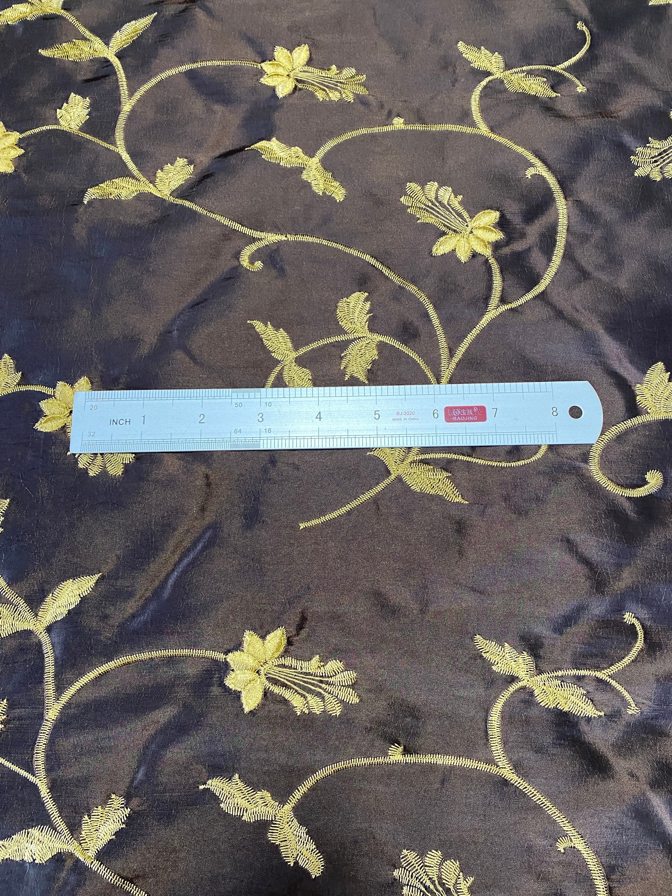 Can you imagine a medieval dress made from this? This fabric is a rich, chocolate brown taffeta with that luxurious sheen, embroidered with vining trumpet-shaped flowers of golden thread.