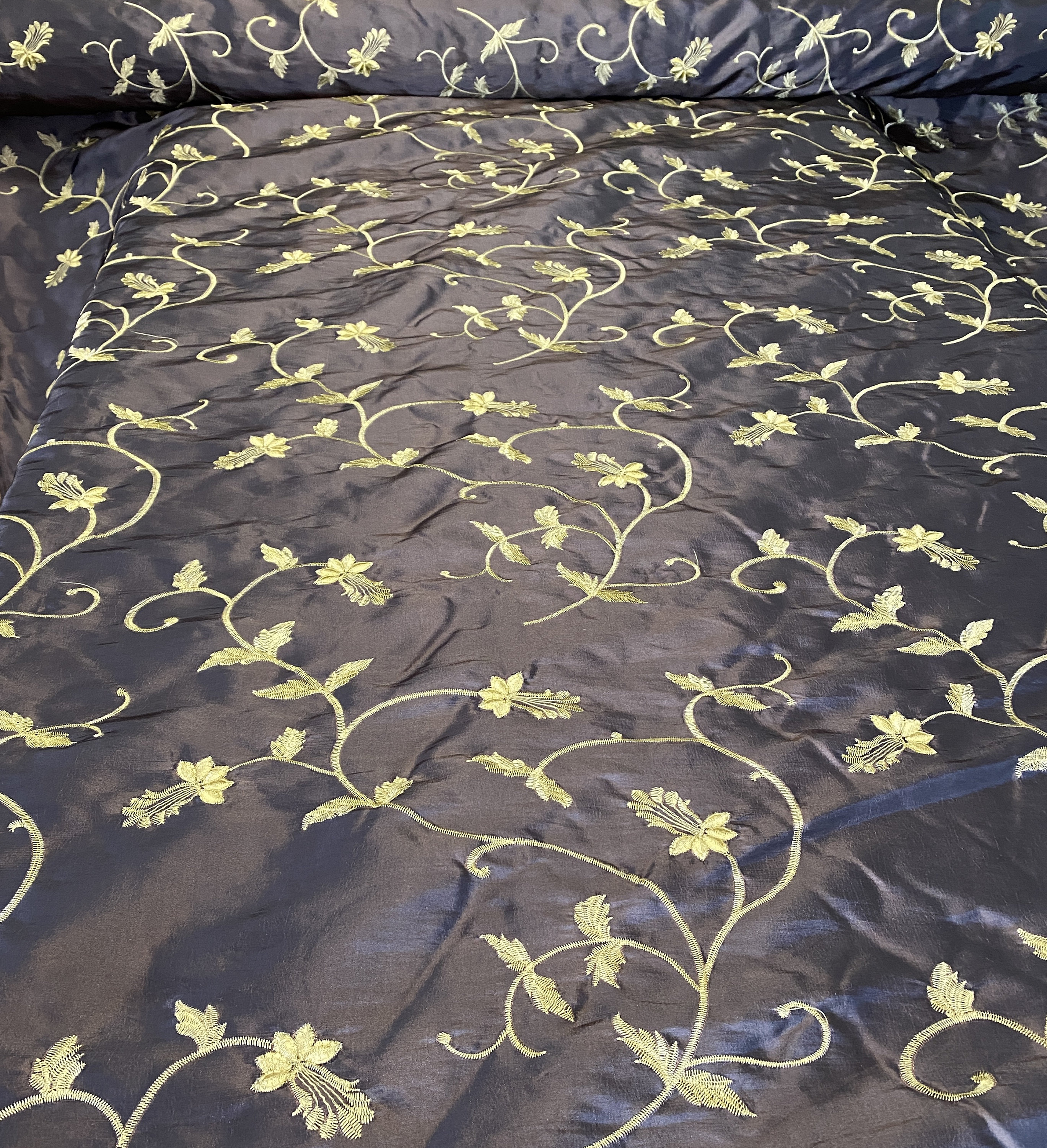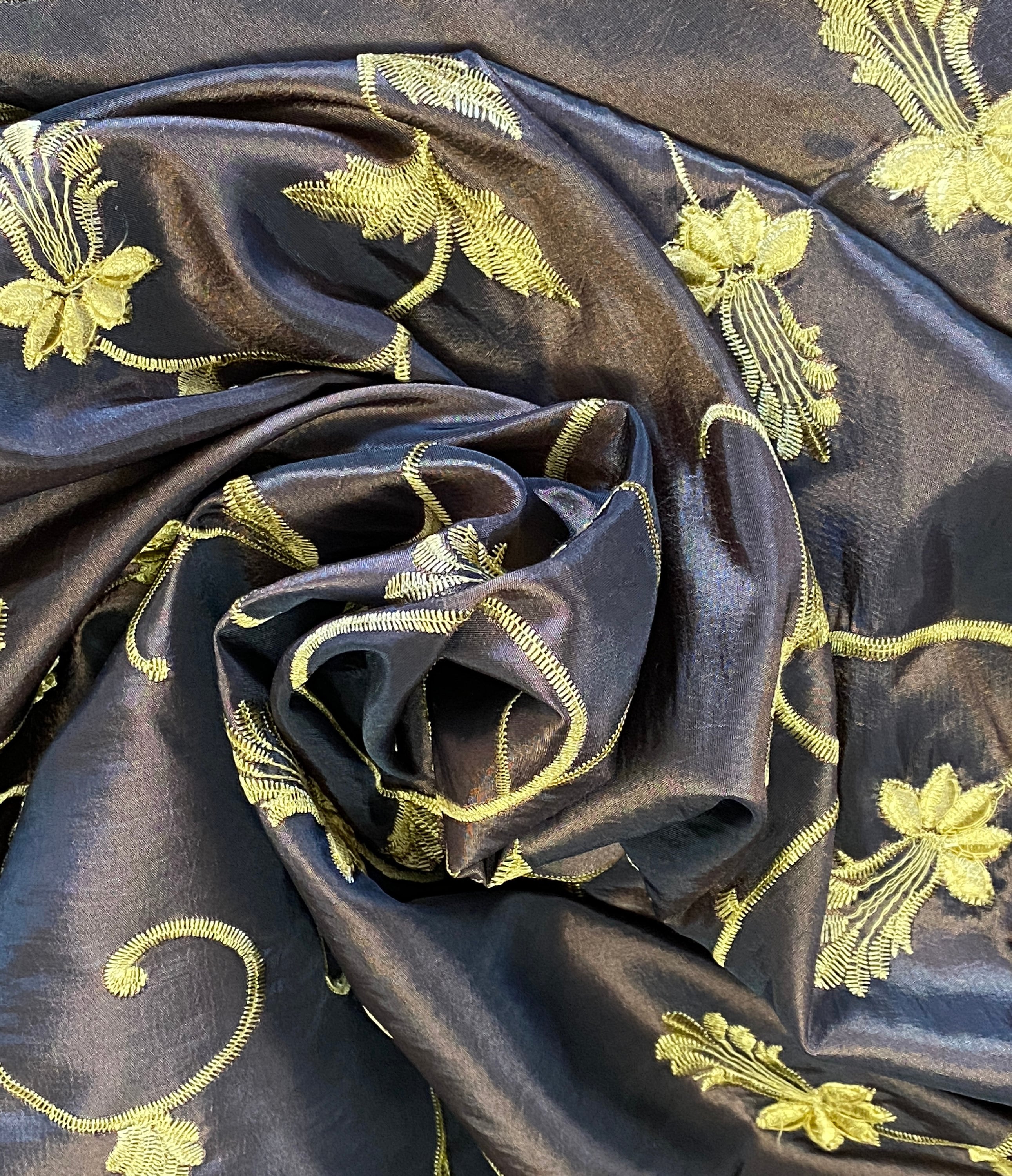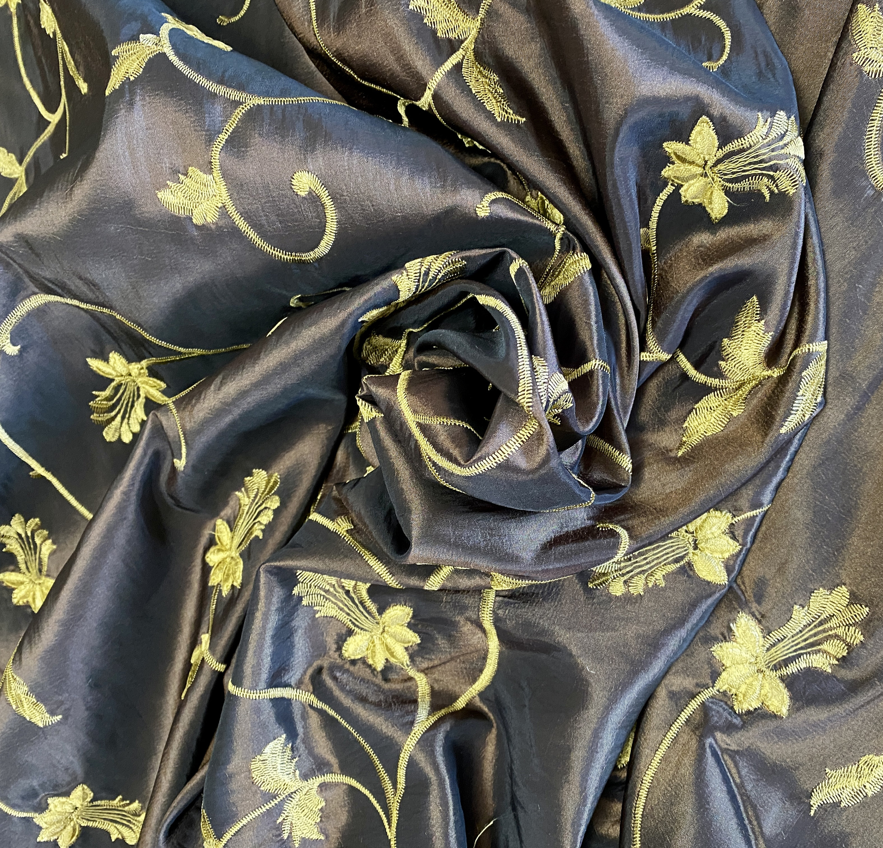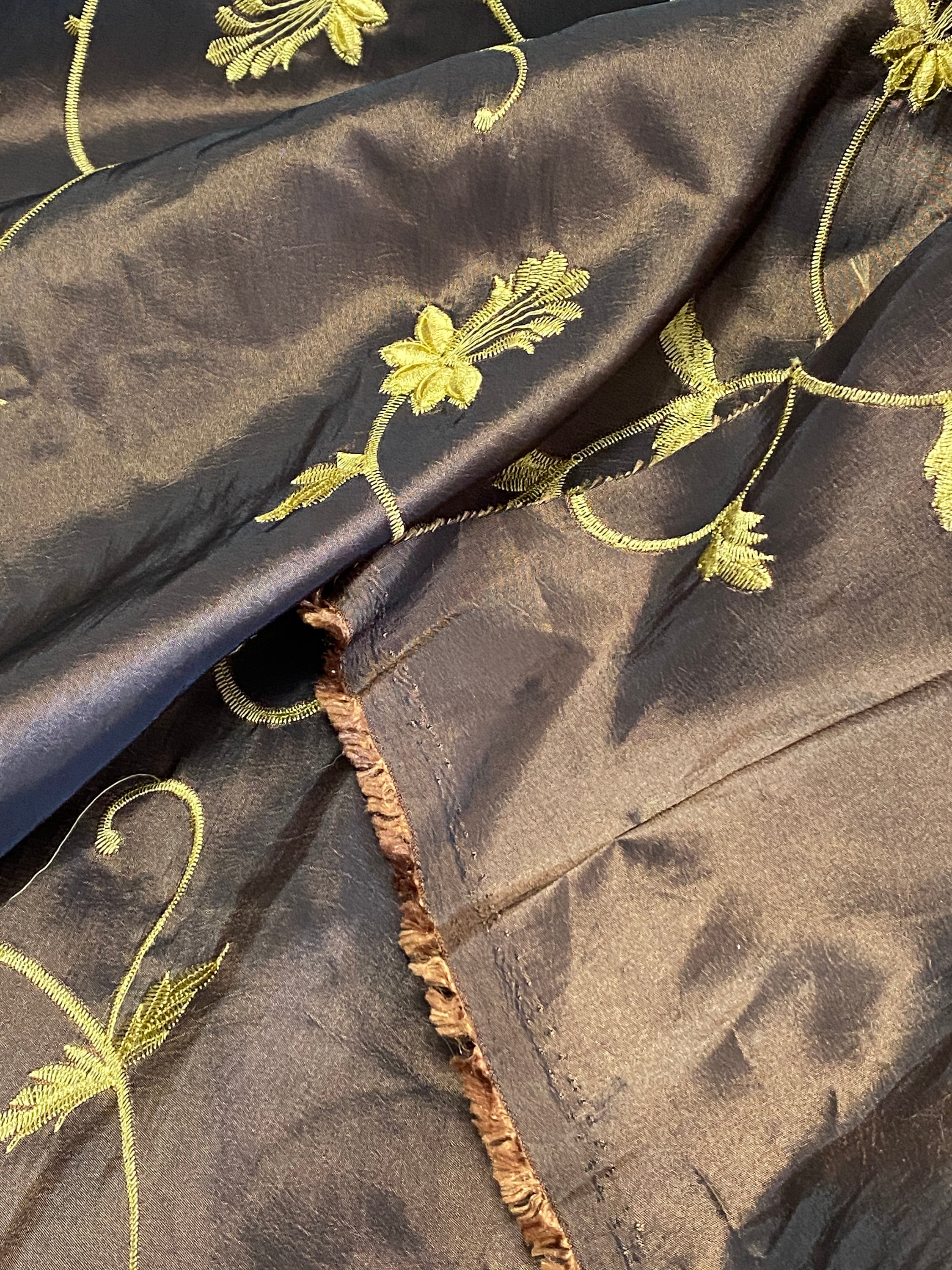 Can you imagine a medieval dress made from this? This fabric is a rich, chocolate brown taffeta with that luxurious sheen, embroidered with vining trumpet-shaped flowers of golden thread.