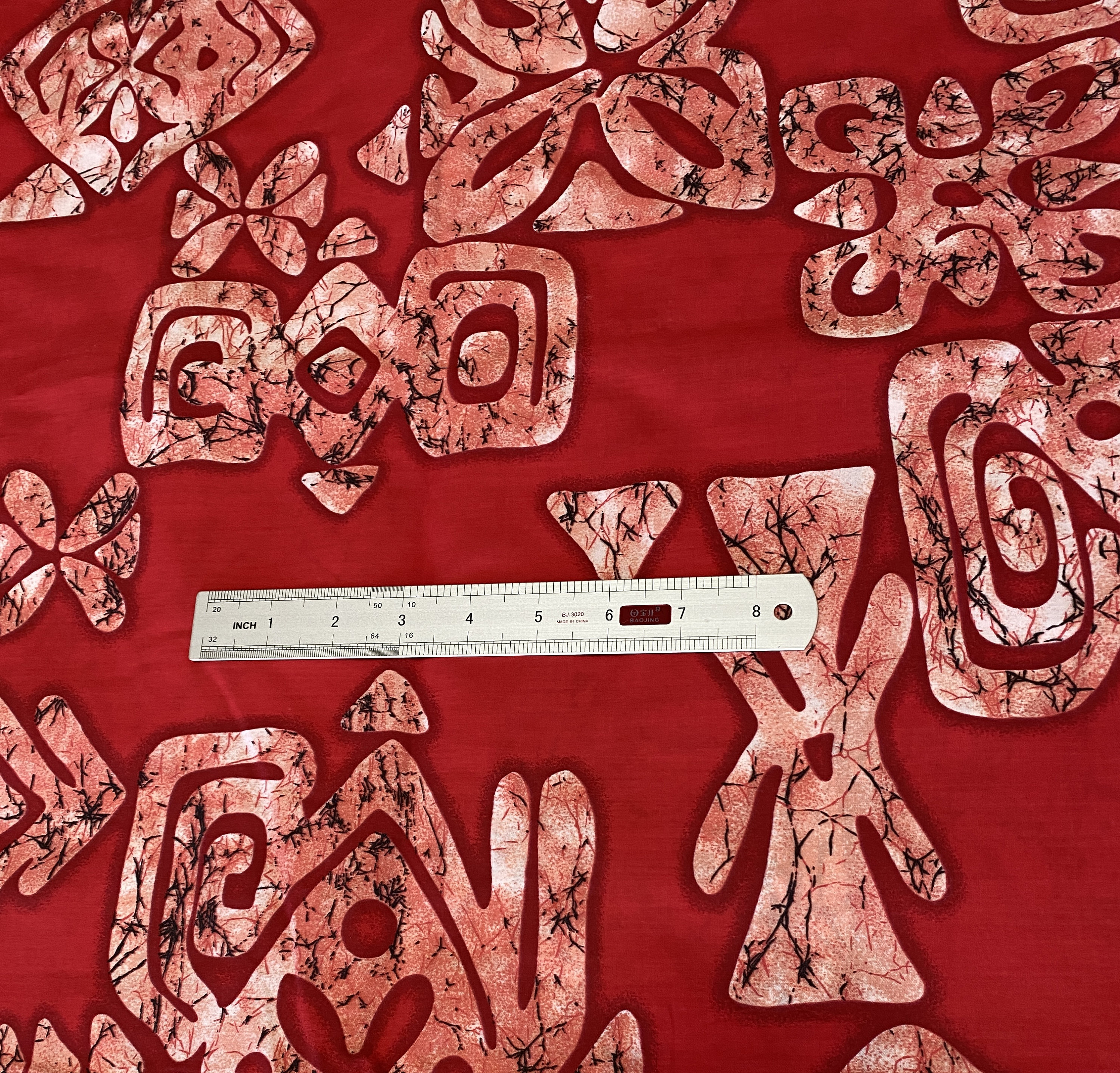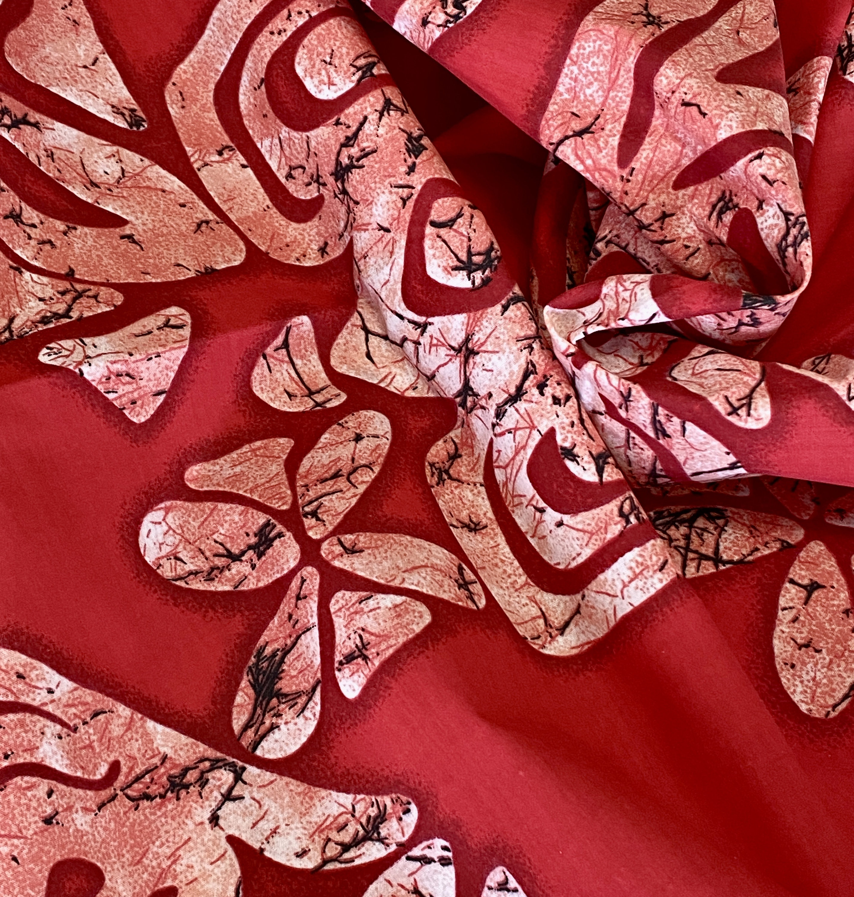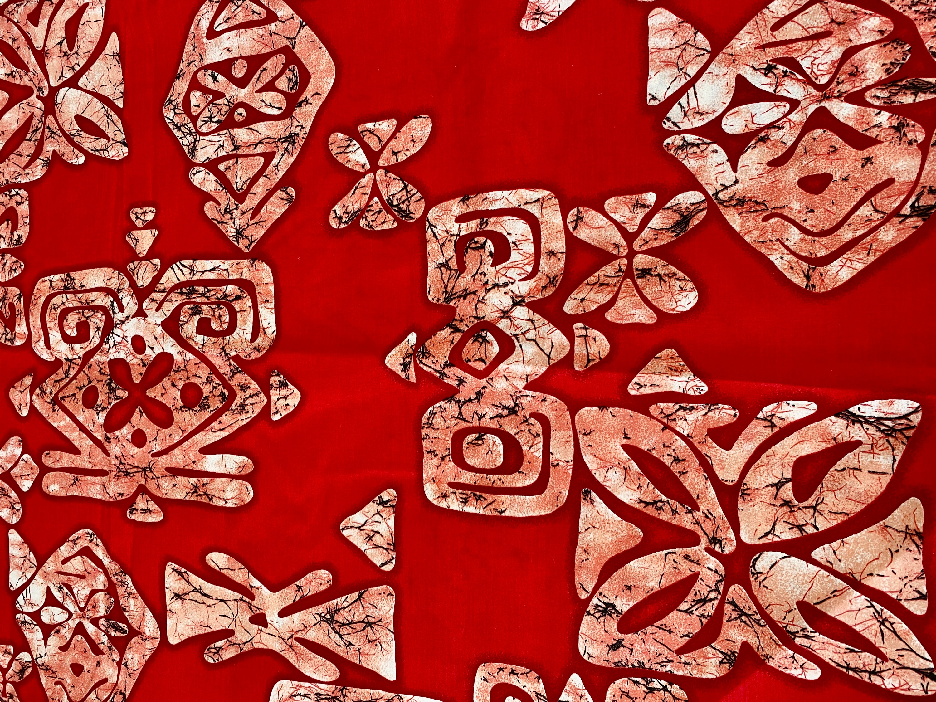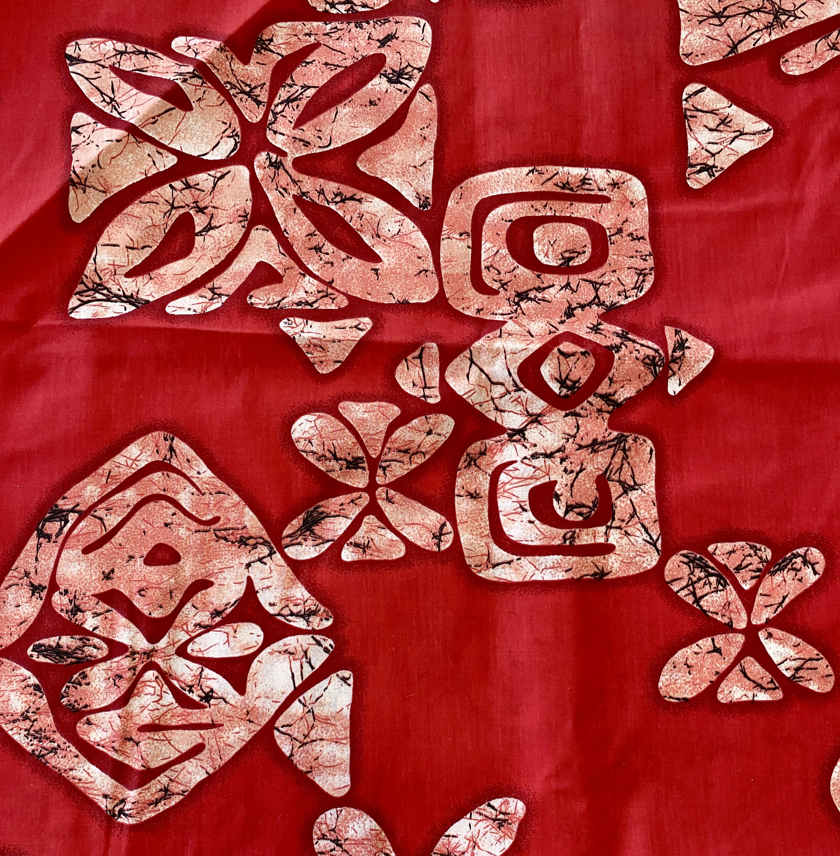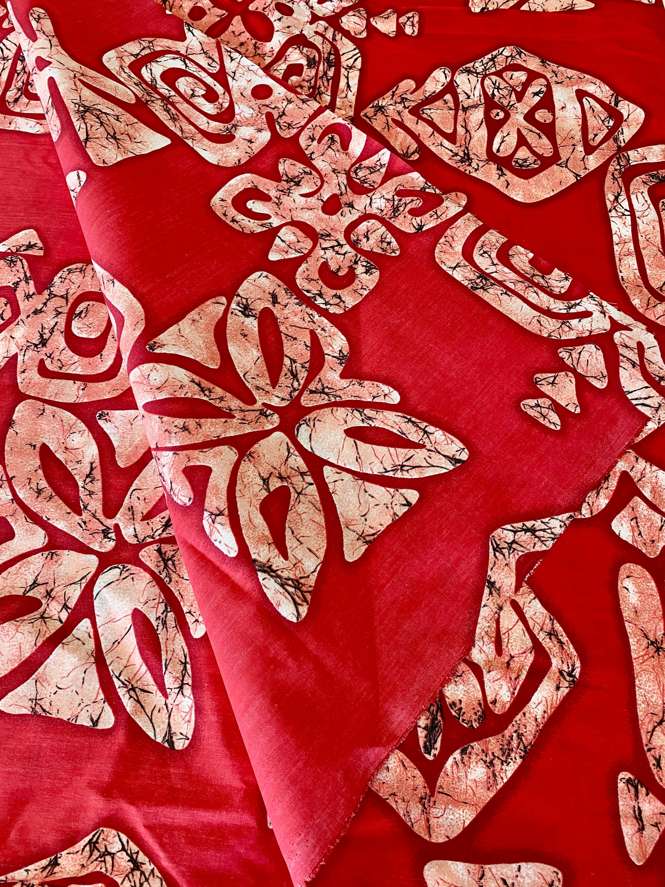 Abstract Batik pattern on red cotton fabric.