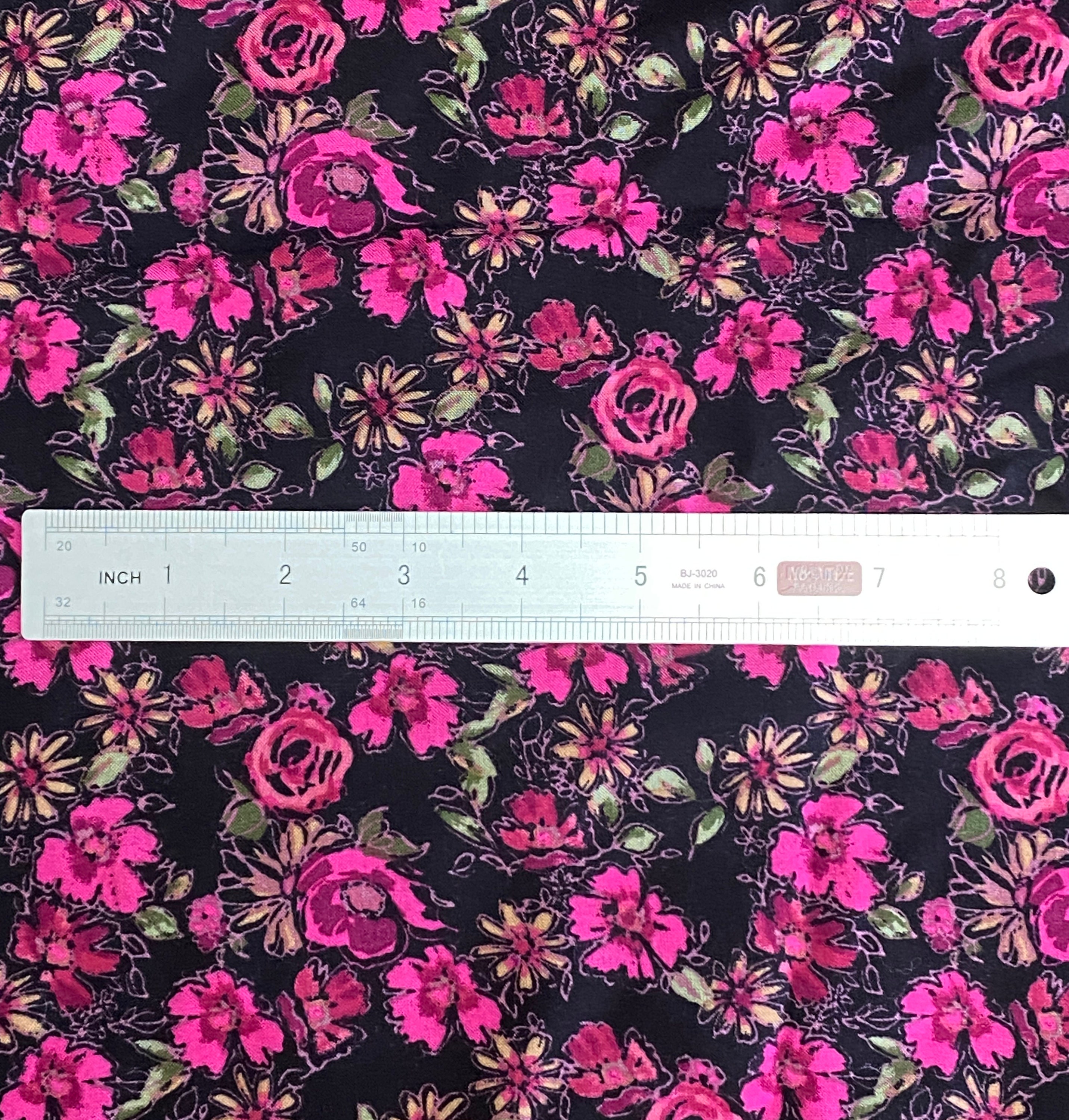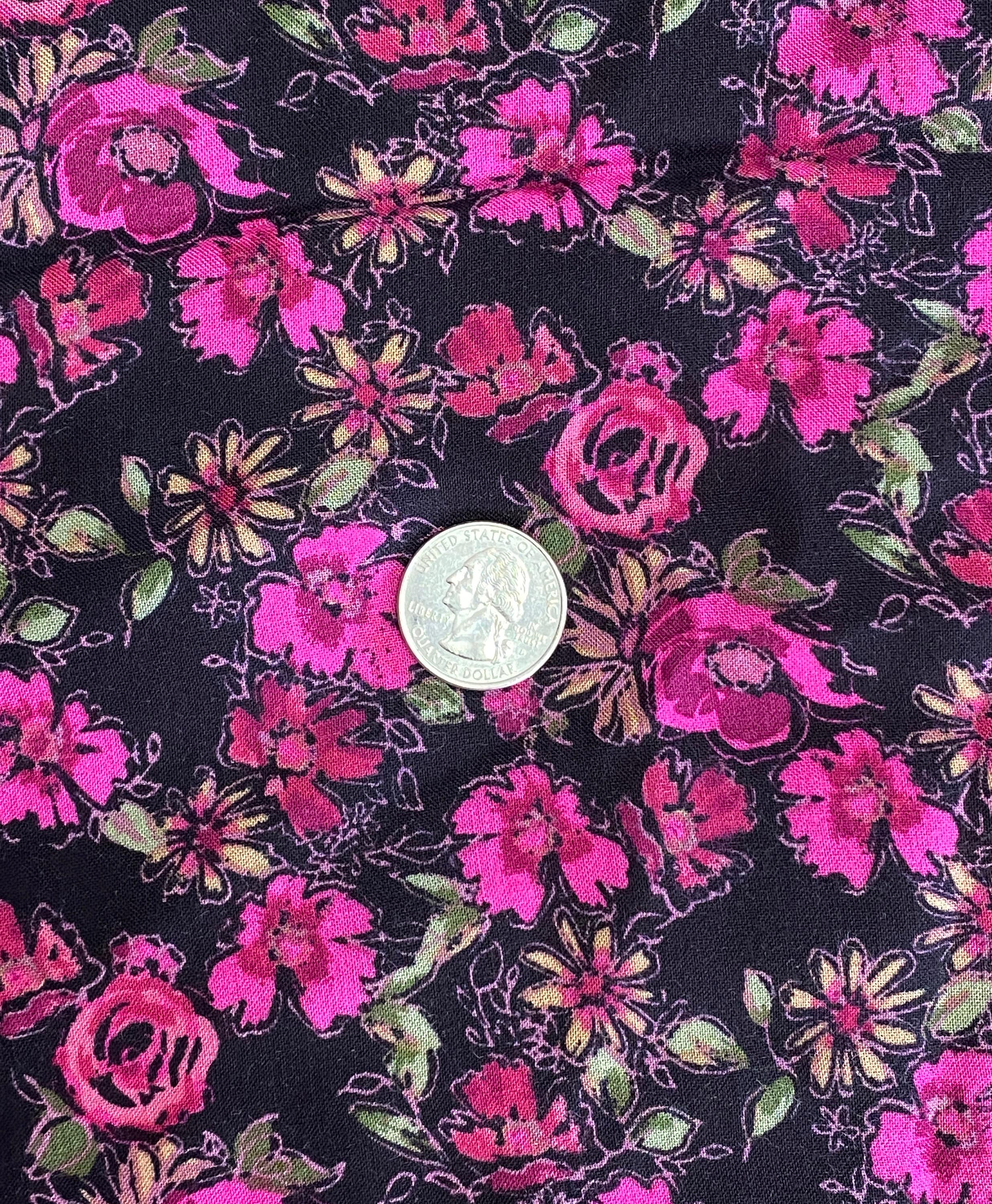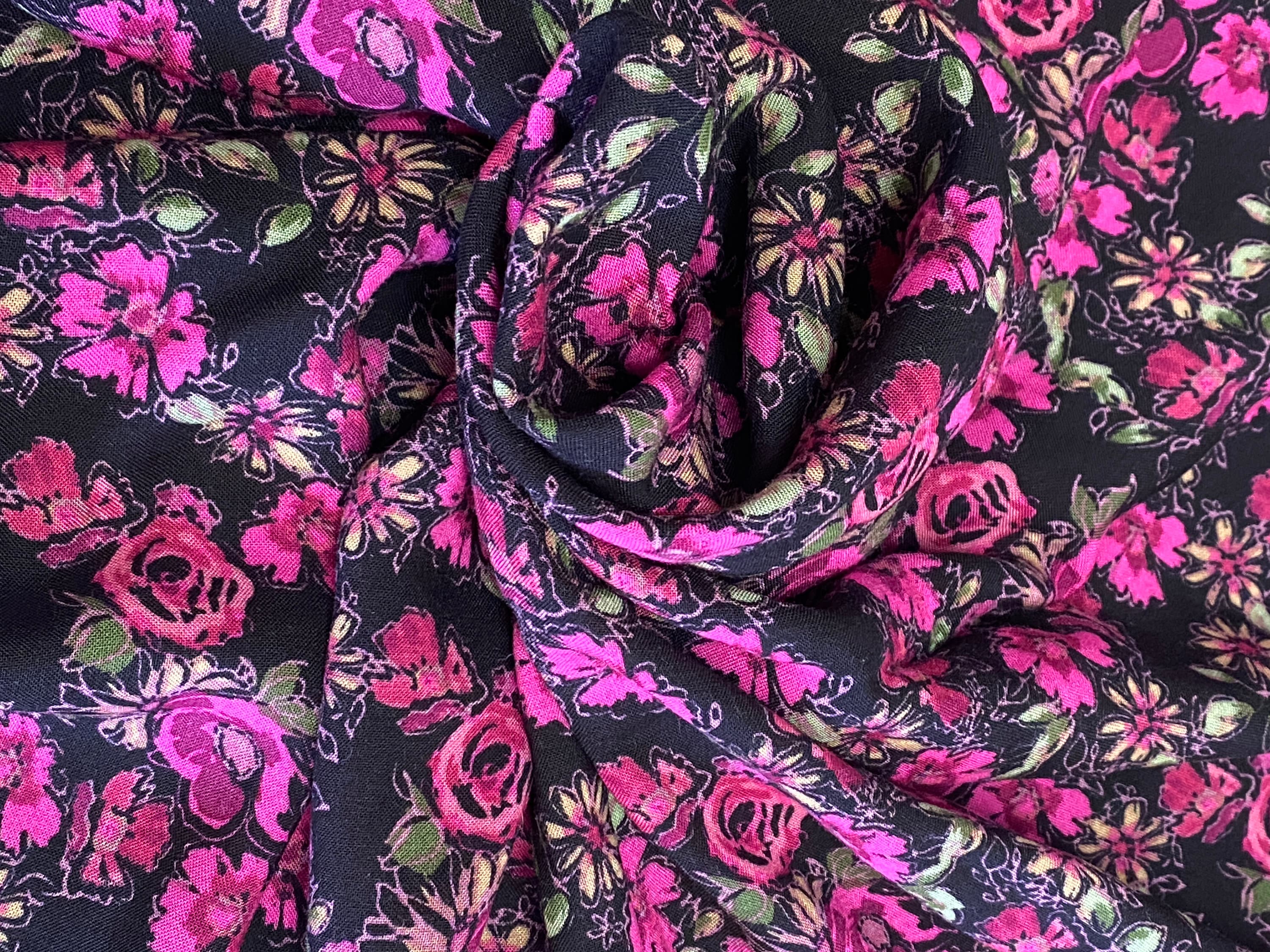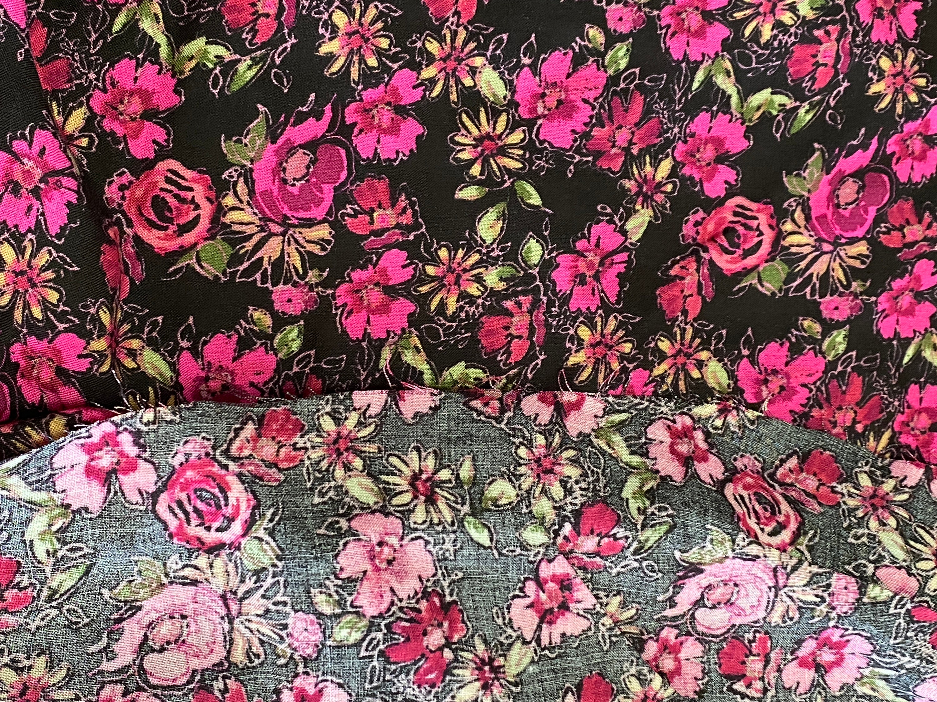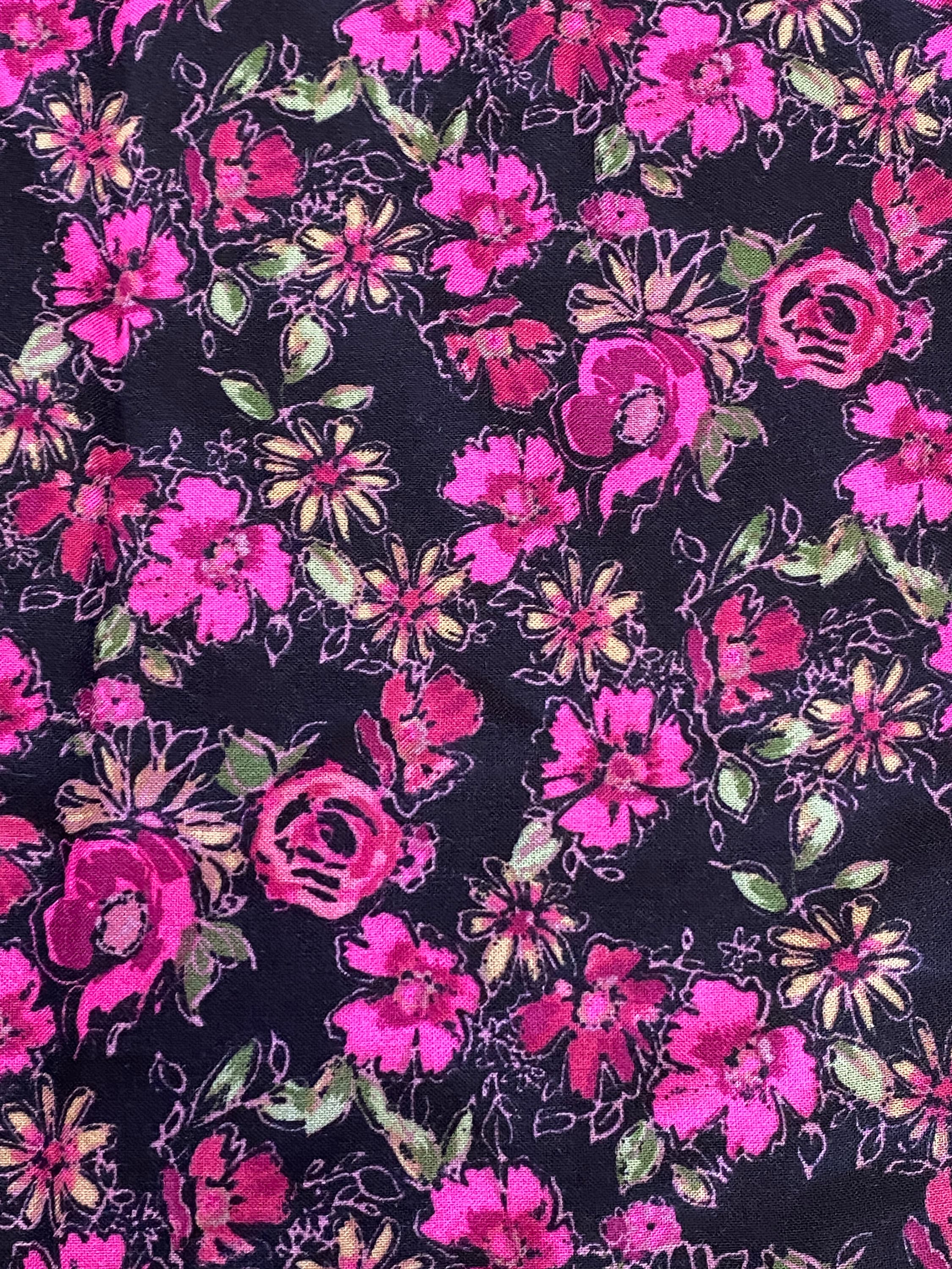 This fabric has a black background with fuchsia flowers and bronze-green leaves; kind of a Laura Ashley meets Goth Girl effect.