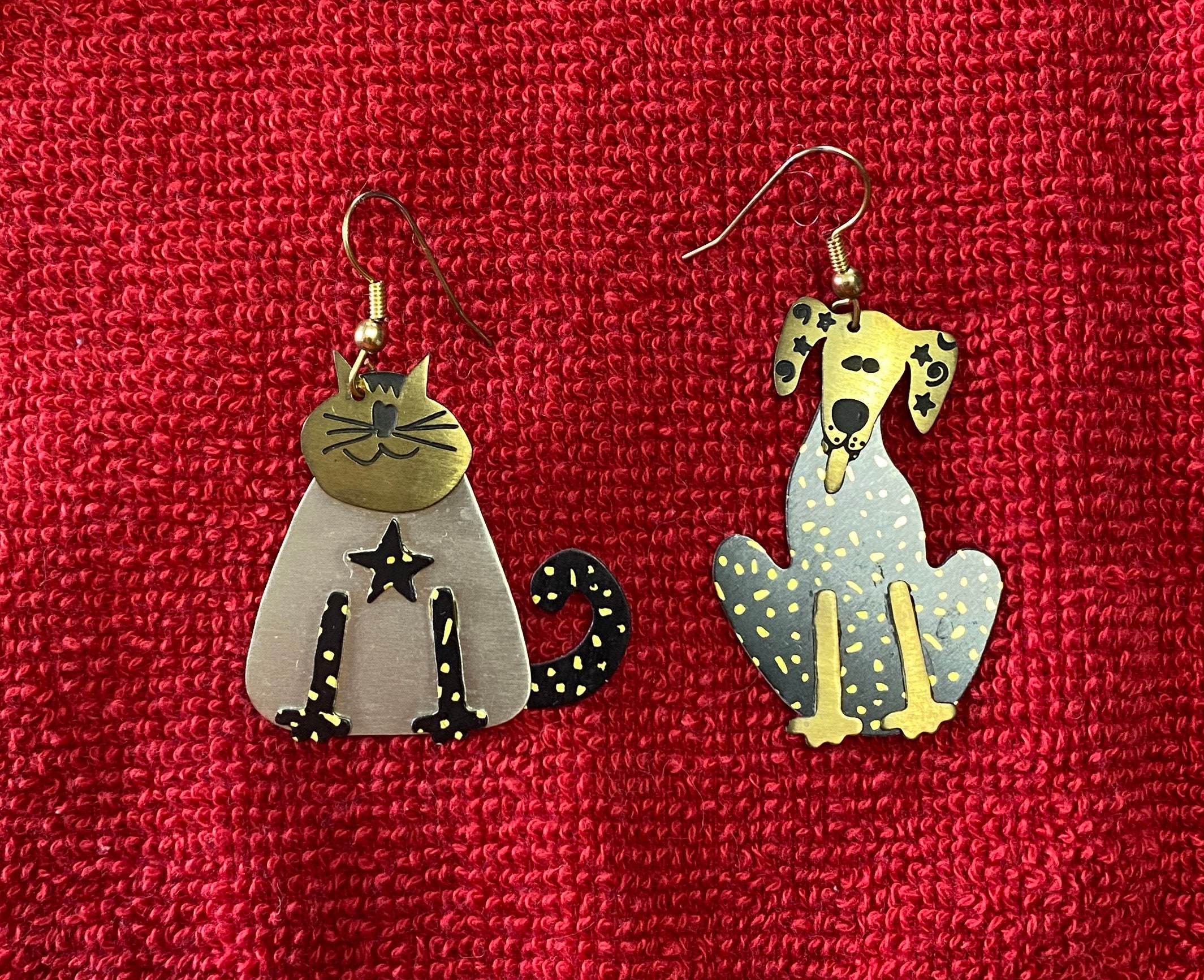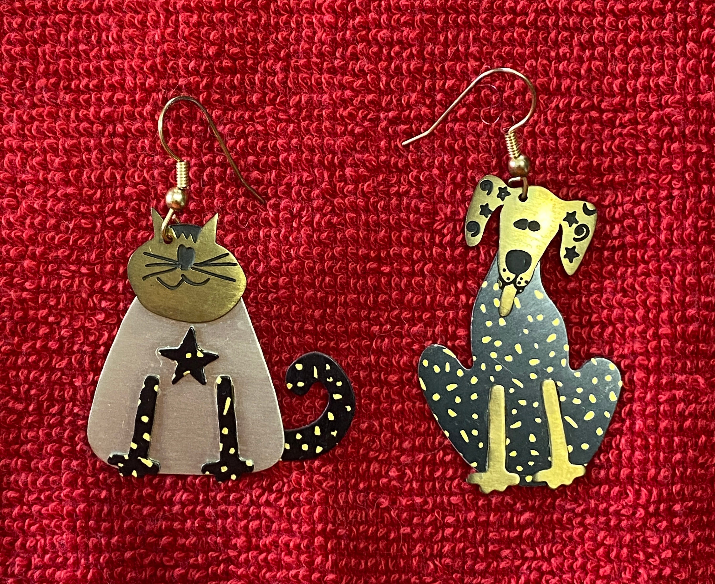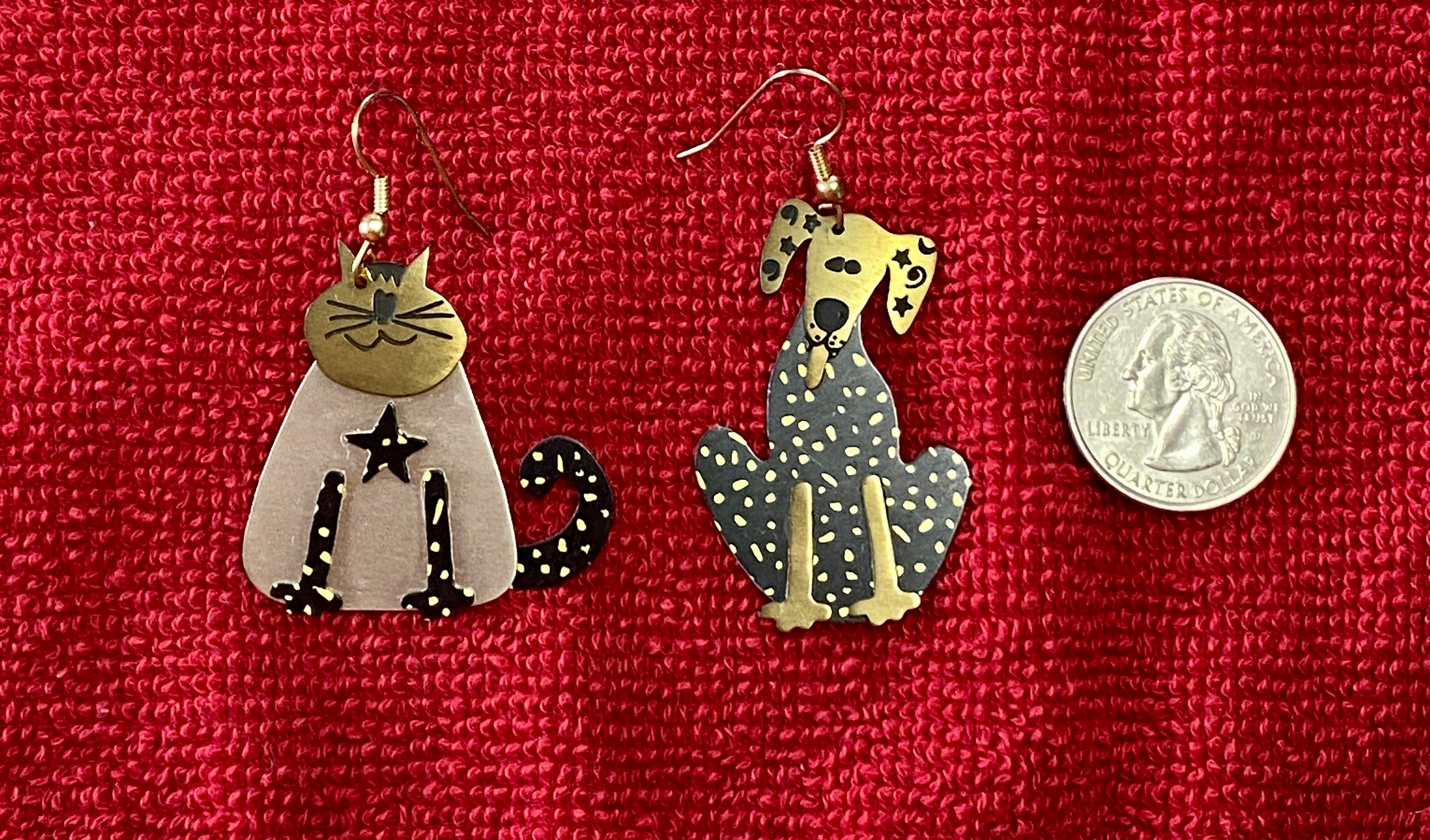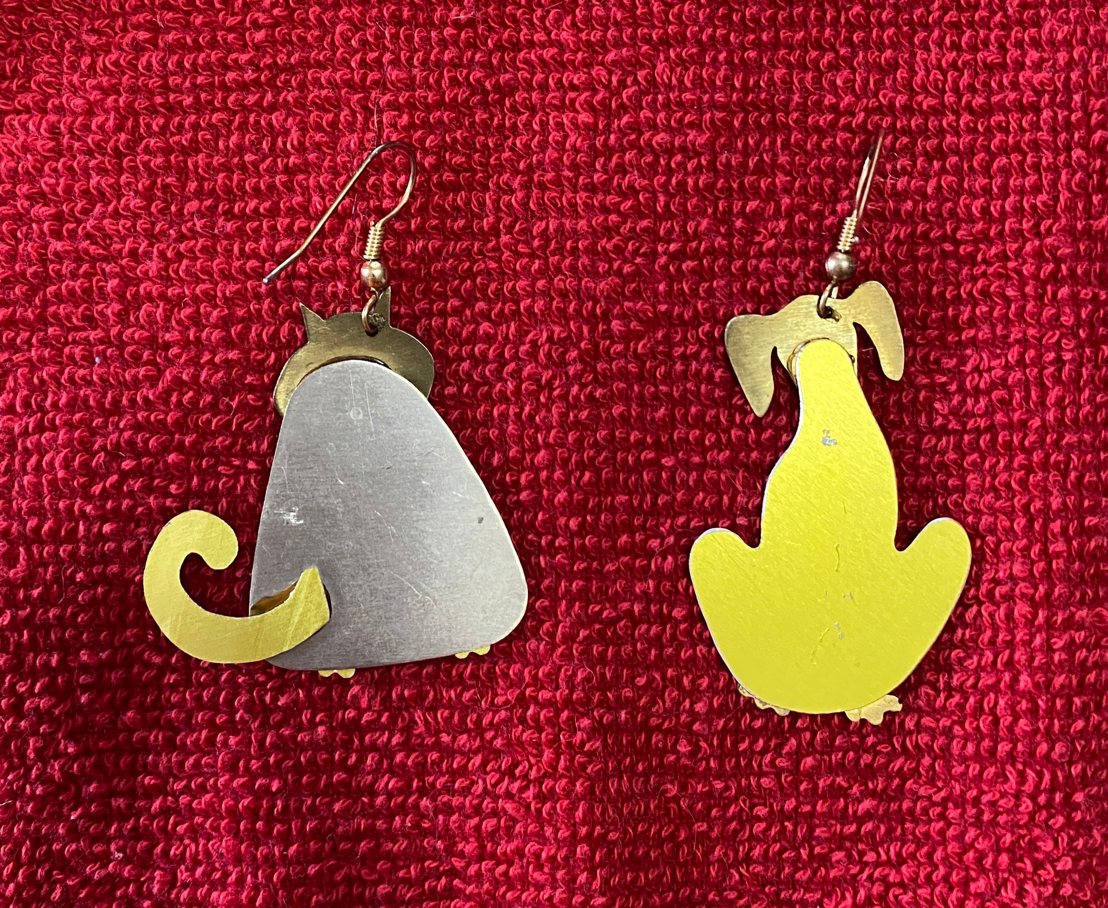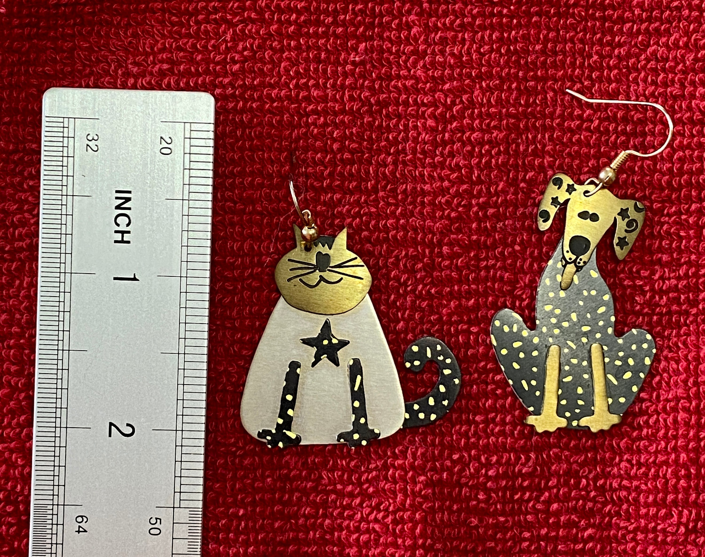This happy pair is wonderfully made. The dog consists of a golden base metal that is painted to show his spots. The cat has a silver tone body with his head, legs & tail made from the same painted gold tone metal like the dog. Excellent details from the cat's whiskers to the dog's tongue.
