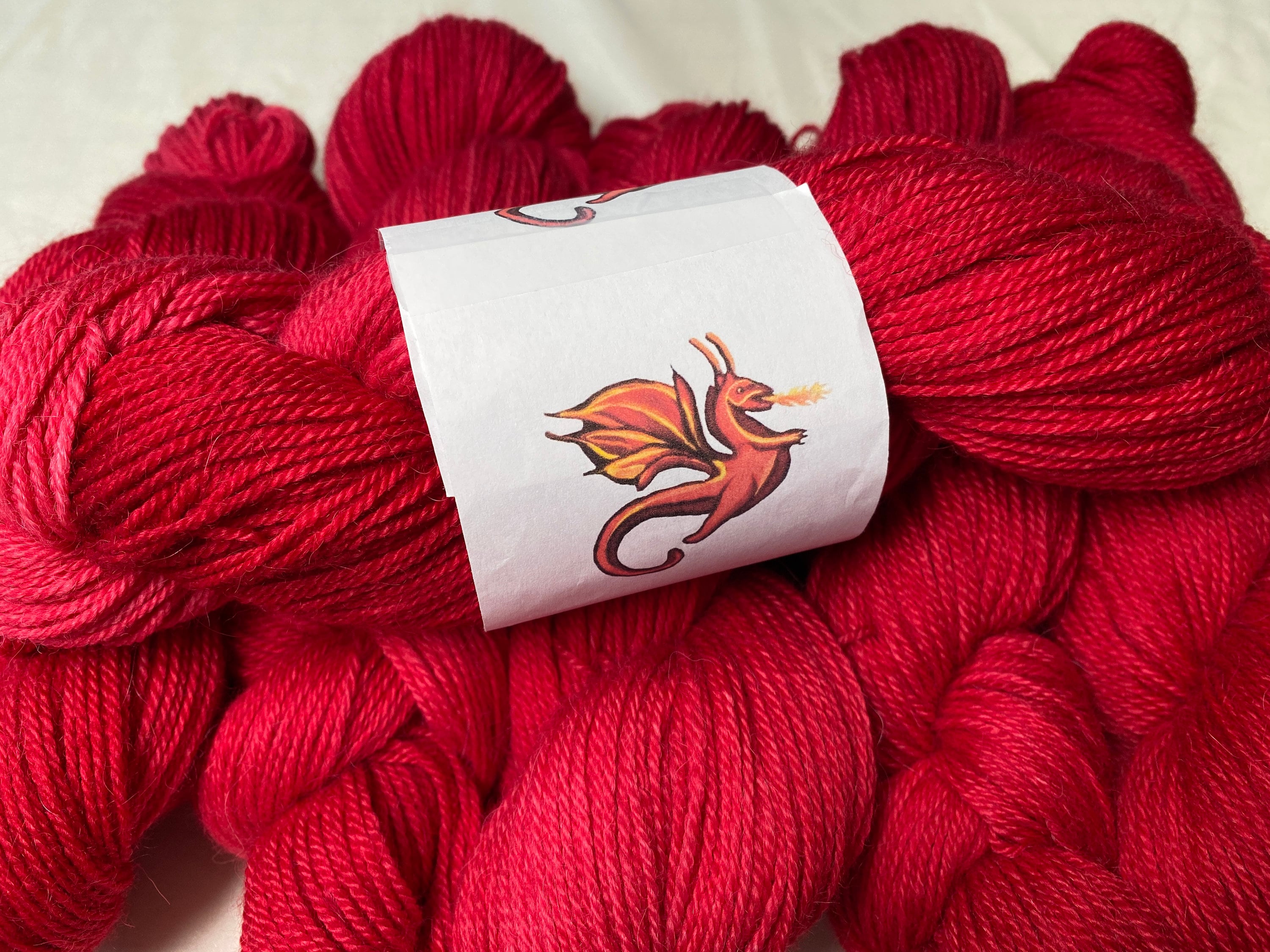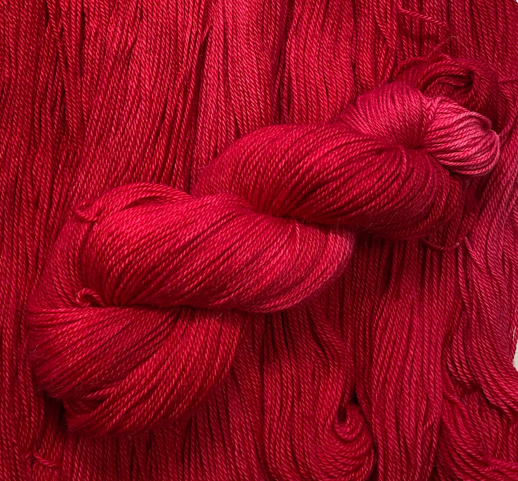 The name, "Firecracker Red" tells you everything you need to know about the color of this yarn! It's bright, bold and pops at you! A brilliant red with the various depths of shade that kettle dyeing brings to hand dyed yarn.