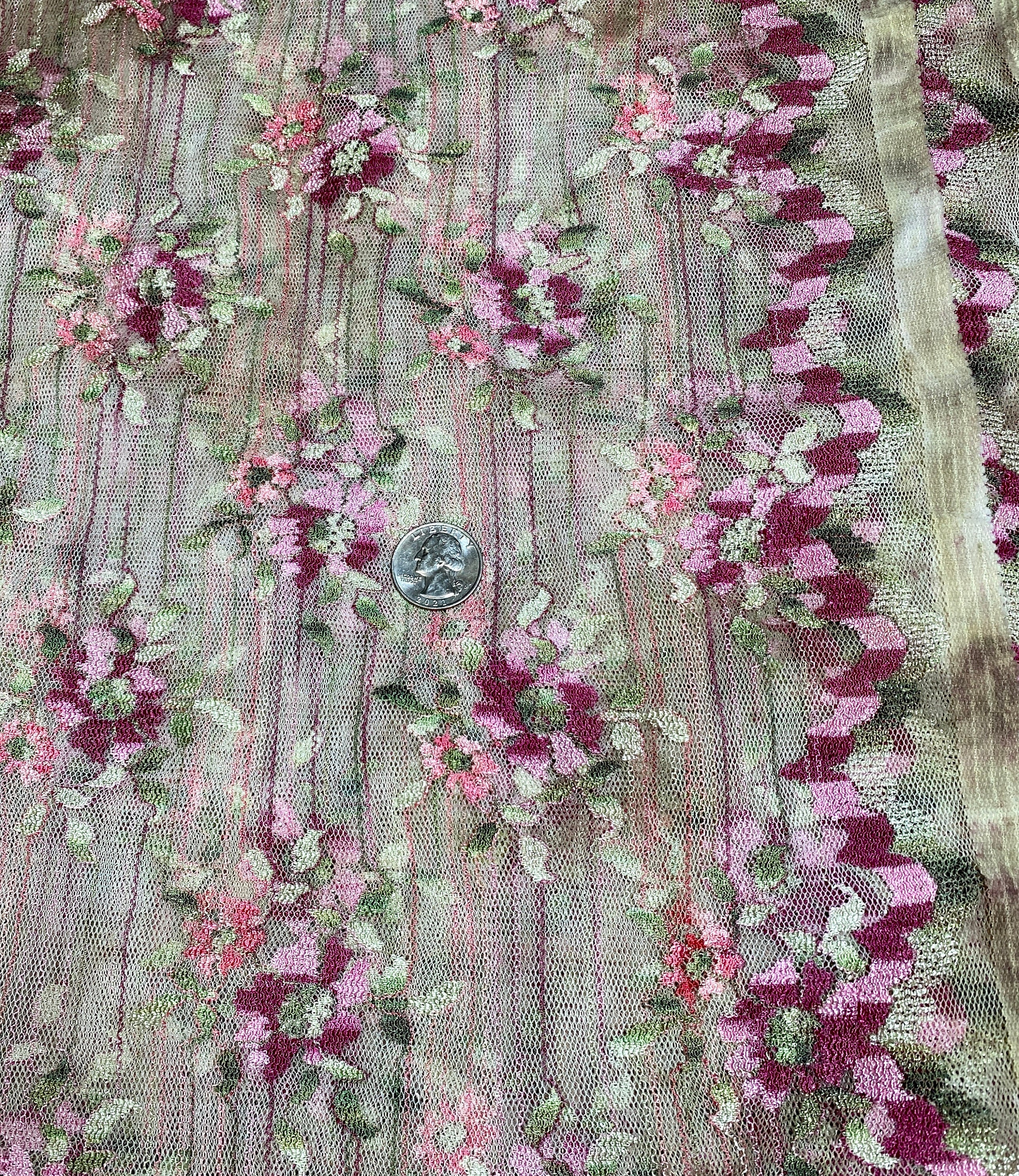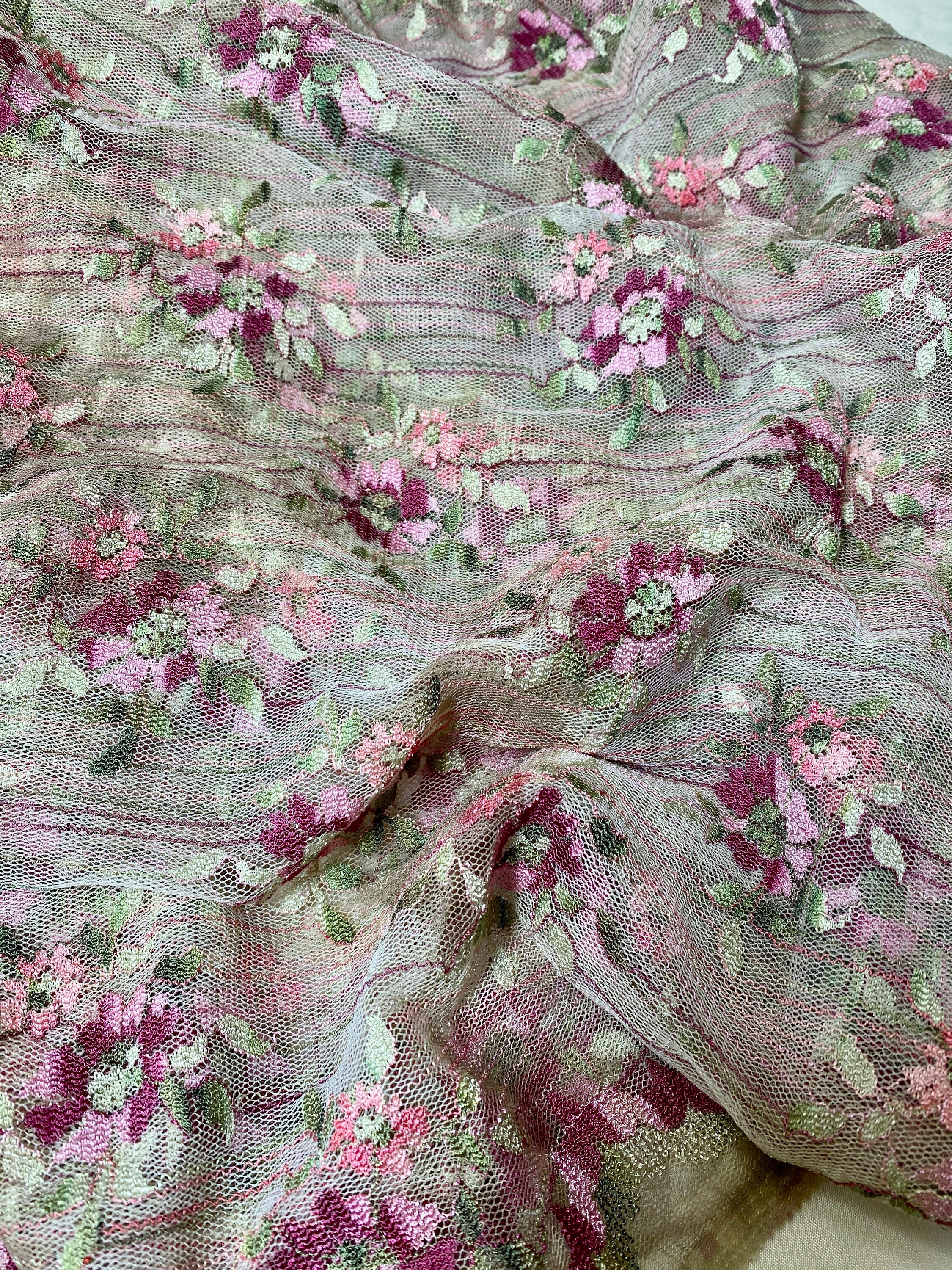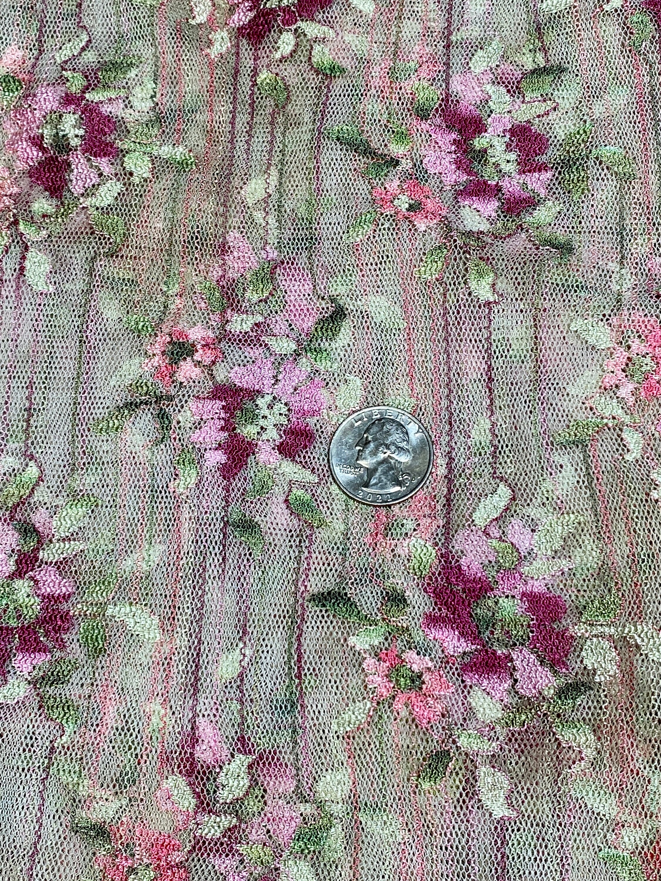 This looks so Victorian, but it's not. A very sedate dark ecru base of lacy mesh embroidered & embellished with mauve pink & burgundy flowers and light green leaves and punctuated by tiny stripes of those colors throughout the fabric. Very old fashioned looking.