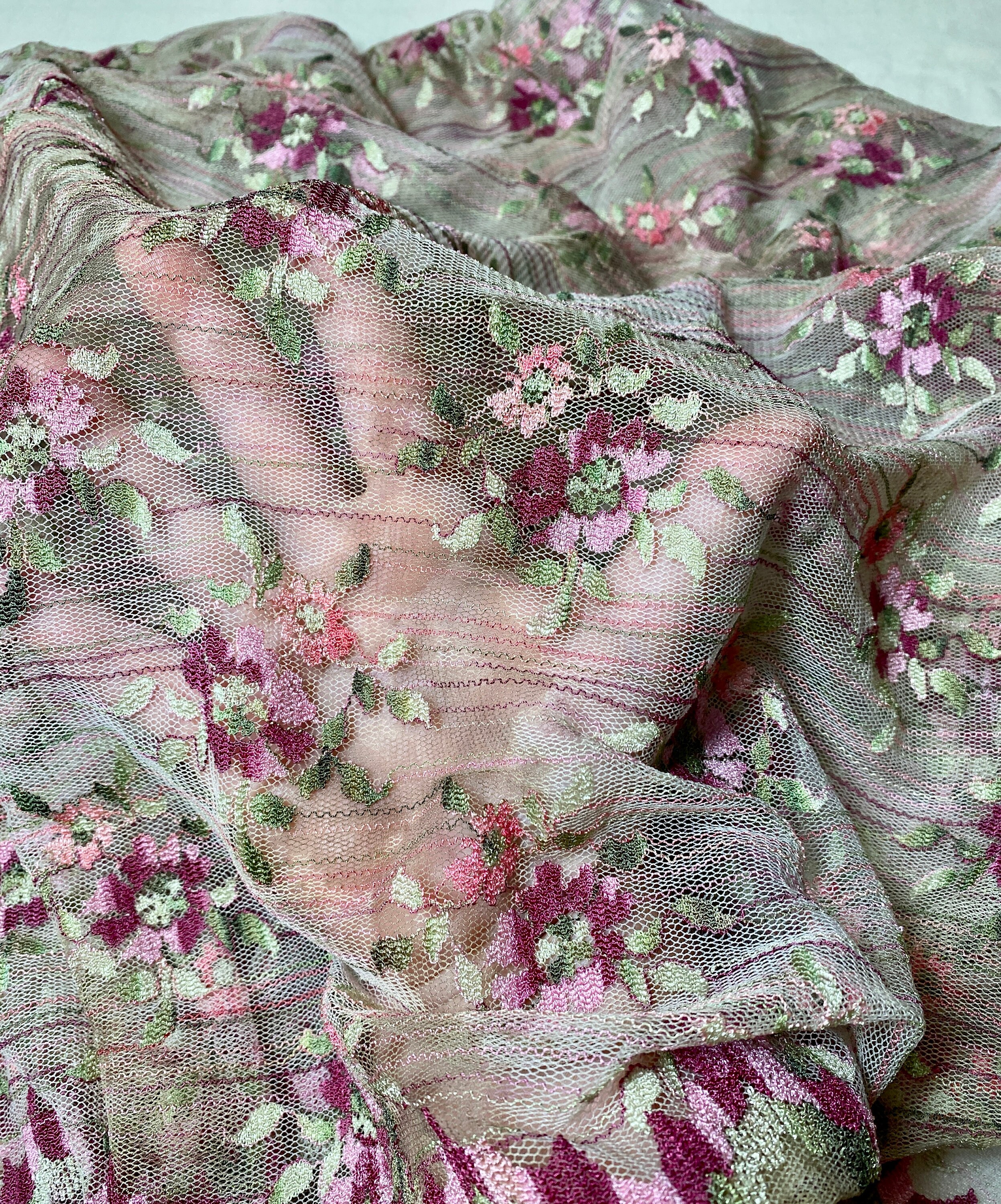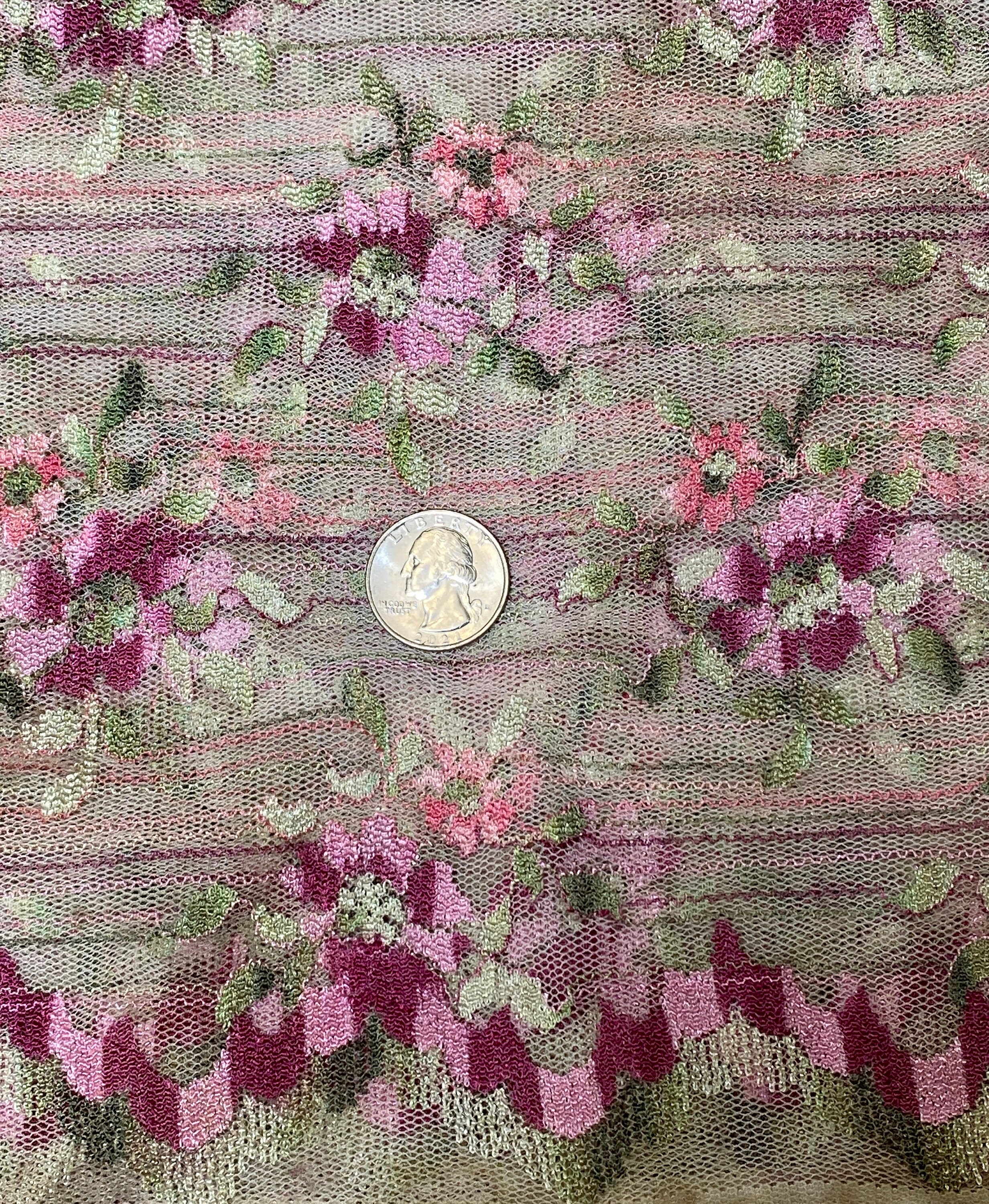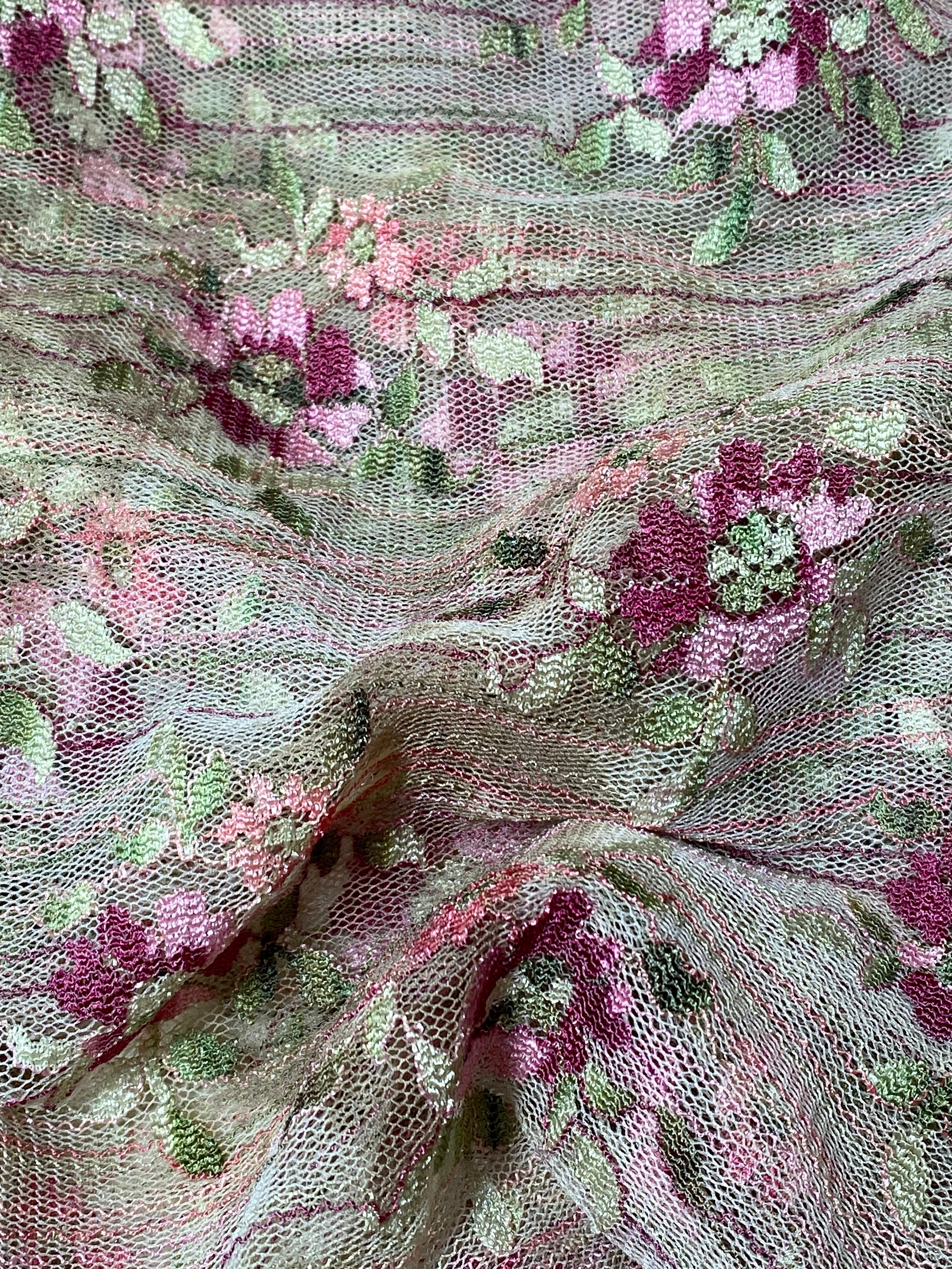 This looks so Victorian, but it's not. A very sedate dark ecru base of lacy mesh embroidered & embellished with mauve pink & burgundy flowers and light green leaves and punctuated by tiny stripes of those colors throughout the fabric. Very old fashioned looking.