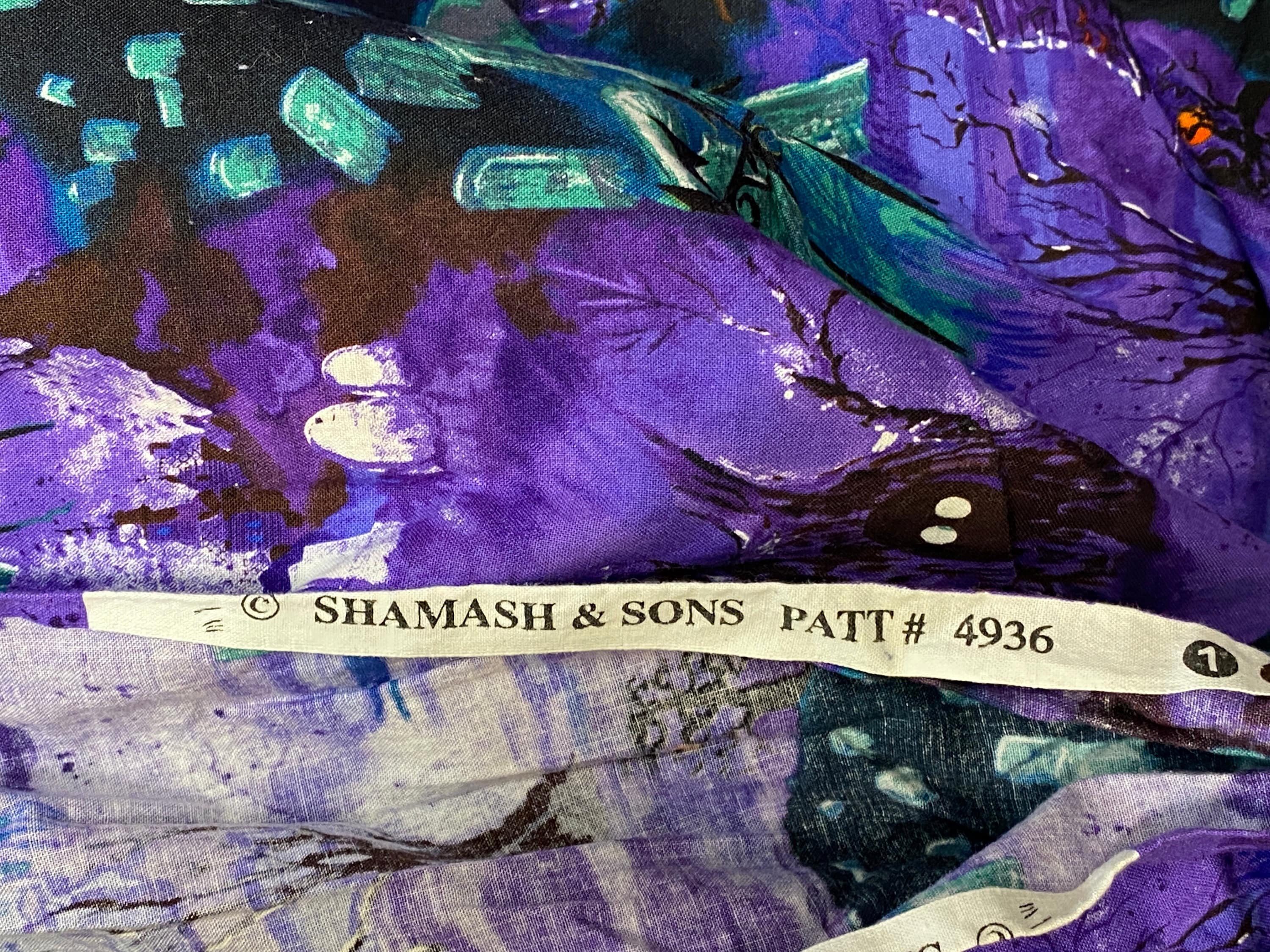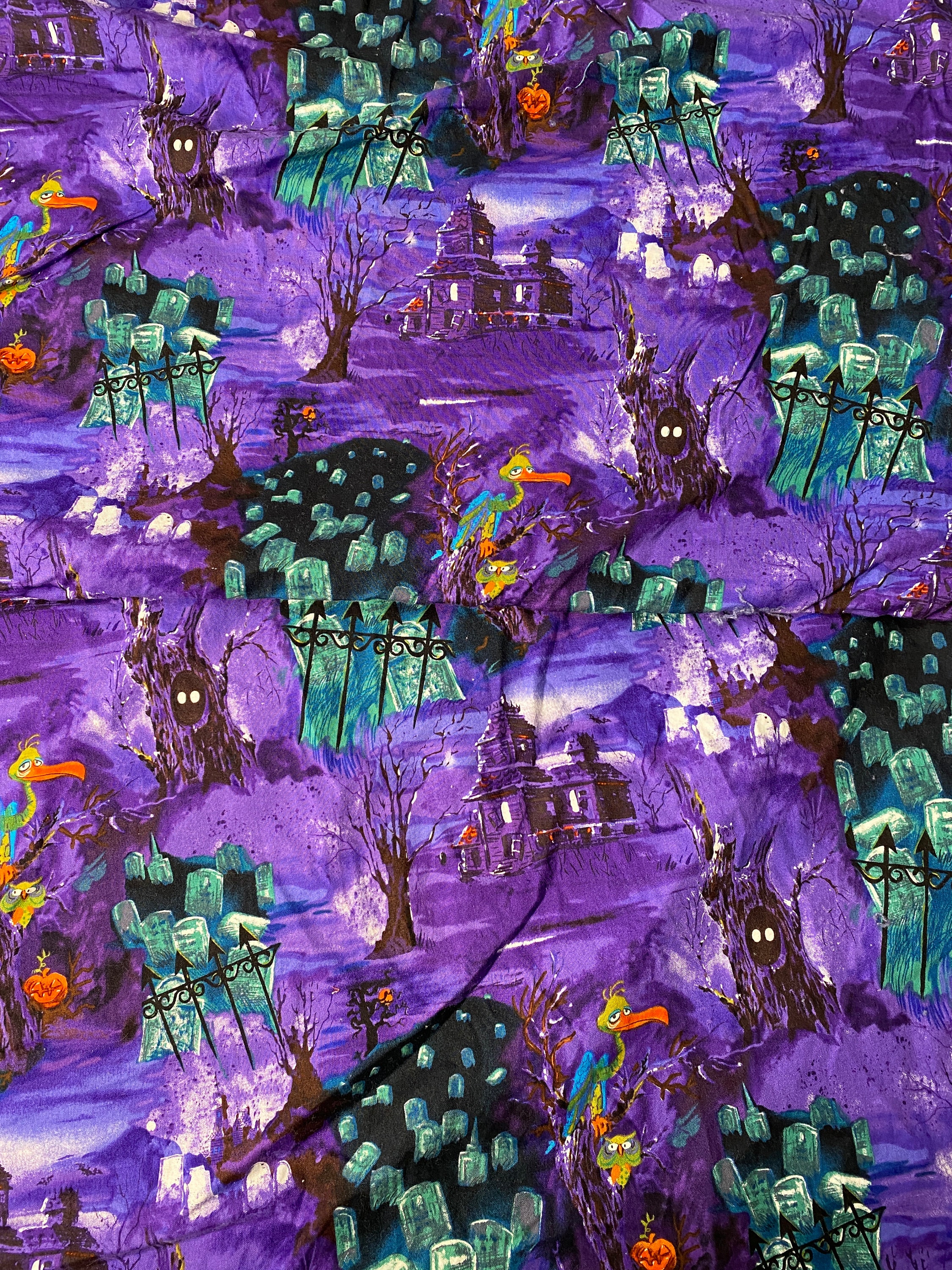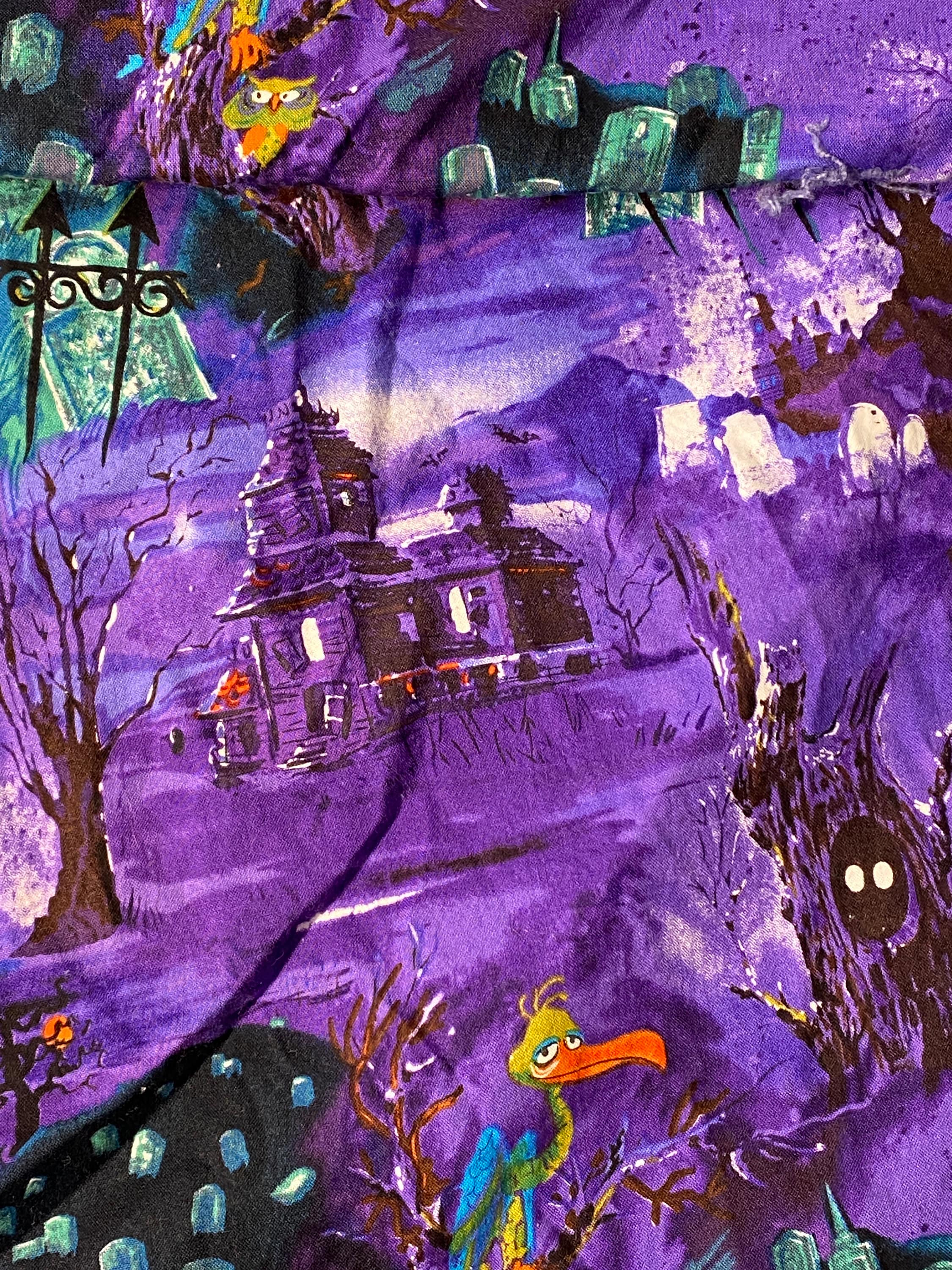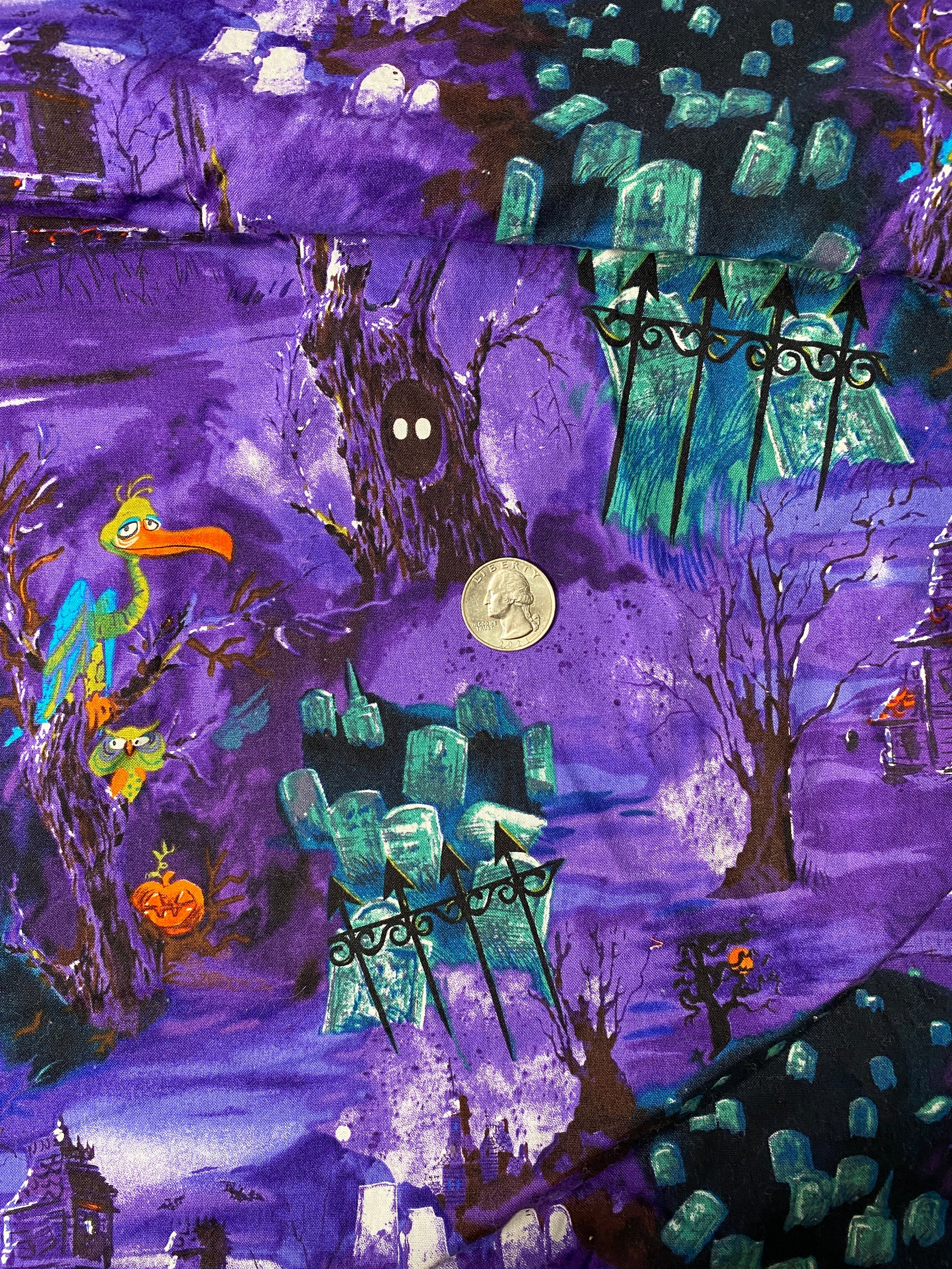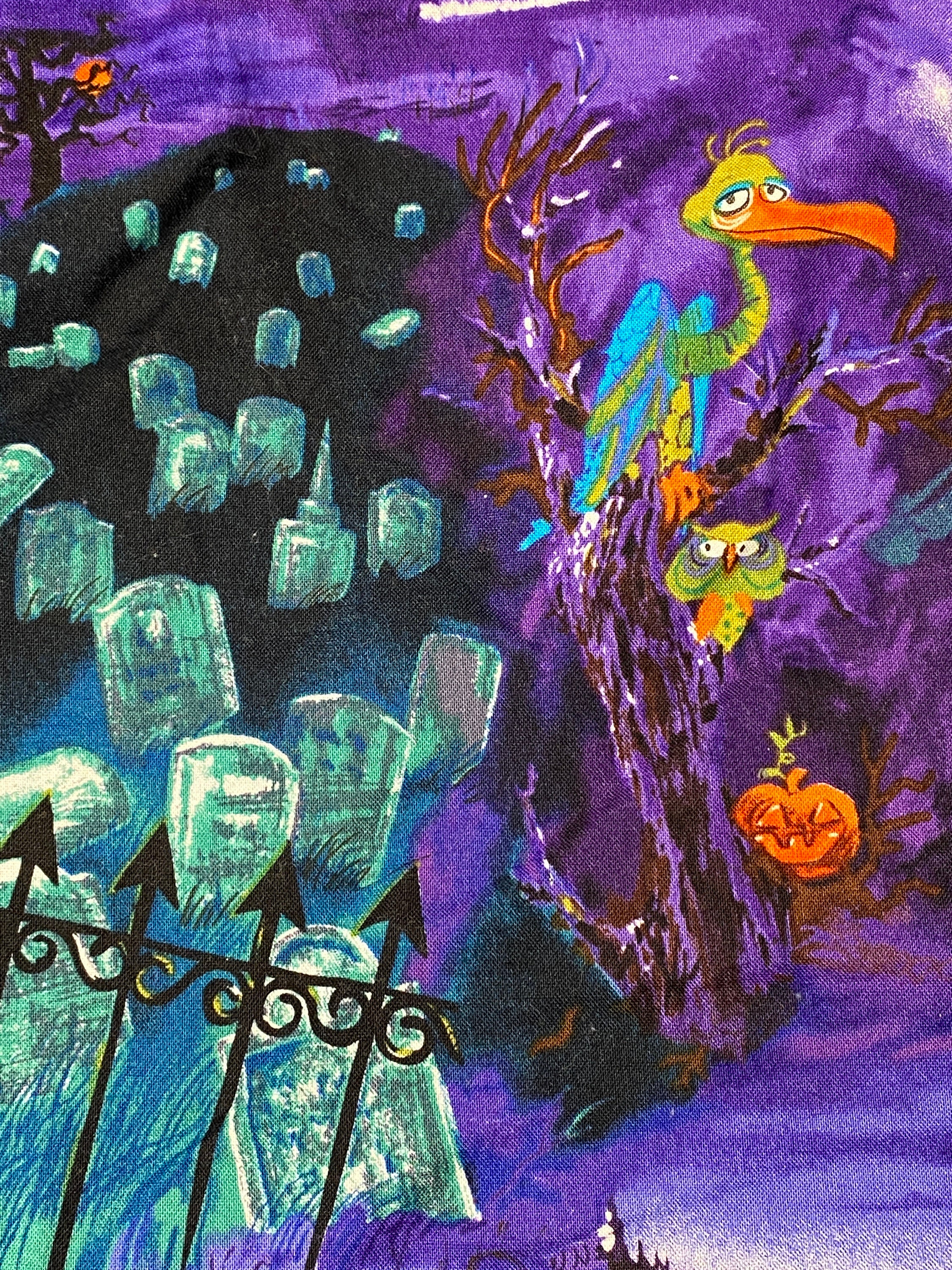 The vulture with the knowing look is the centerpiece of this fabric. He's in a cemetery with headstones, dead trees, owls, a haunted house and possible ghosts if it isn't fog.