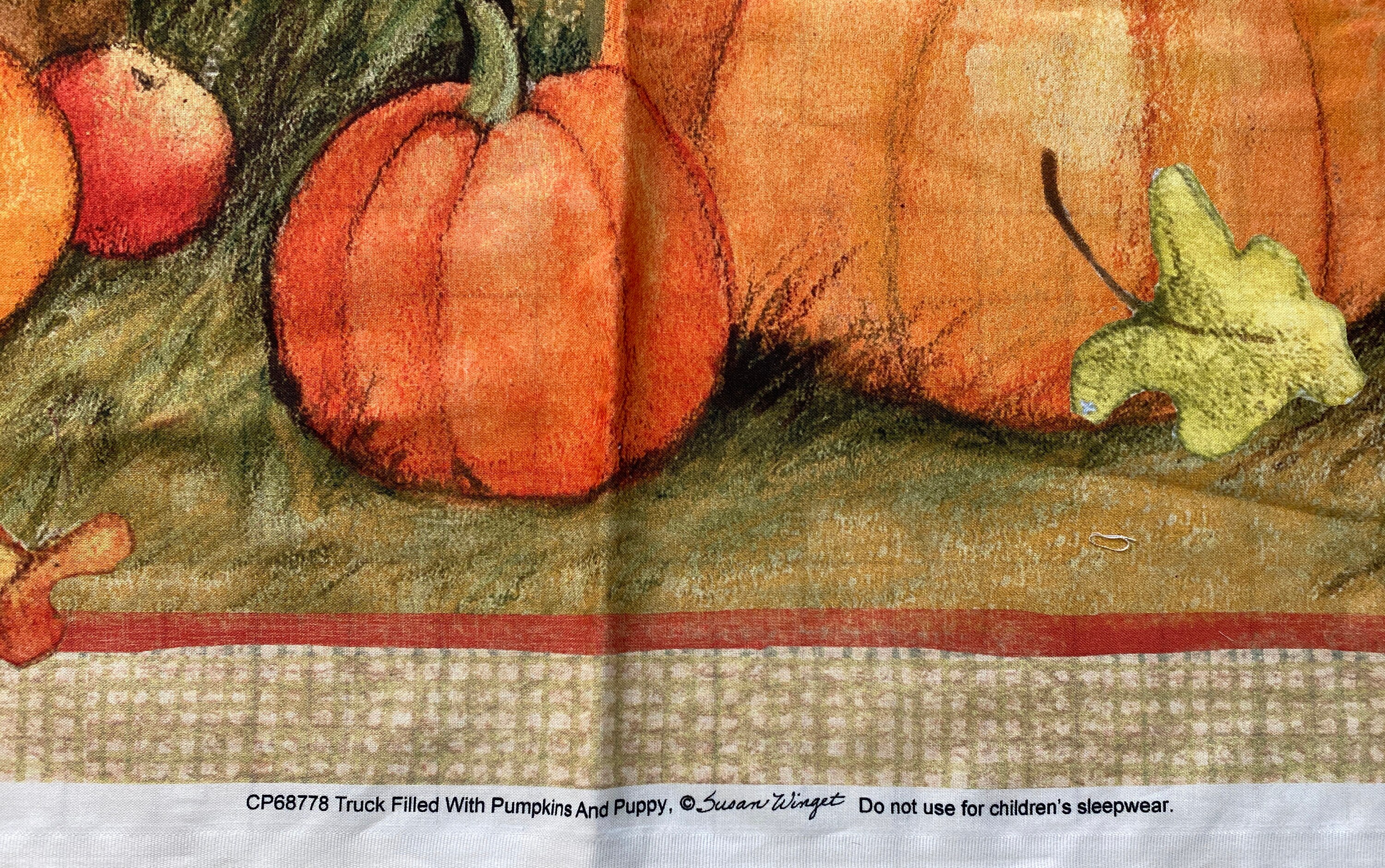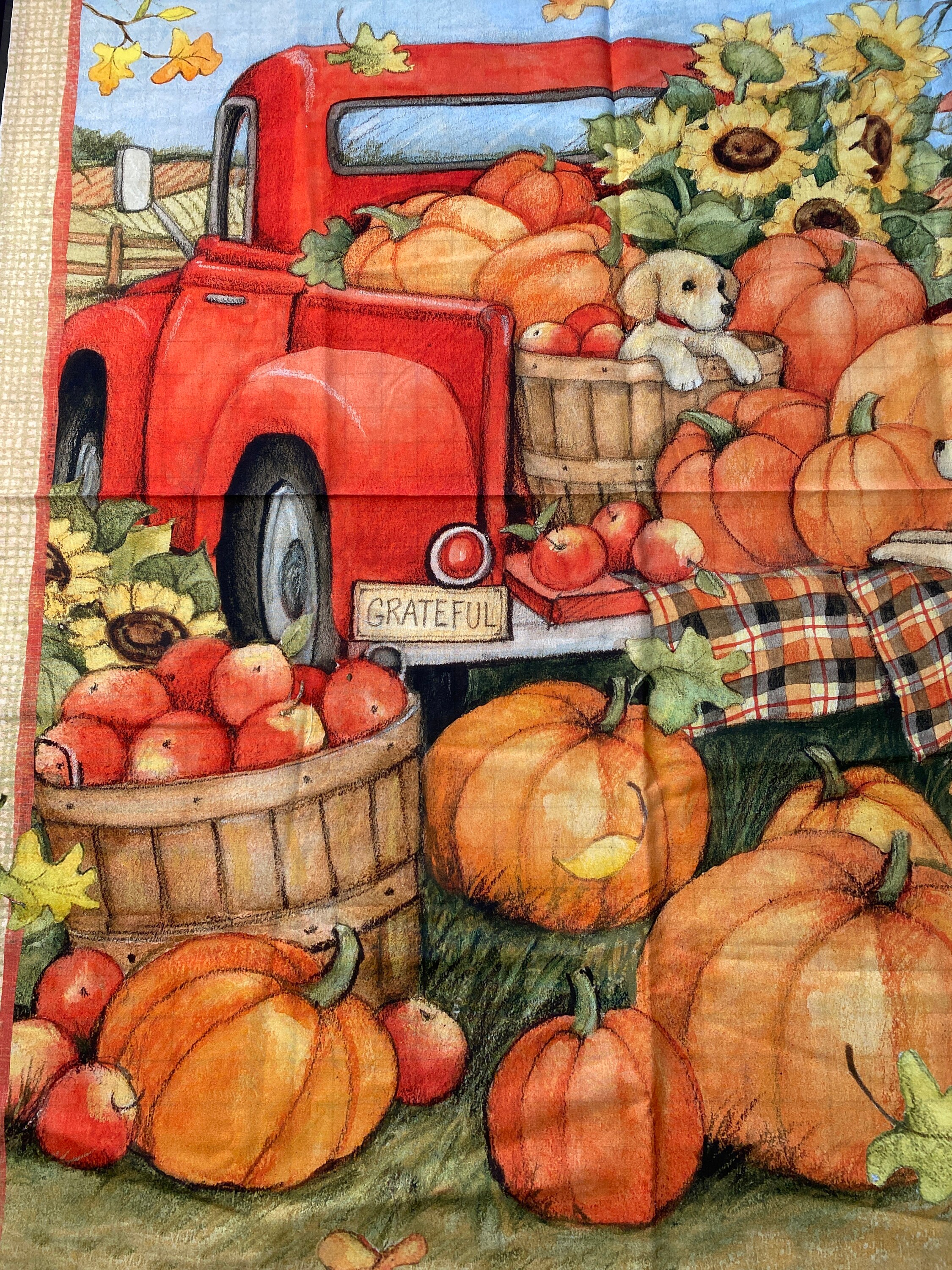 36" x 44" cotton in Fall colors, Design #CP68778 a truck filled with pumpkins and a puppy... or two. Sunflowers, Autumn apples, plaid blanket & a license plate that says GRATEFUL.