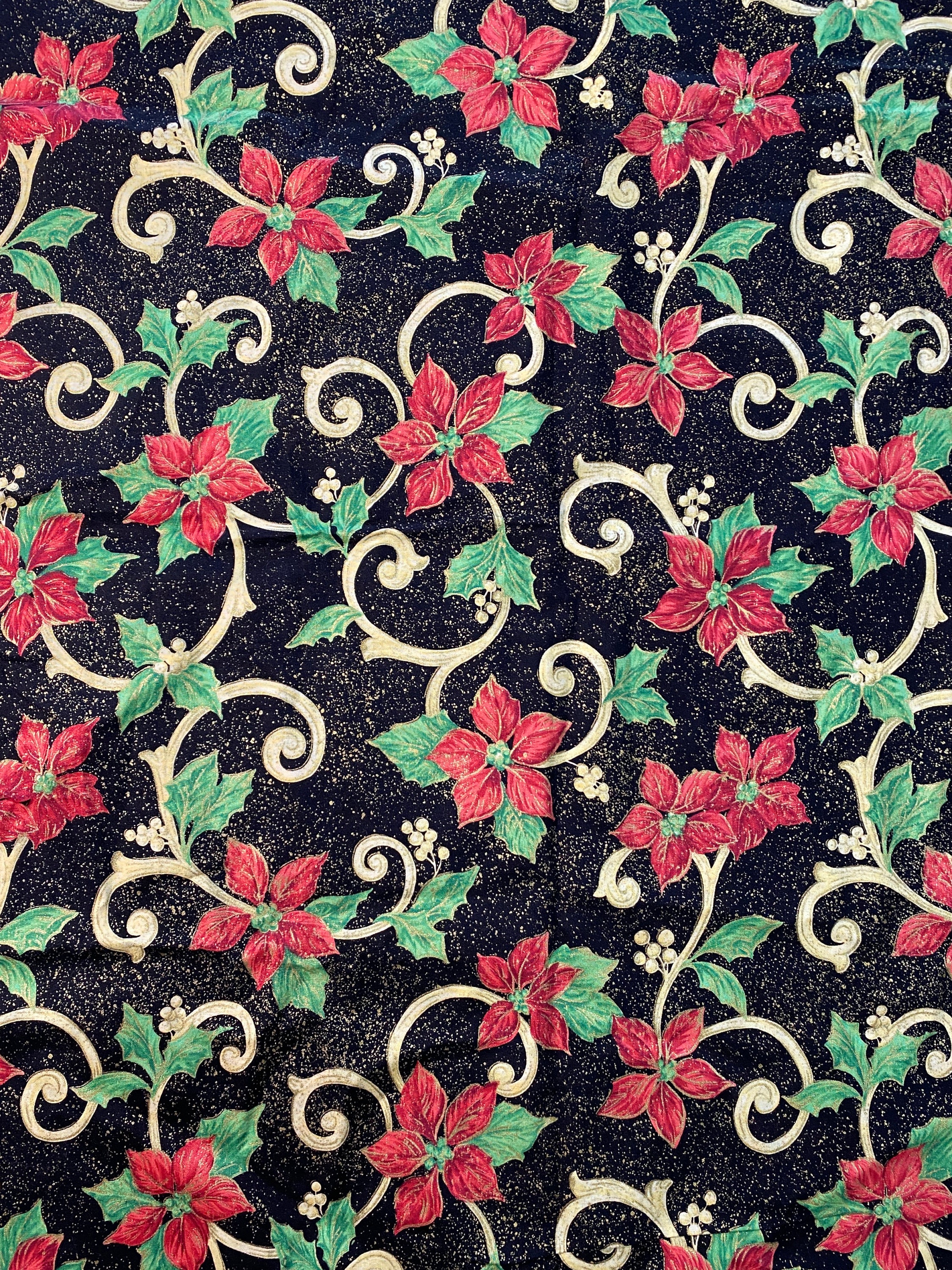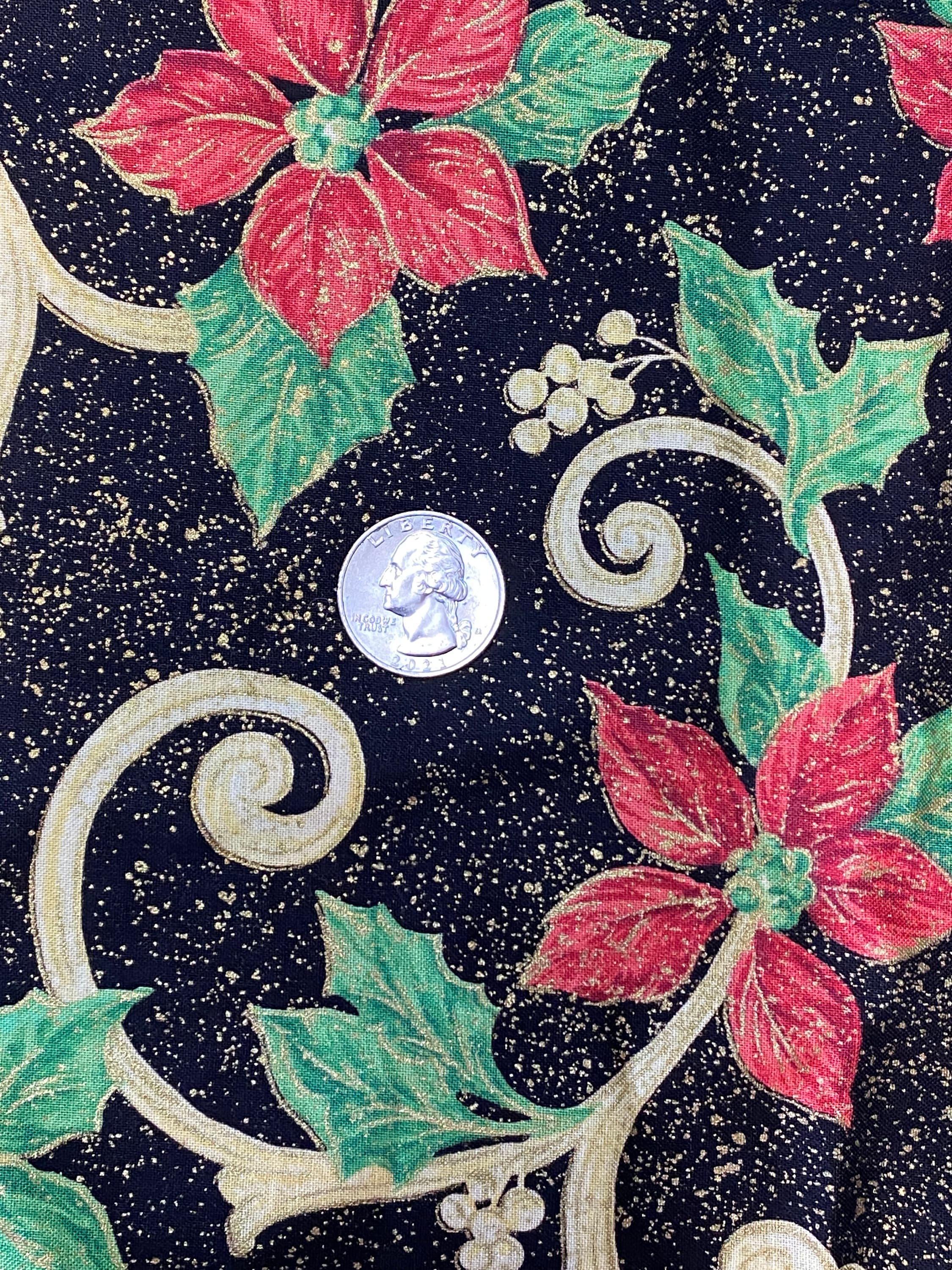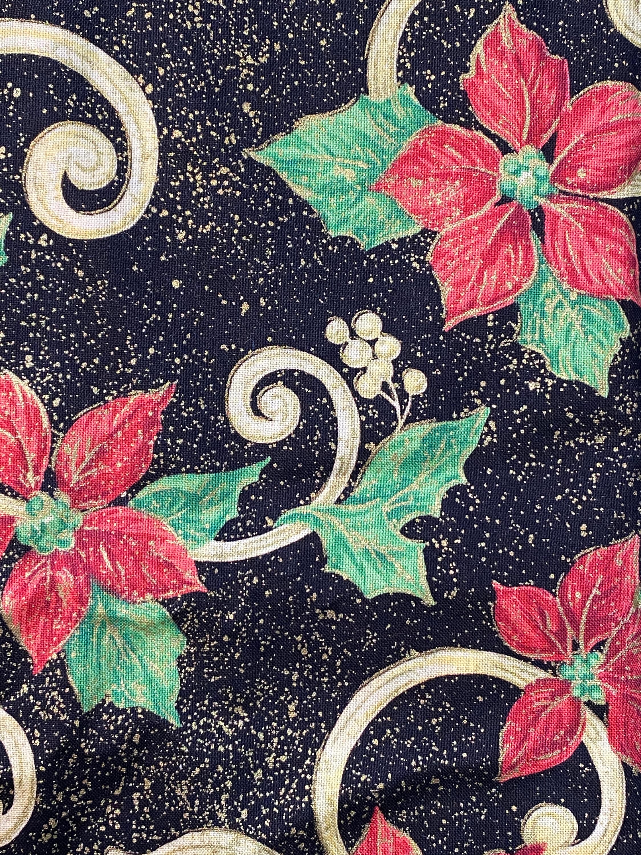 Add some glitz to your holiday! Red poinsettia flowers and white holly berries cling to a vine against a black background and then the pièce de résistance...the plant structures are highlighted with glittery gold and the black background is dusted with gold glitter, almost like tiny speckles of gold paint or stars in the night sky.