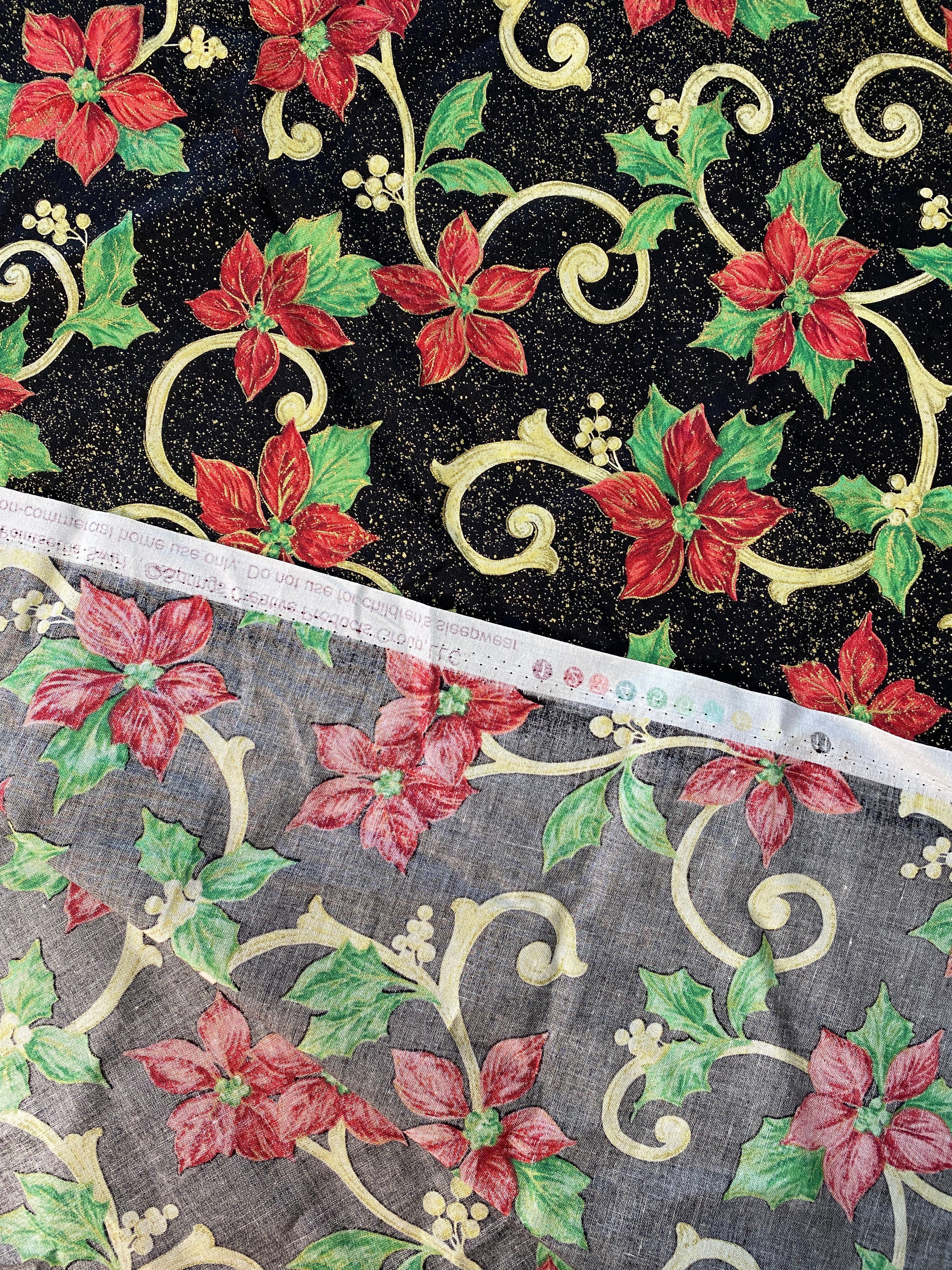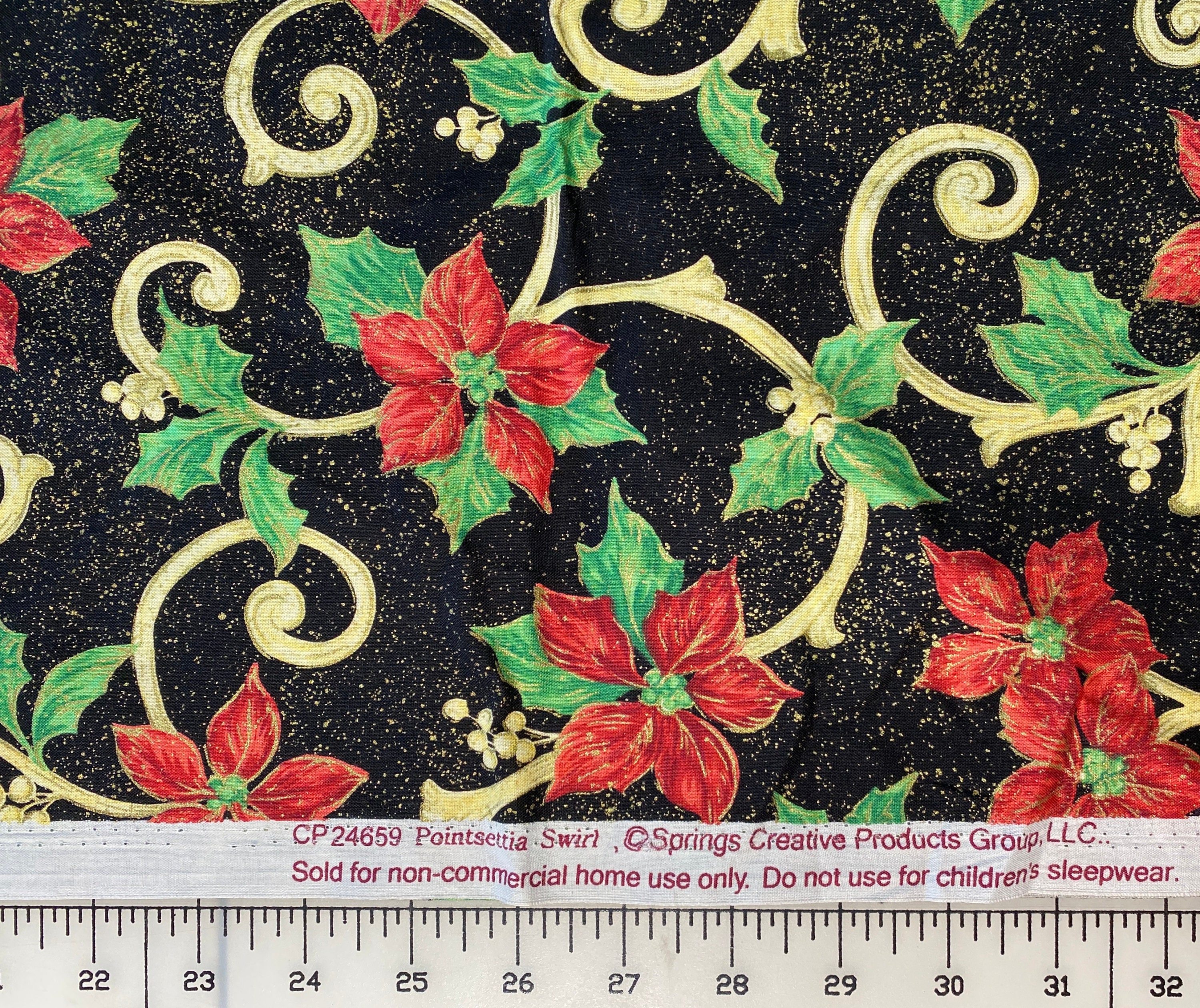 Printing on the selvedge says Springs Creative Products Group LLC and the name of the fabric is Poinsettia Swirl.