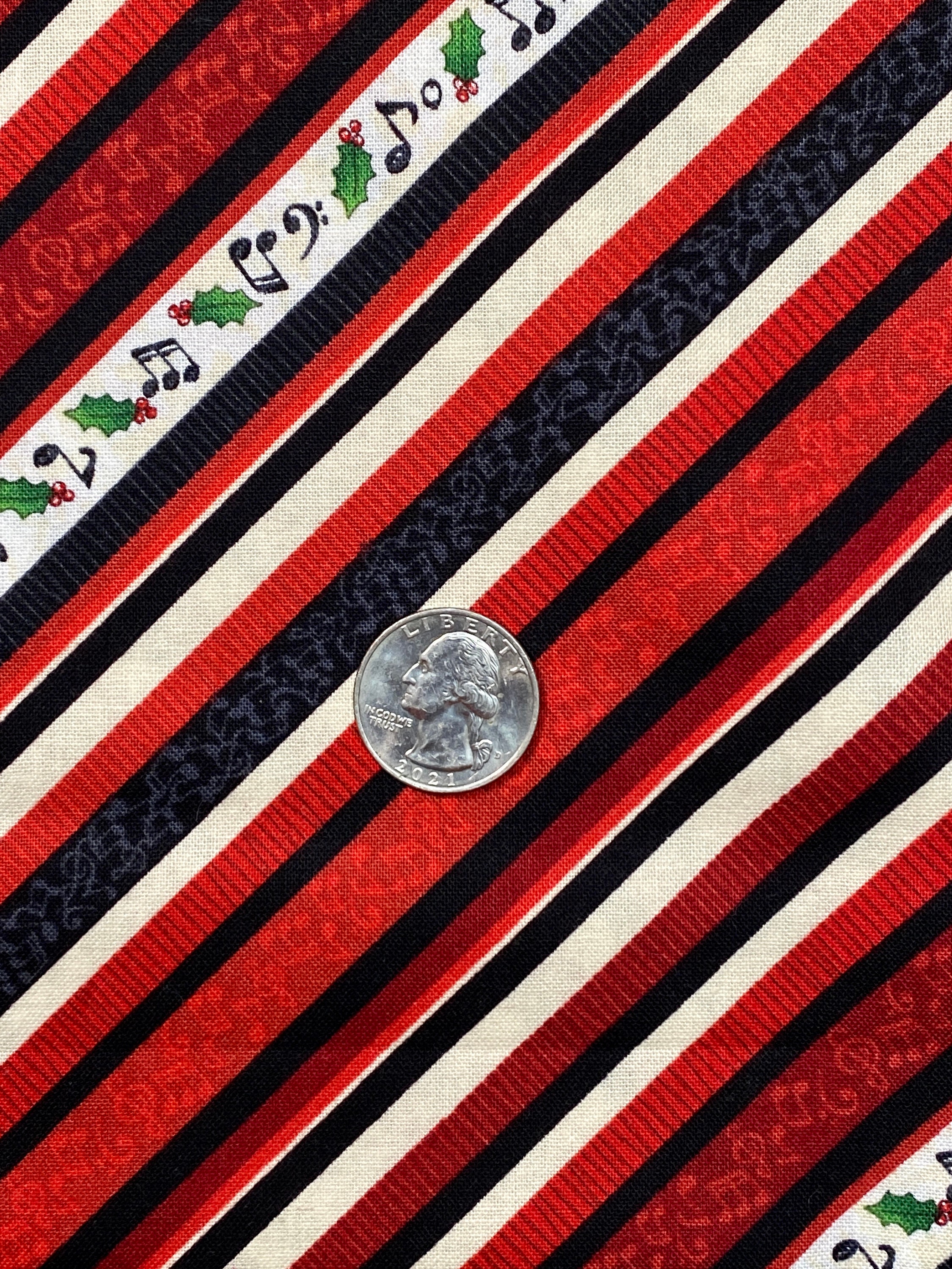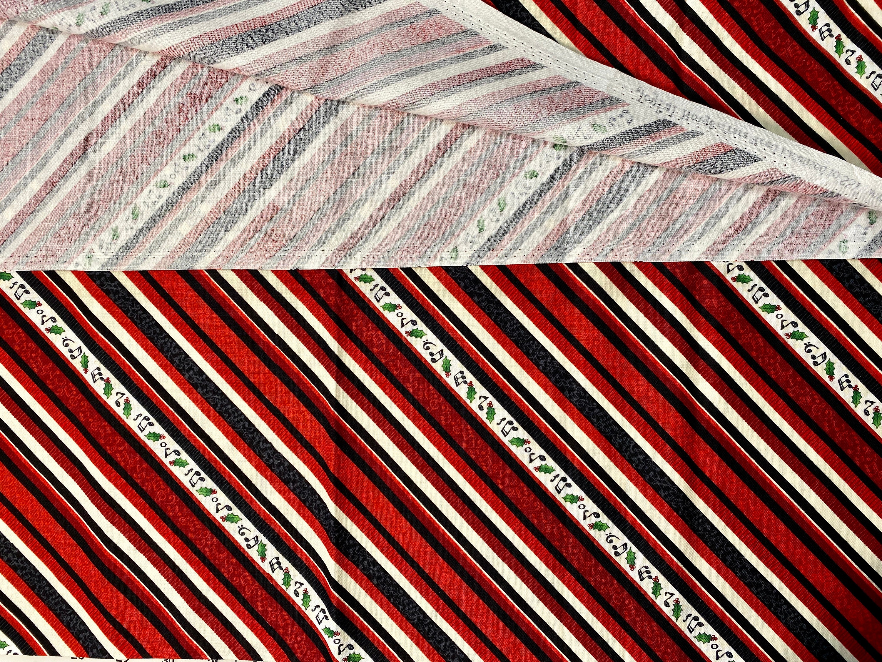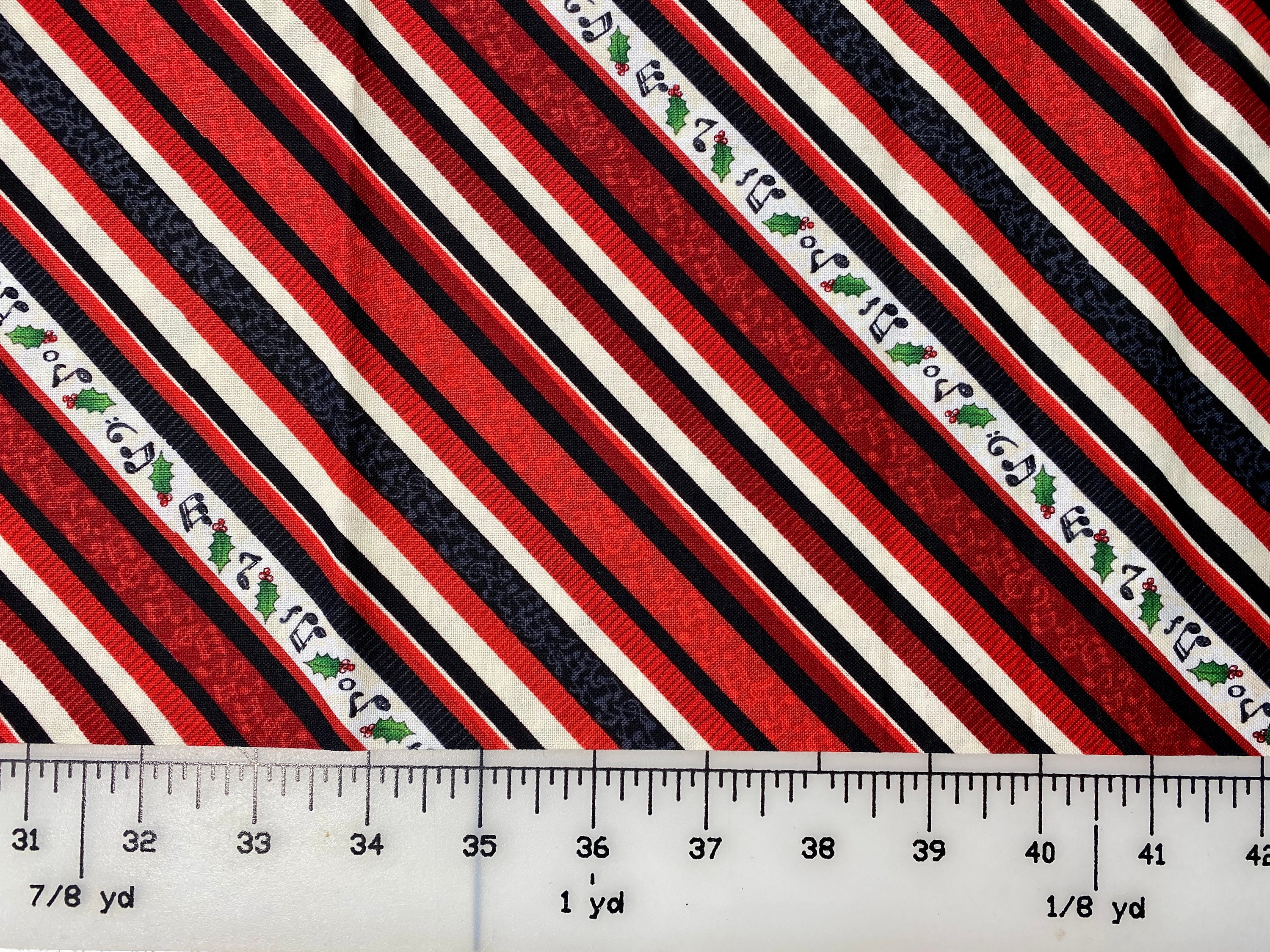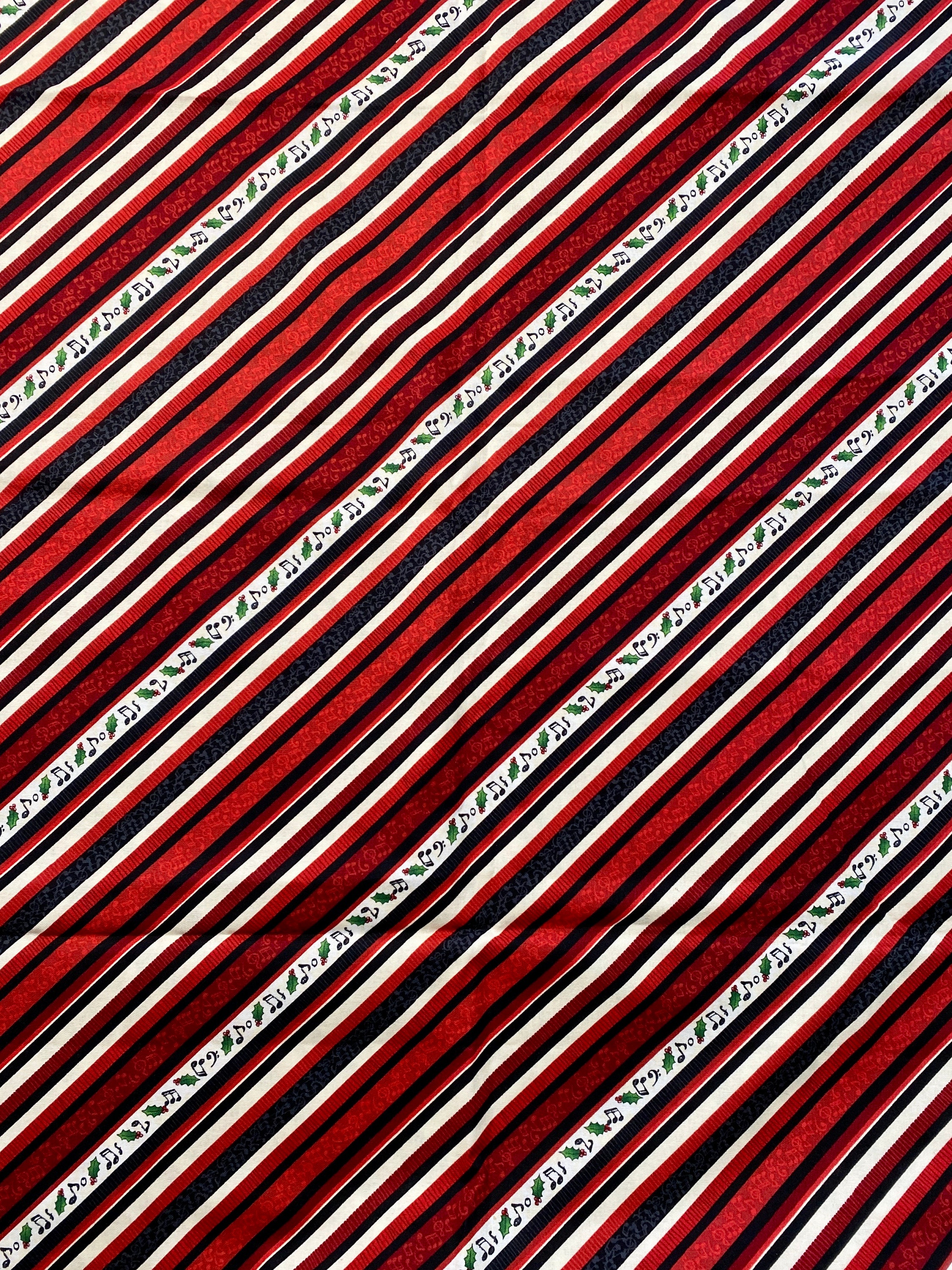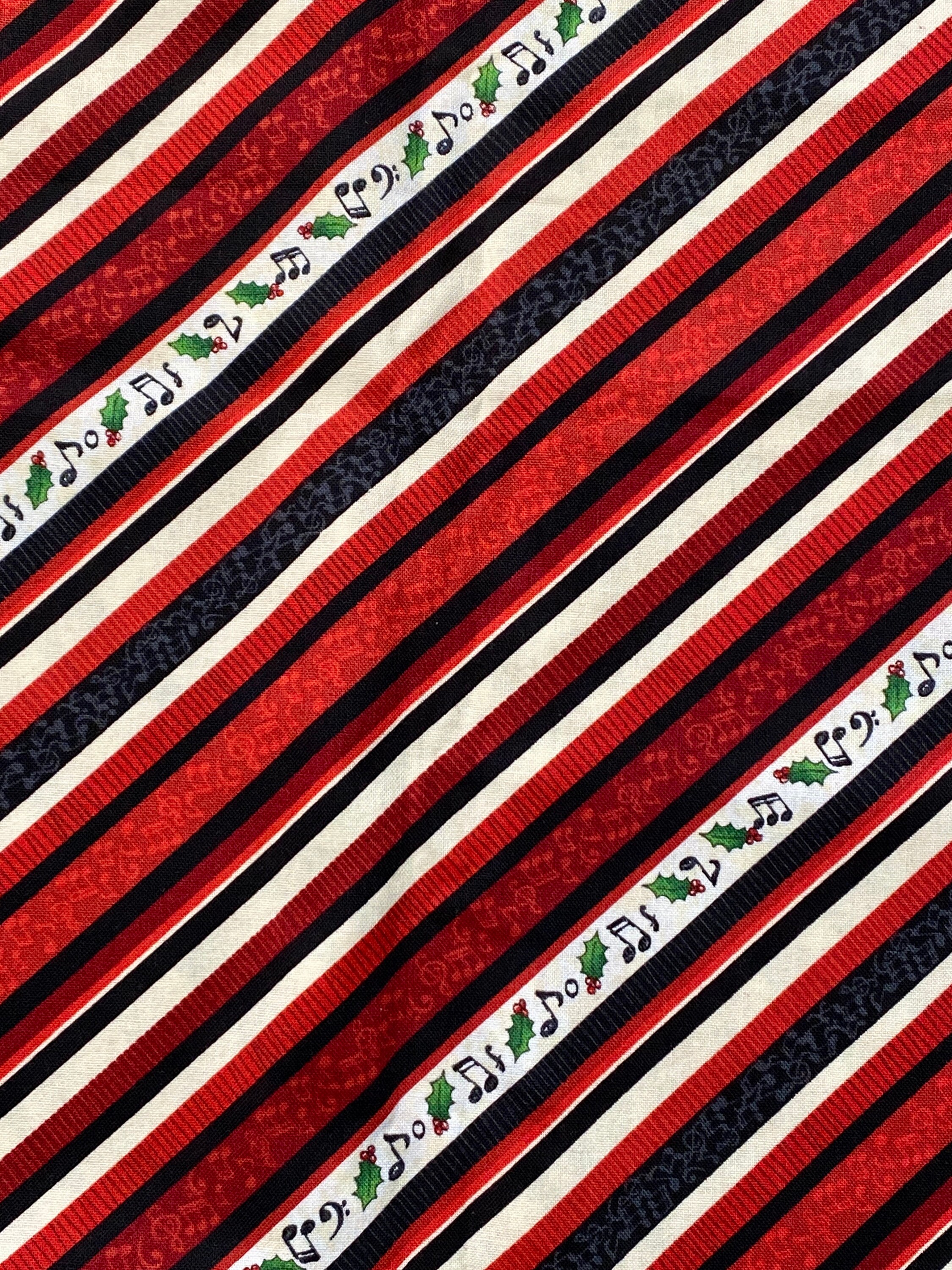 This is a really nice fabric with a sophisticated palate of colors. Diagonal stripes of shades of burgundys, reds, black, cream & white. One of the black stripes has charcoal designs of musical notes, also a red & a burgundy stripe have notes in lighter shades of their color. The white stripe has musical notes, holly leaves & cream blotches (that's a technical term <G>).