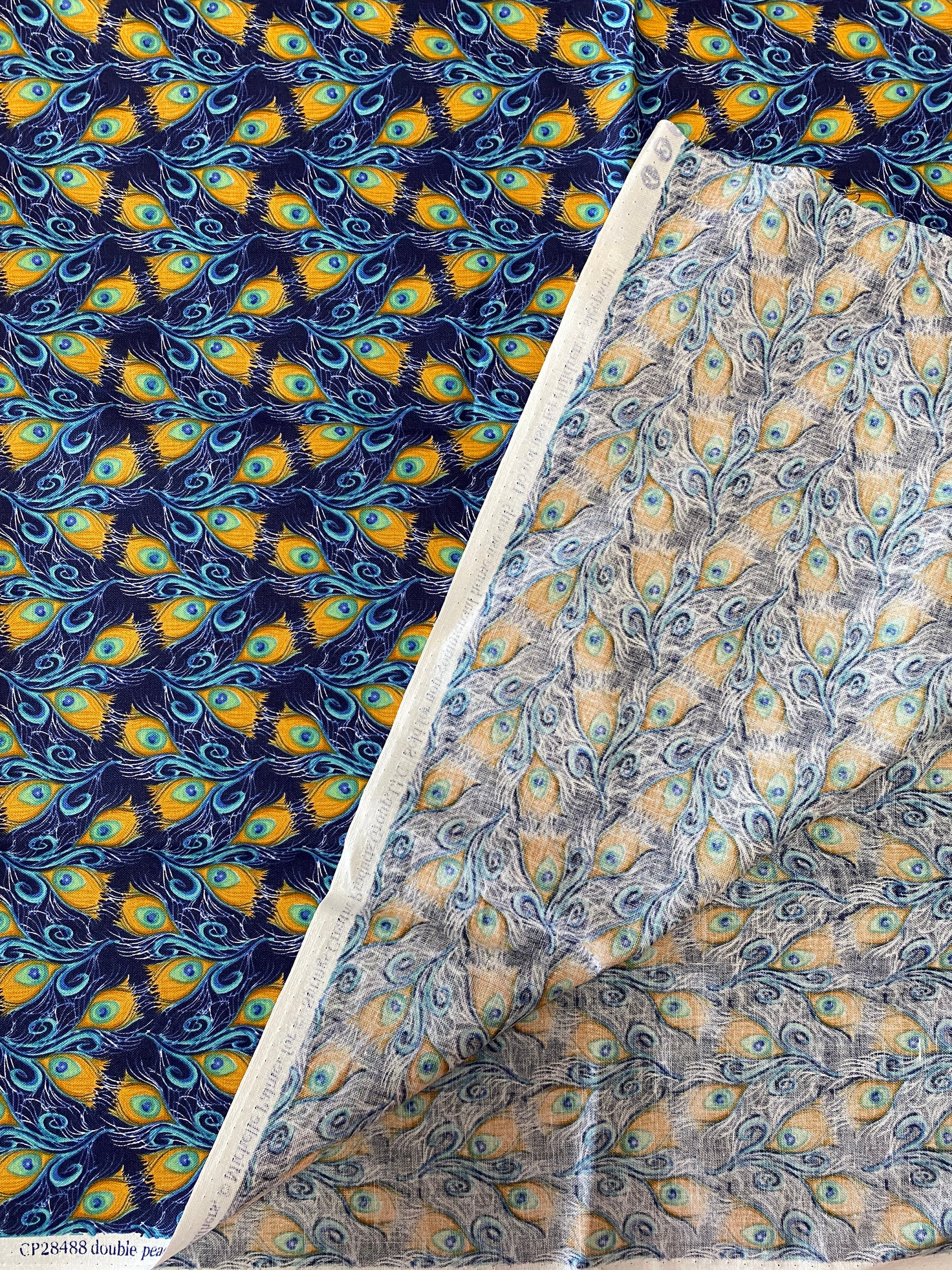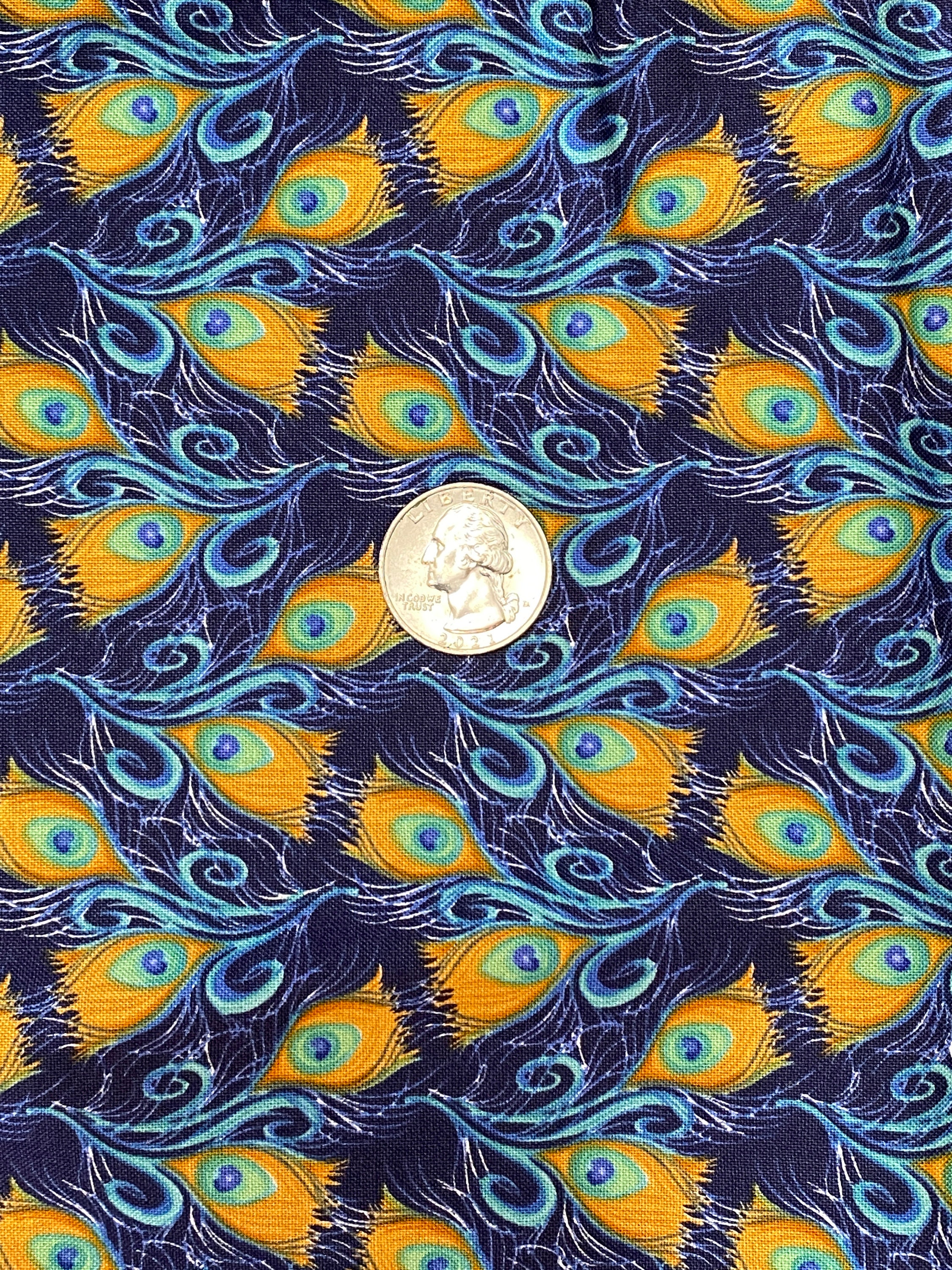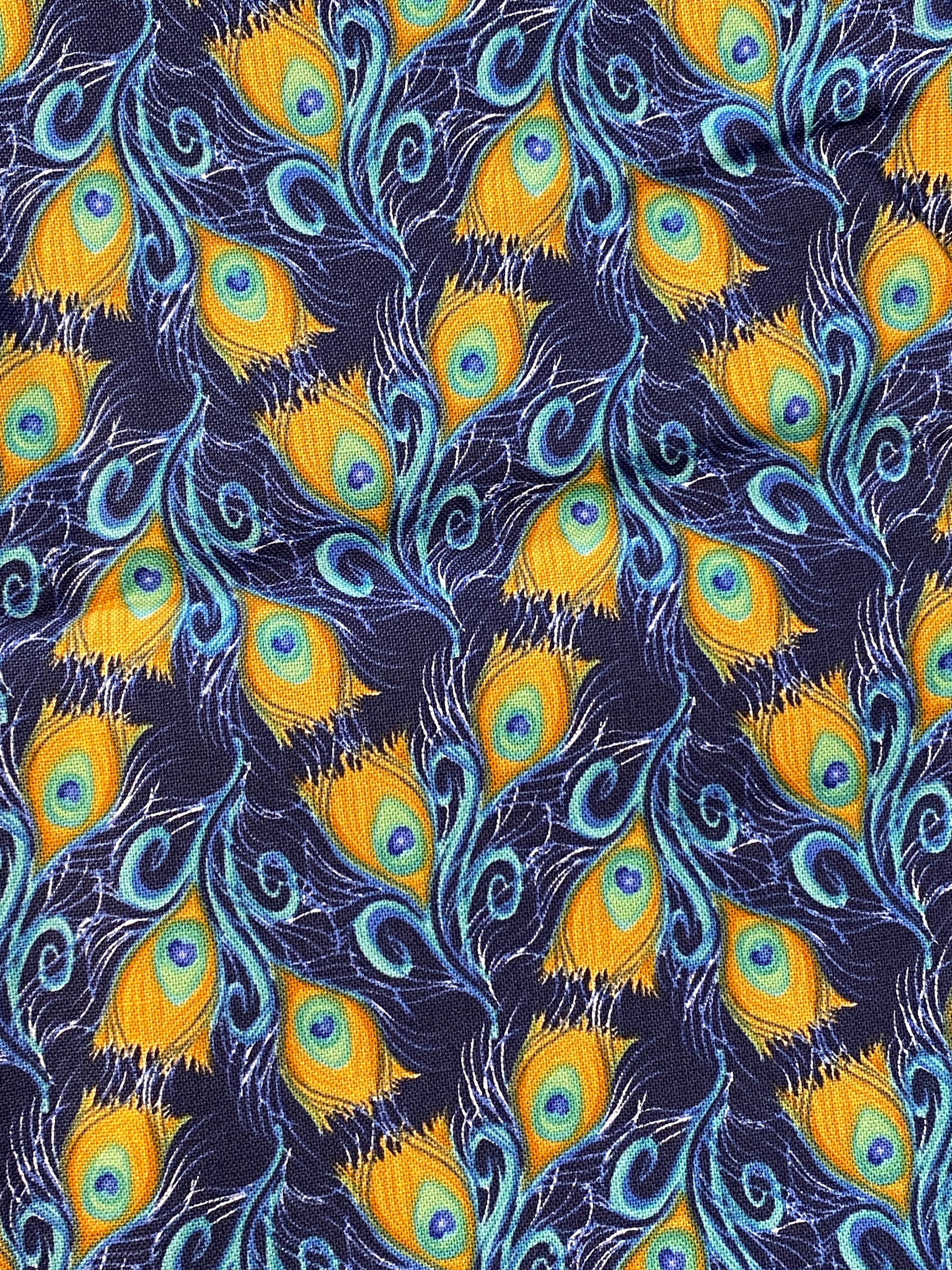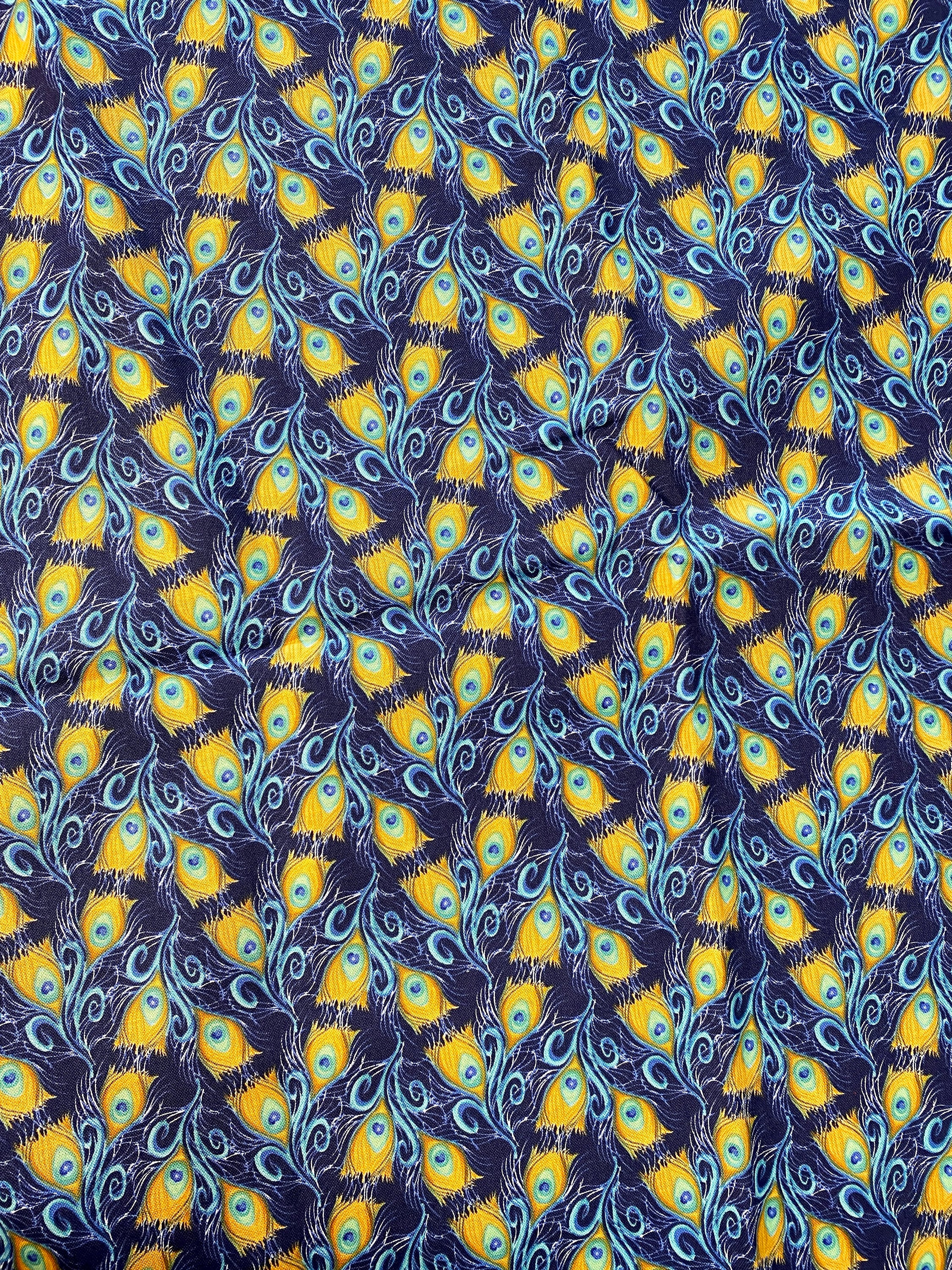 This is a nice cotton fabric with a navy background and stylized peacock feathers of oranges, greens & blues. Use it for quilting or make totes, napkins, an apron or whatever you can think of.